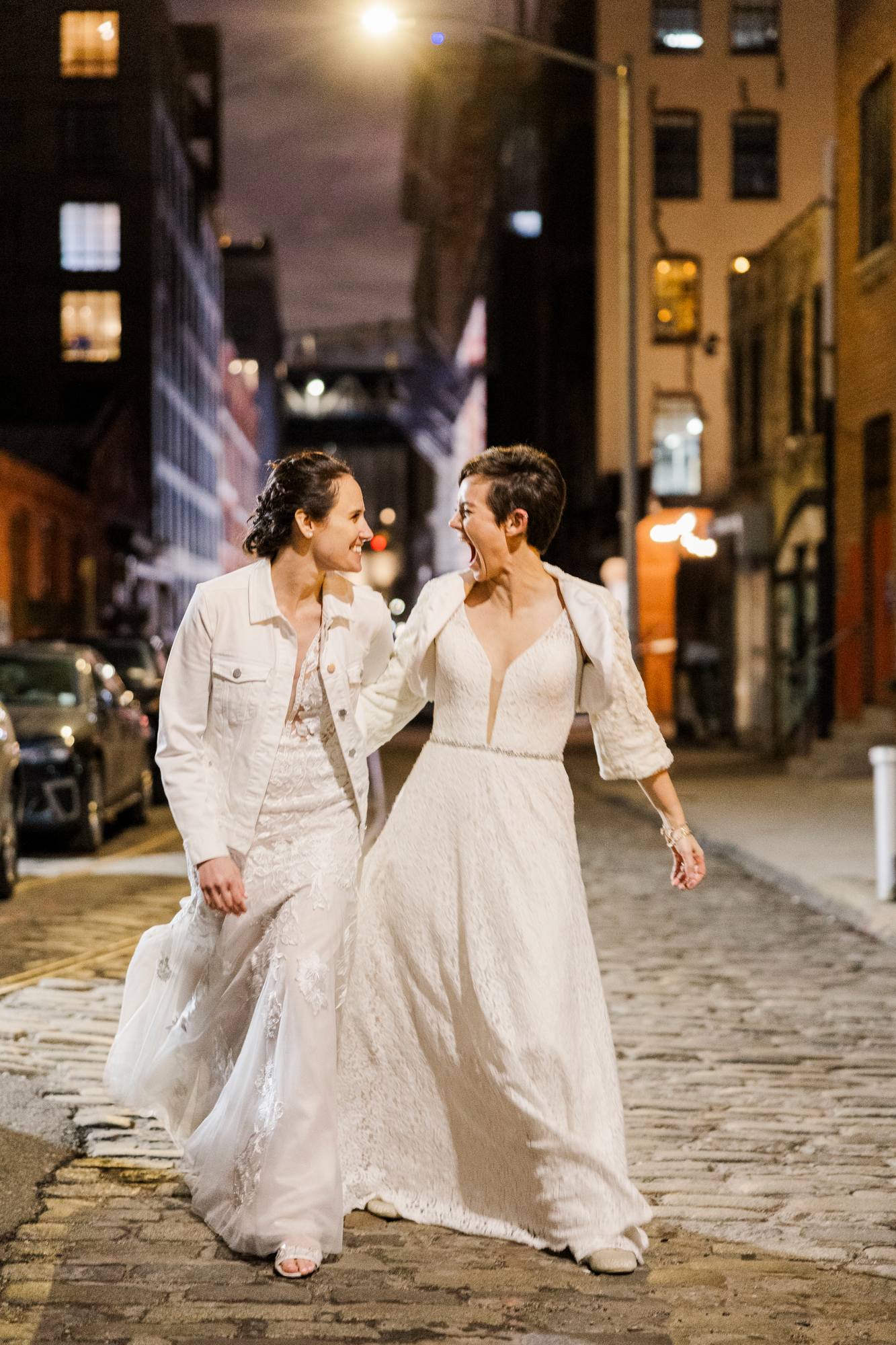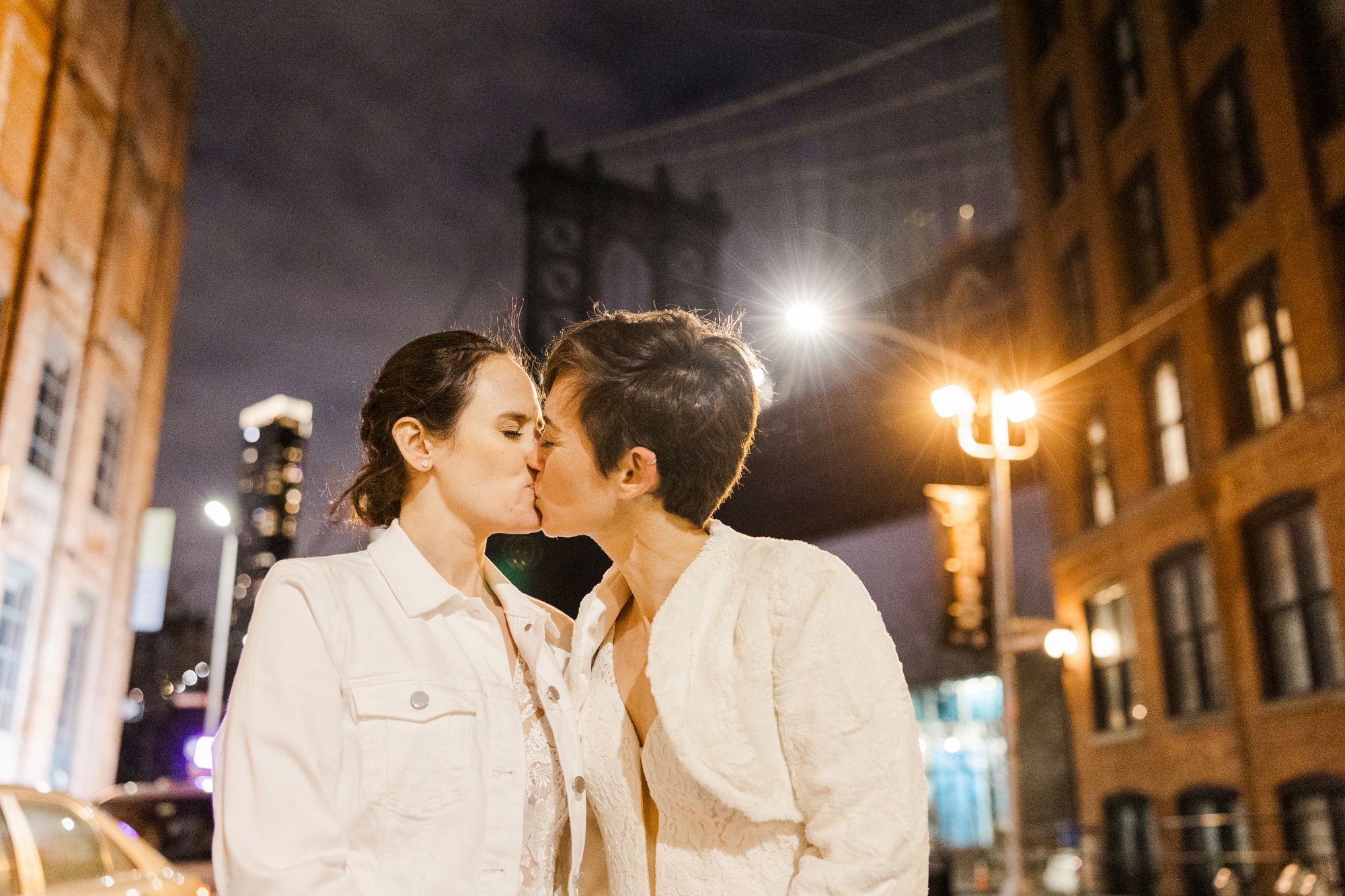 The ceremony was ultra-personal and featured adoring vows from Laura and Rebecca. Their ceremony was filled with personal touches and made the guests laugh and cry. As a Hudson Valley wedding photo and video team, this rustic space felt right at home for us. There are so many great spots in DUMBO to take your portraits as well, which is what we did for this couple before and after ceremony.
