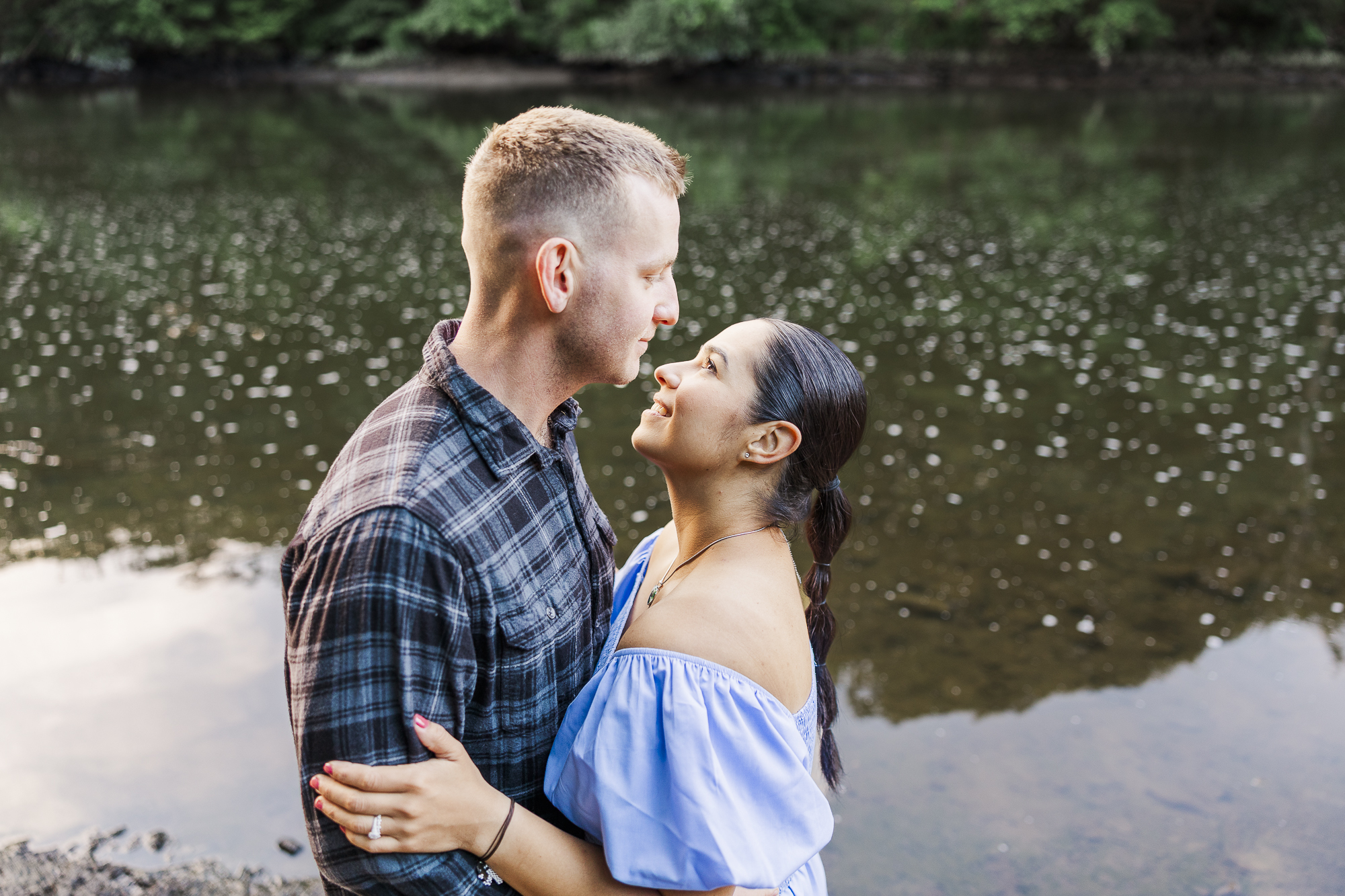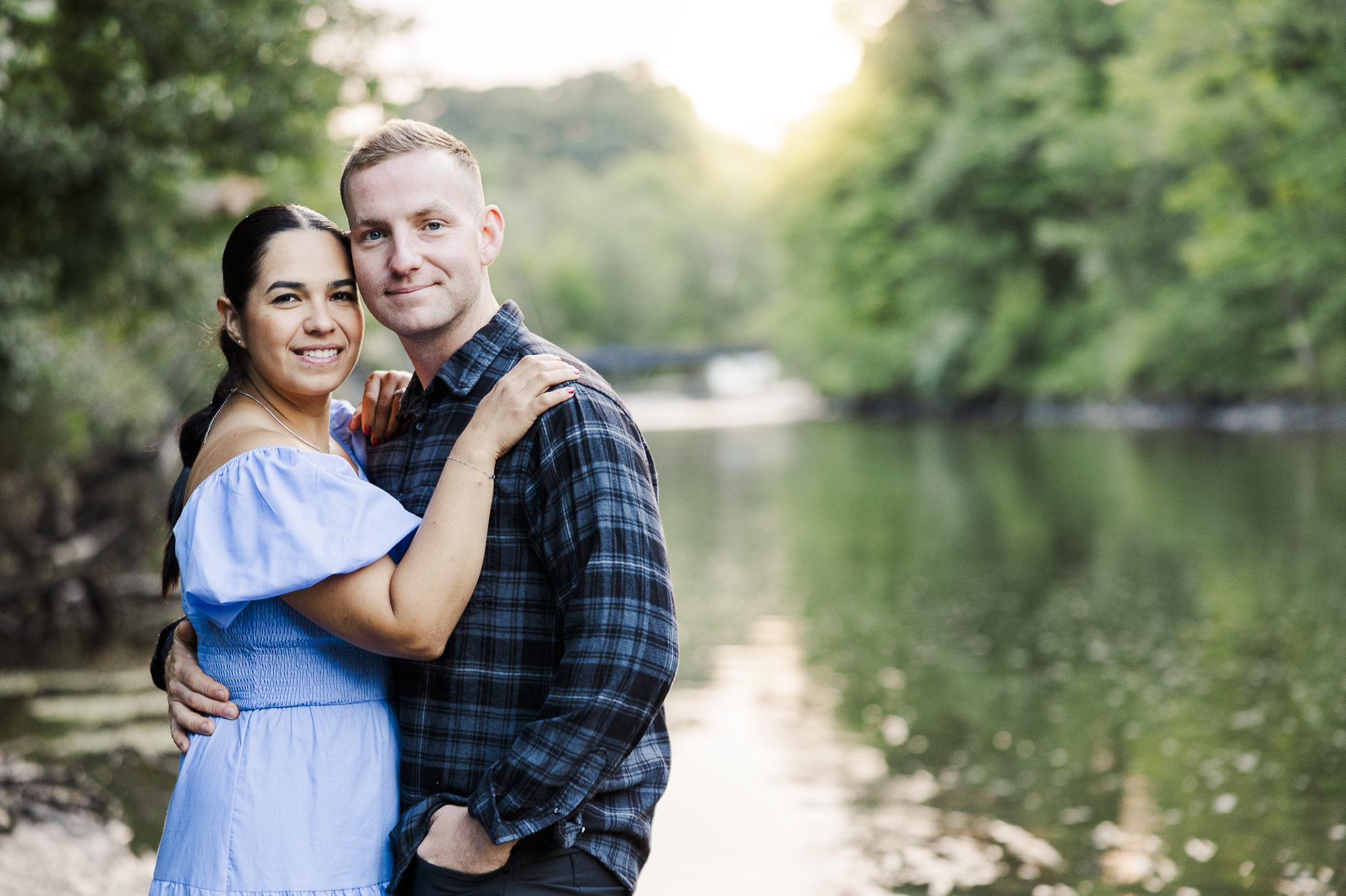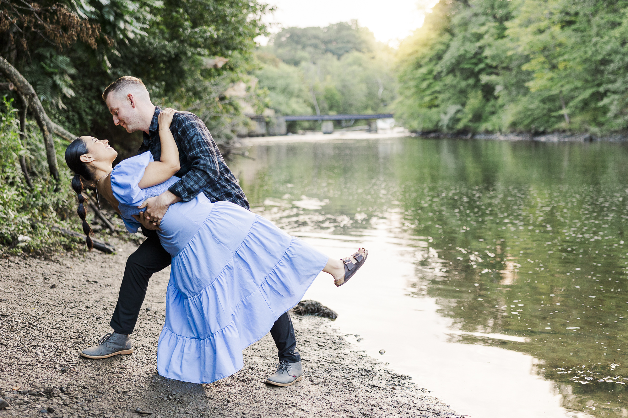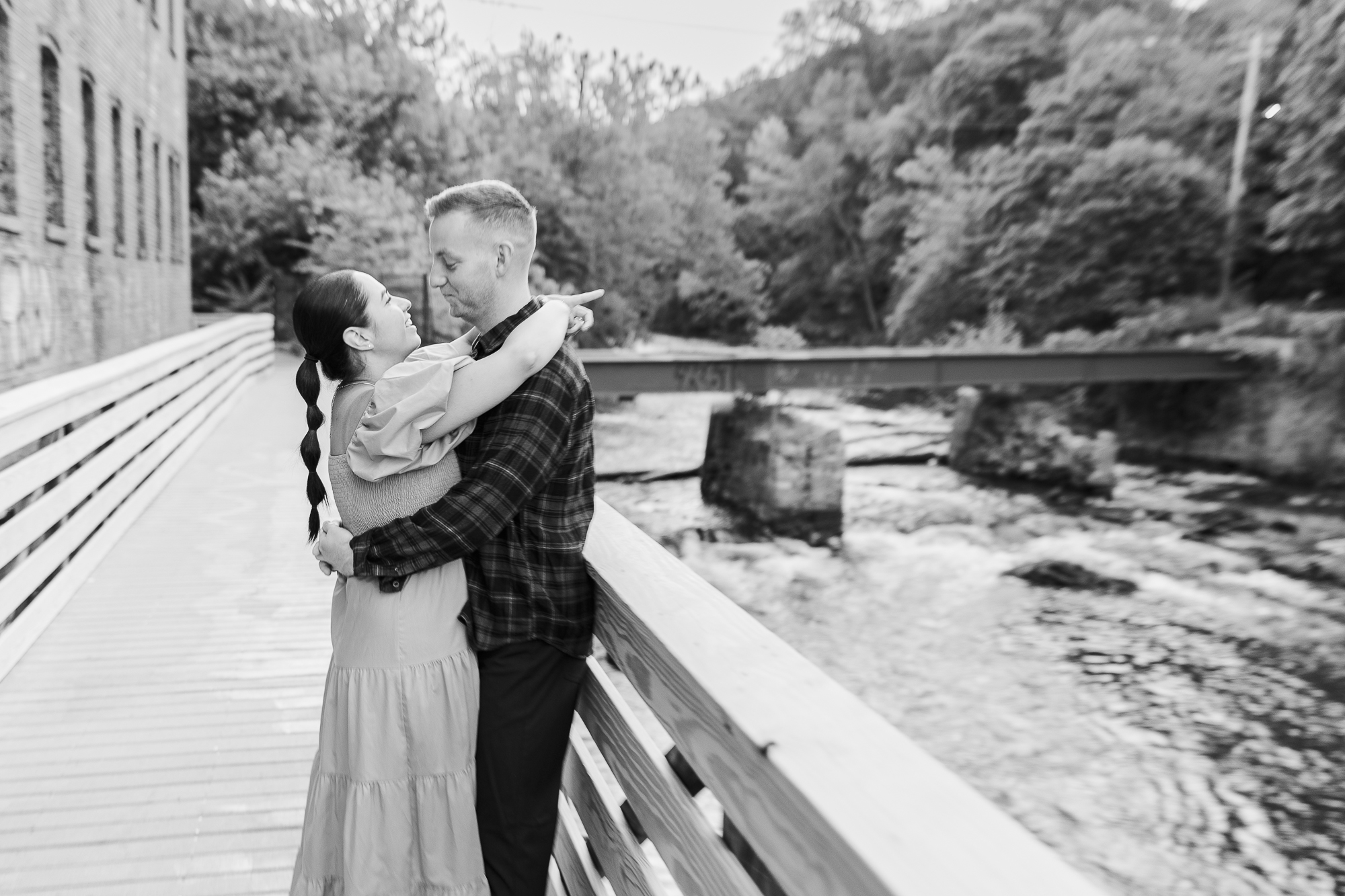 Natalia and Christopher’s Madam Brett Park engagement photos were taken on a lovely summer morning at sunrise. We love this intimate park for its mix of industrial architecture and natural landscapes. There are beautiful views of the rushing river and the building’s brickwork. As Hudson Valley wedding photographers, we love to capture intimate sessions like this one.