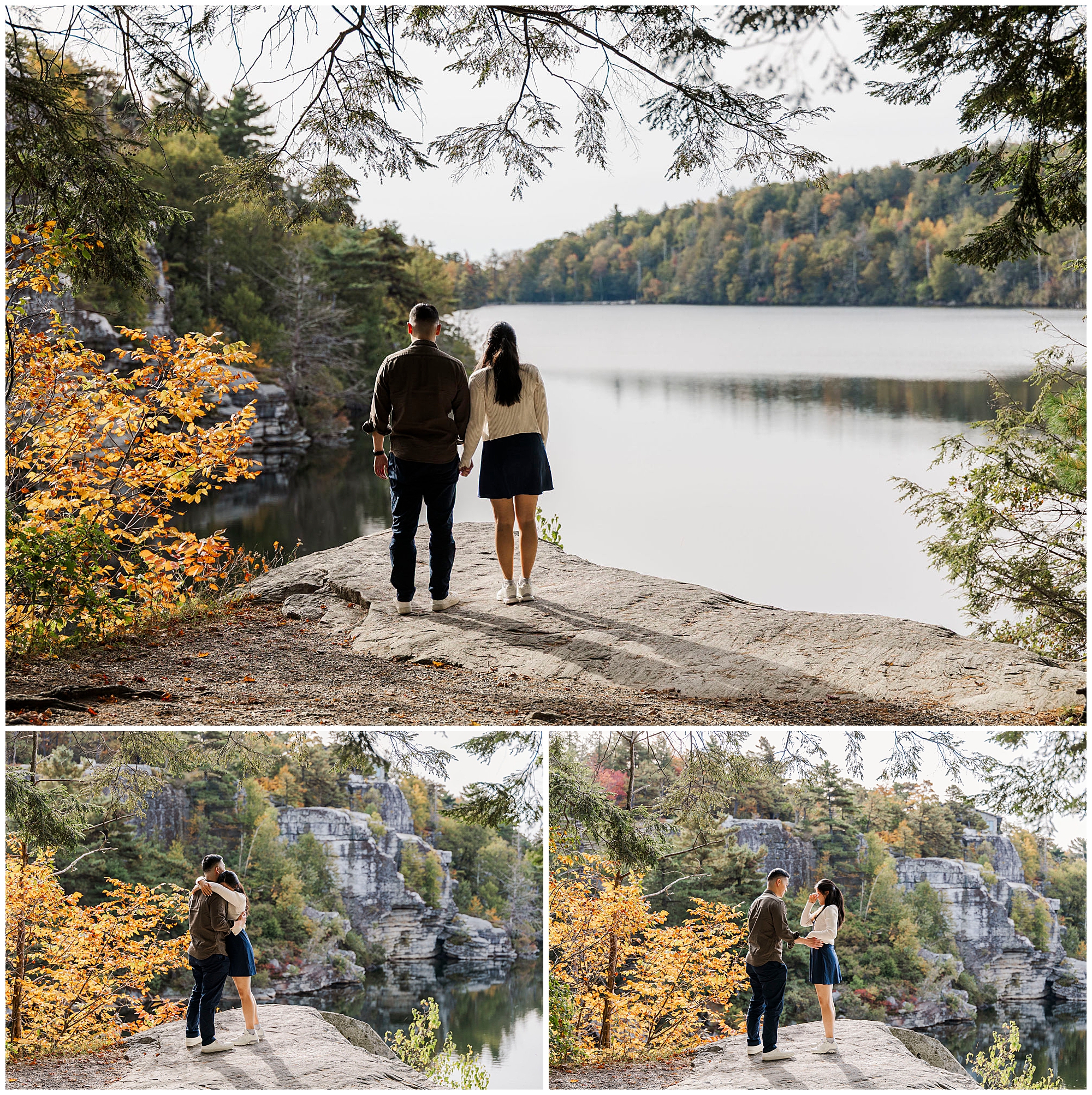 Jessica had no idea what was about to unfold, and that’s the magic of documenting proposals. The couple walked hand in hand toward the vantage point overlooking the water. This overlook sits only minutes from the Lake Minnewaska Visitor Center, which makes it easy to access while still feeling tucked away. As Beacon engagement photographers, we love guiding couples here because it creates effortless scenery without complicated logistics.