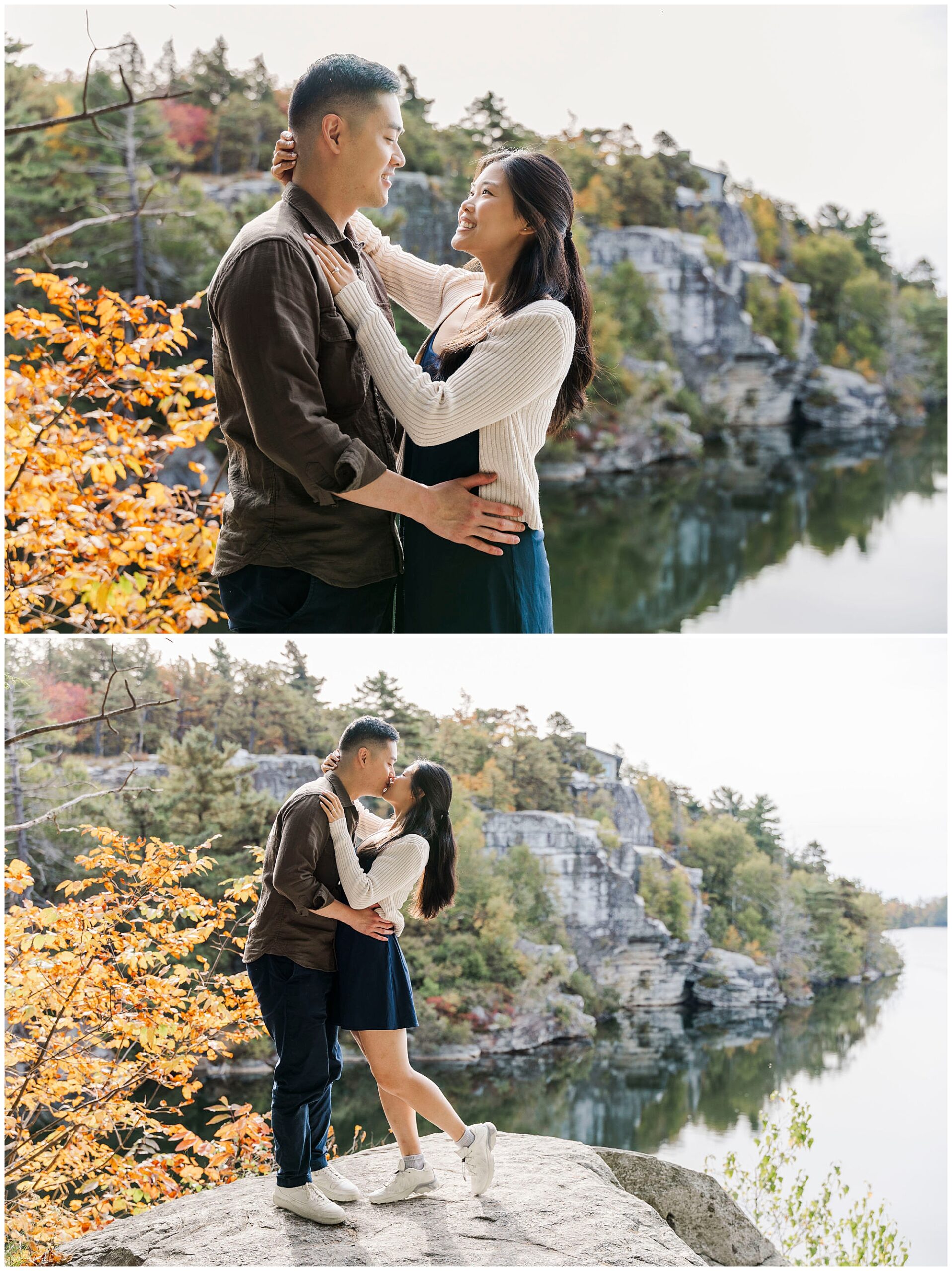 Once there, the view opens up across the water, creating the feeling of a grand stage. From this vantage point, you see the lake stretch wide beneath the surrounding cliffs. The changing leaves reflected across the surface, adding texture and warmth to every frame. Minnewaska State Park proposal photos benefit from this exact mix of light, color, and perspective.