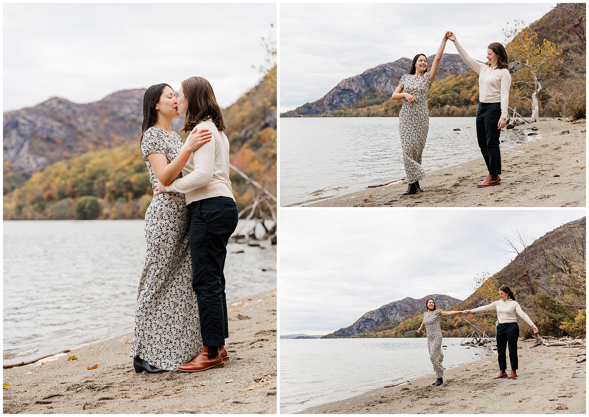 We finish the session down by the beach where the water meets the sand. The cool breeze off the Hudson feels refreshing as Daniele and Clara twirl, dance, and laugh together. The overcast sky creates a gentle reflection on the water, giving the whole scene a soft glow. This area is perfect for adding variety and ending the day with relaxed portraits by the river.
