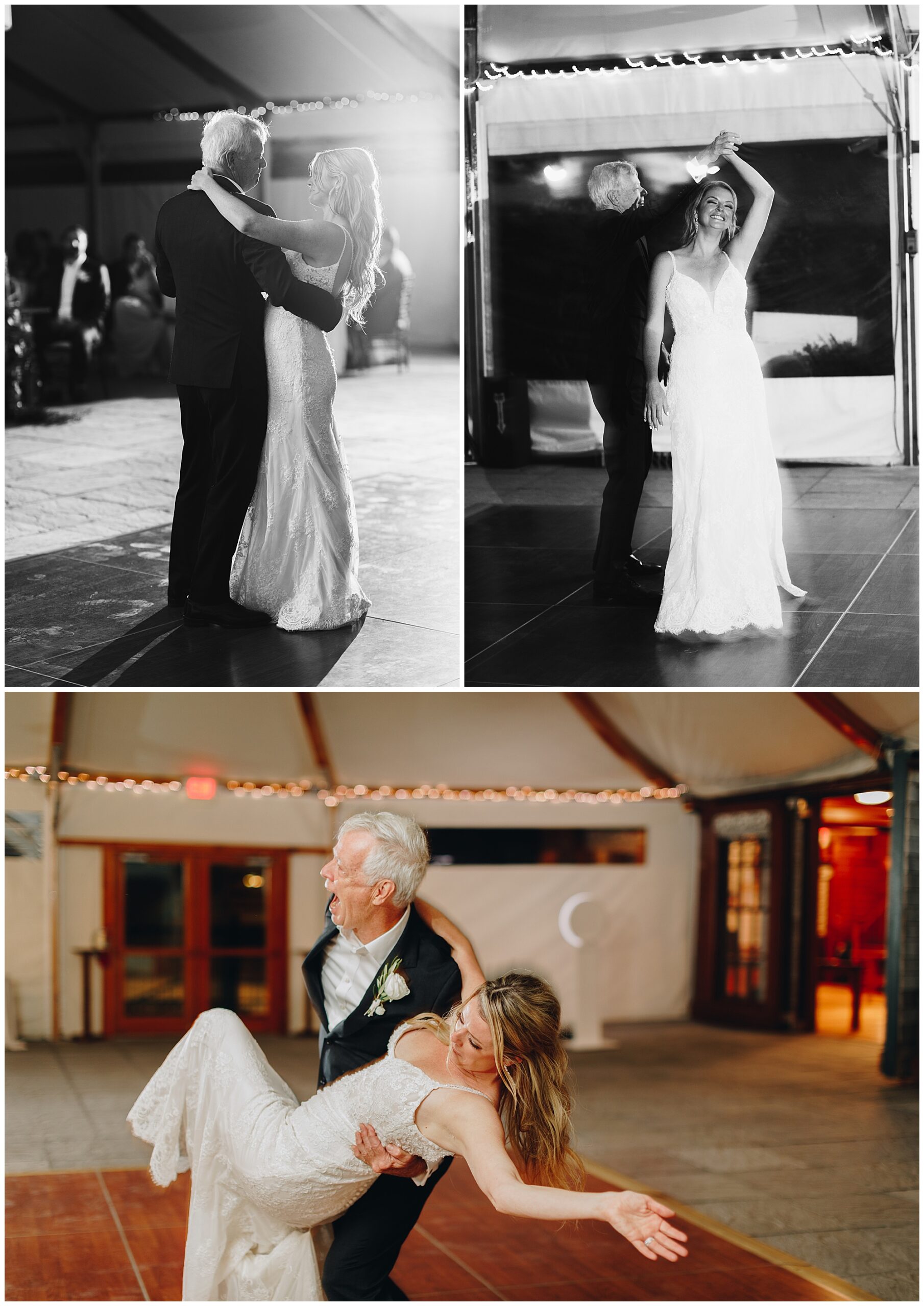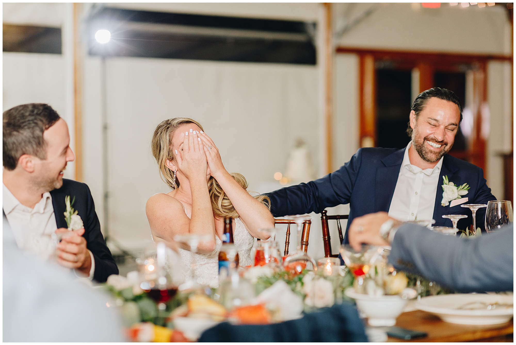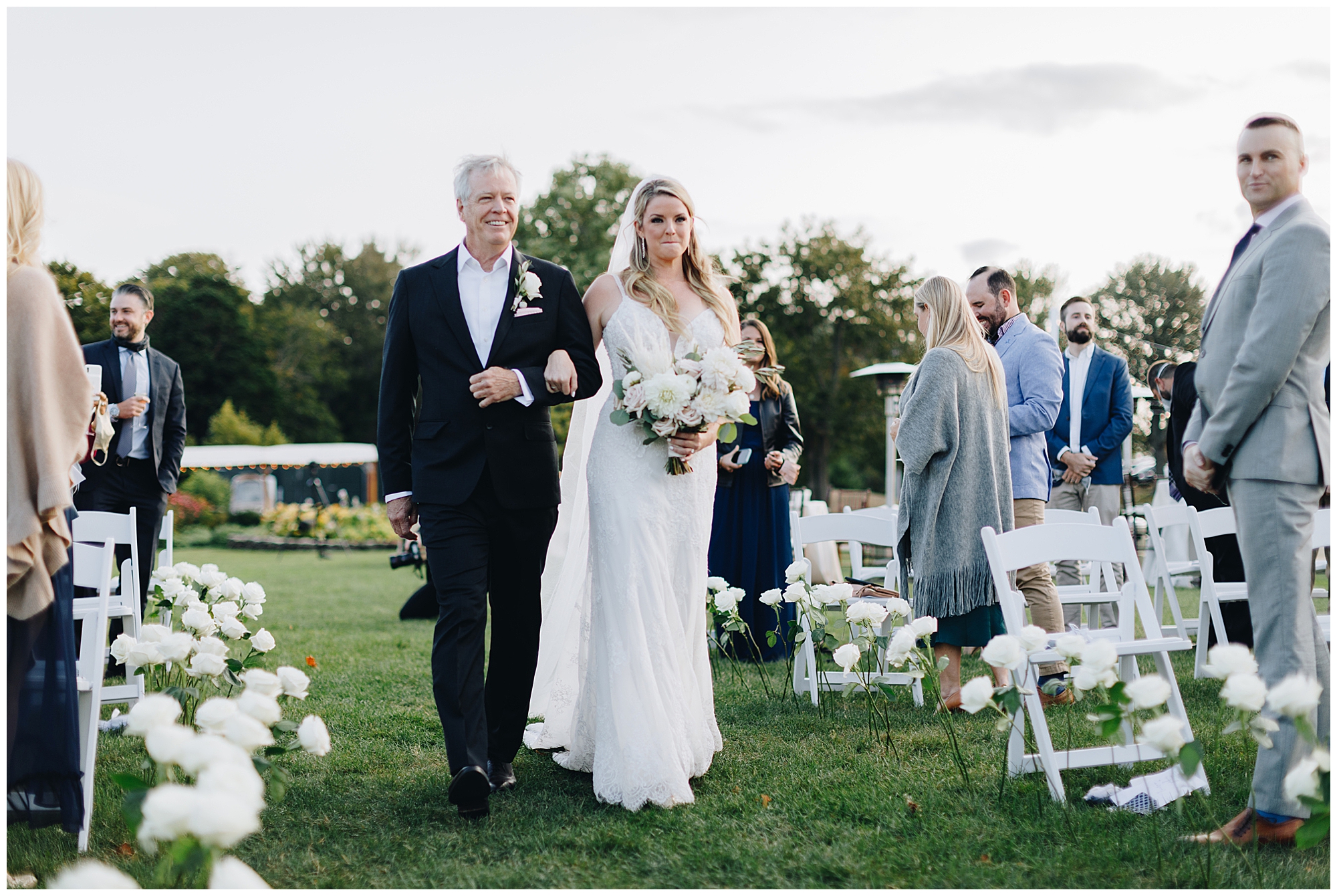 Ann Marie from Simply Styled Events perfectly coordinated the day’s transitions. The flow from ceremony to cocktail hour and into the tented reception was effortless. Guests sipped cocktails on the lawn while enjoying sweeping views of the Atlantic. When dinner began, the tent glowed under soft lighting, creating a cozy, celebratory atmosphere.