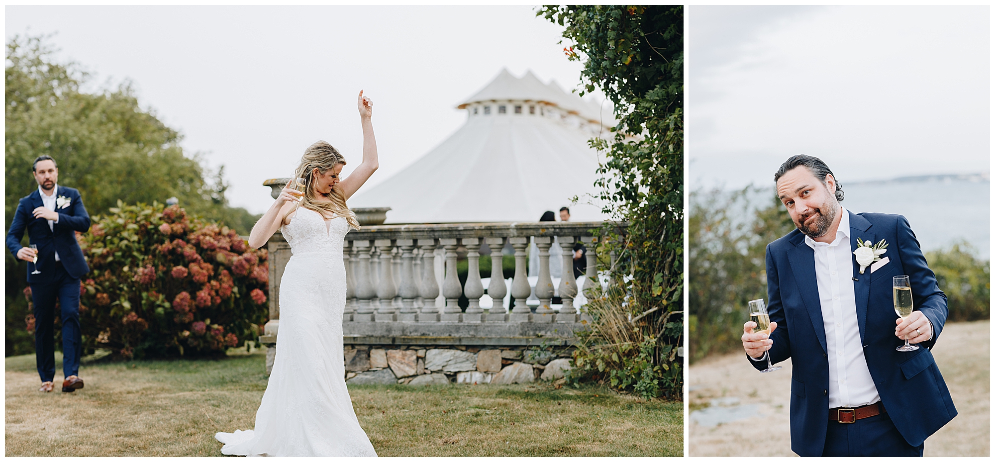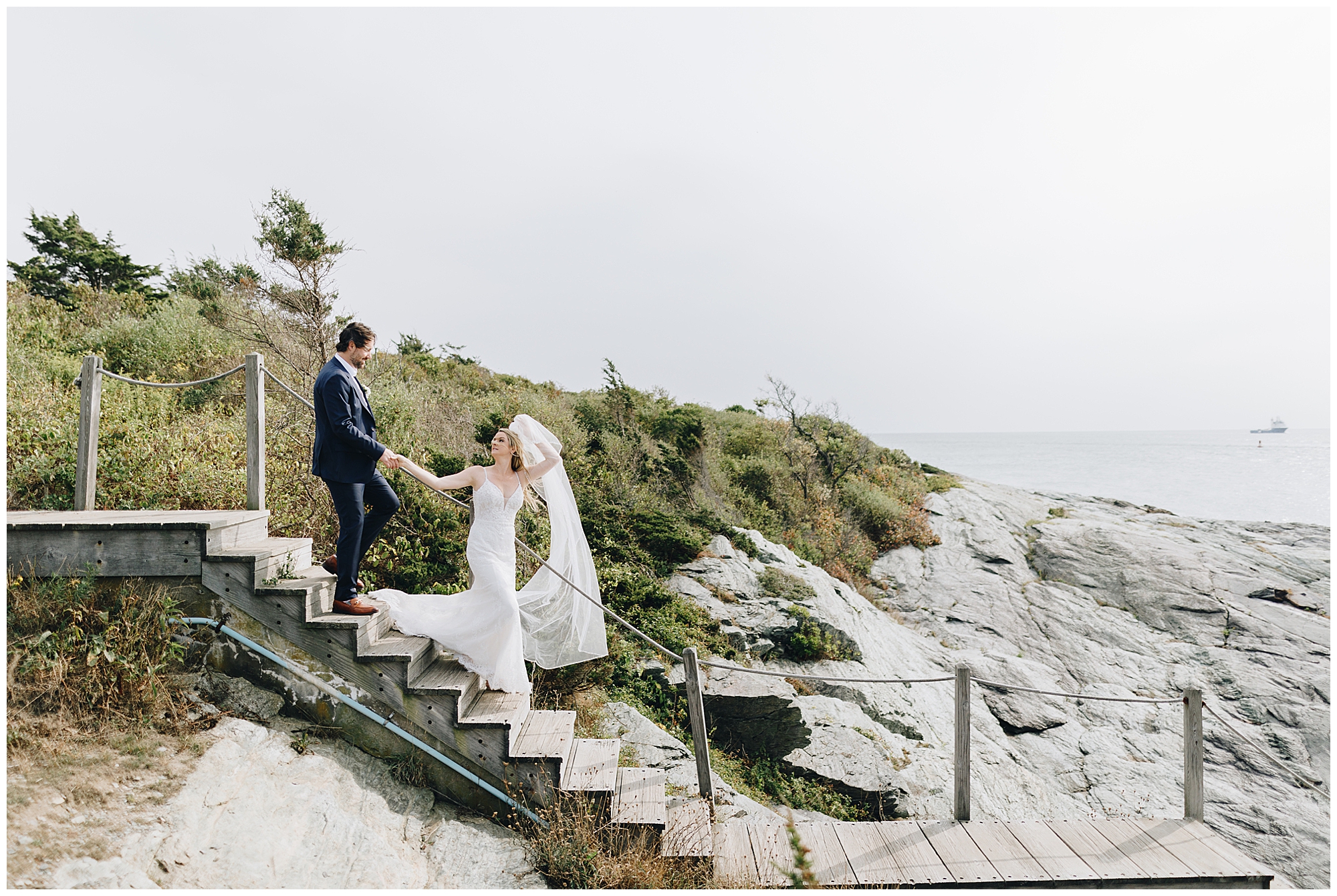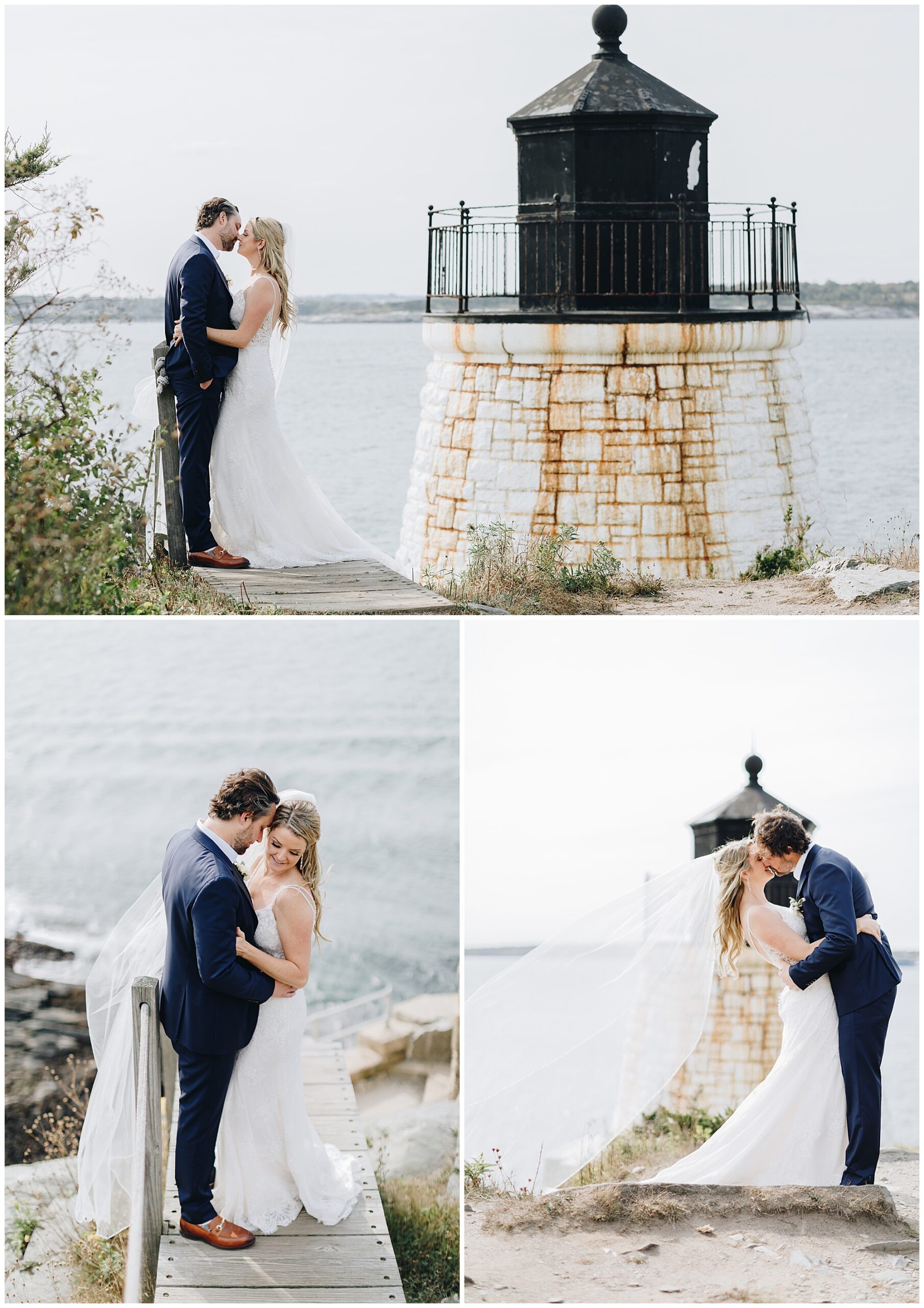 After their first look, we took a golf cart down the path to the iconic Castle Hill Lighthouse. With sweeping views of Narragansett Bay, it’s one of the most romantic spots for Newport wedding photos. The rocky coastline and panoramic horizon create a dramatic yet serene backdrop, especially during golden hour.