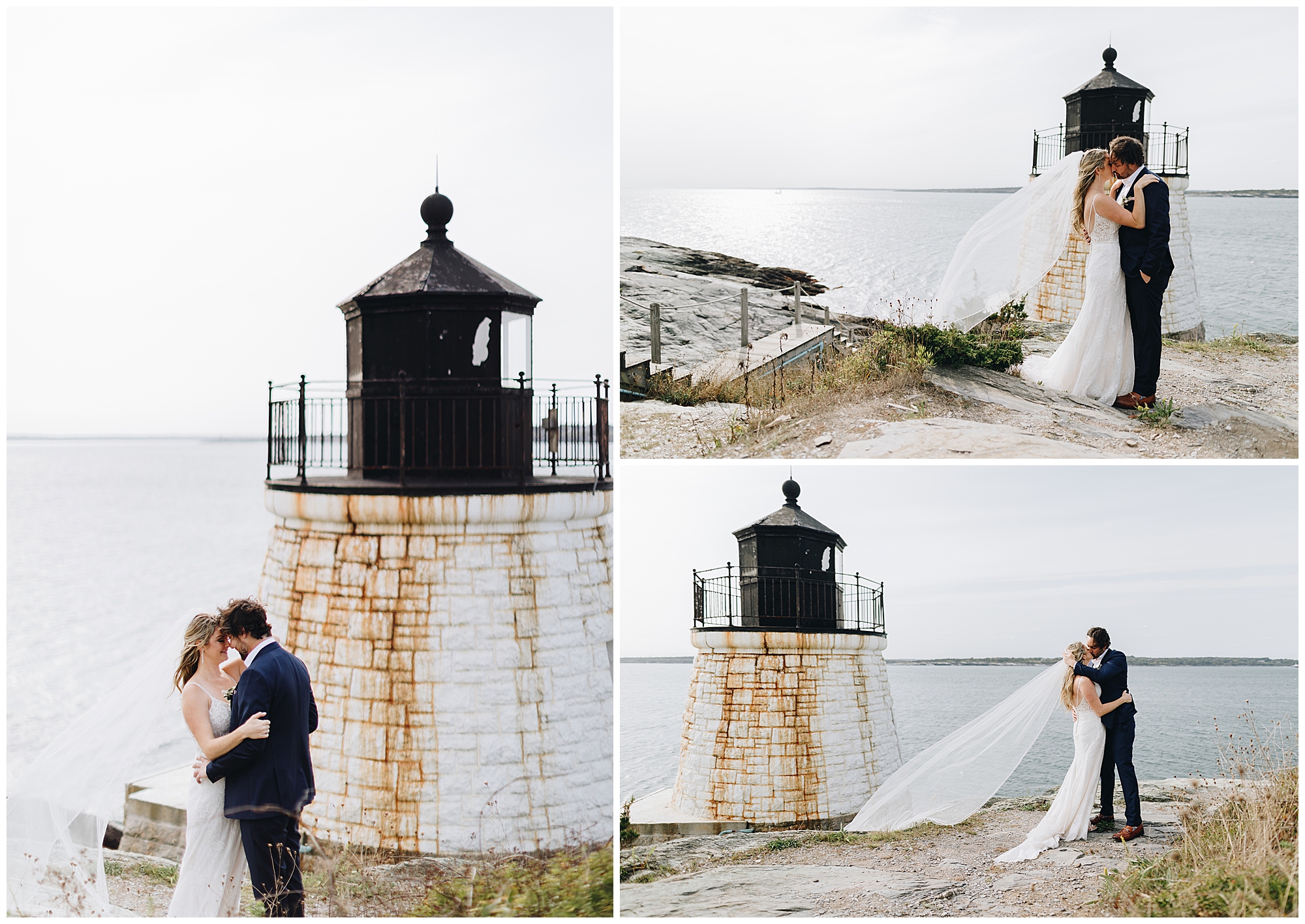 After their first look, we took a golf cart down the path to the iconic Castle Hill Lighthouse. With sweeping views of Narragansett Bay, it’s one of the most romantic spots for Newport wedding photos. The rocky coastline and panoramic horizon create a dramatic yet serene backdrop, especially during golden hour.