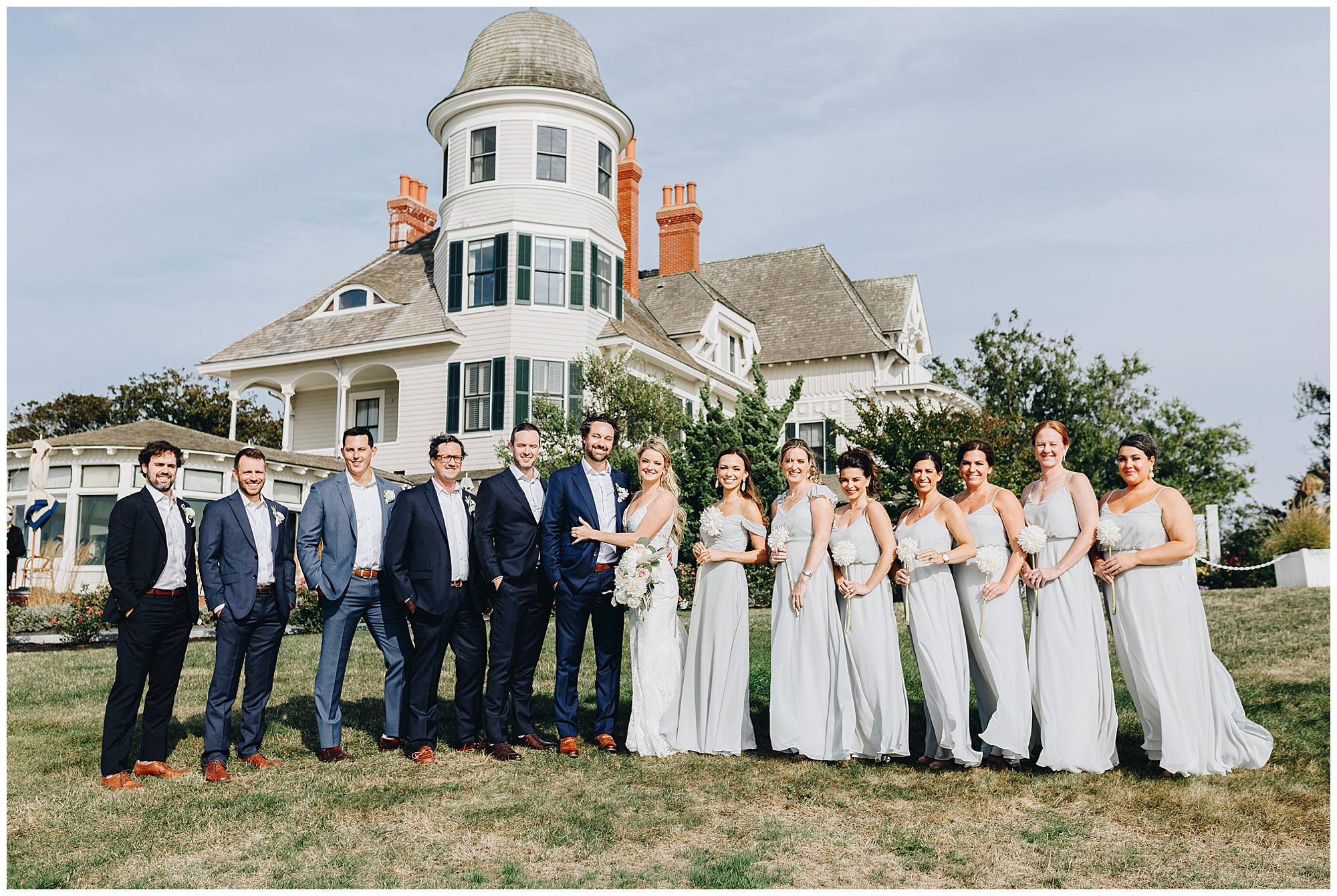 The main lawn at Castle Hill Inn was perfect for formal portraits. We gathered the wedding party and family in front of the stately main house, capturing timeless group photos with a classic Newport touch. The late-afternoon light added a golden glow that tied every photo together beautifully.