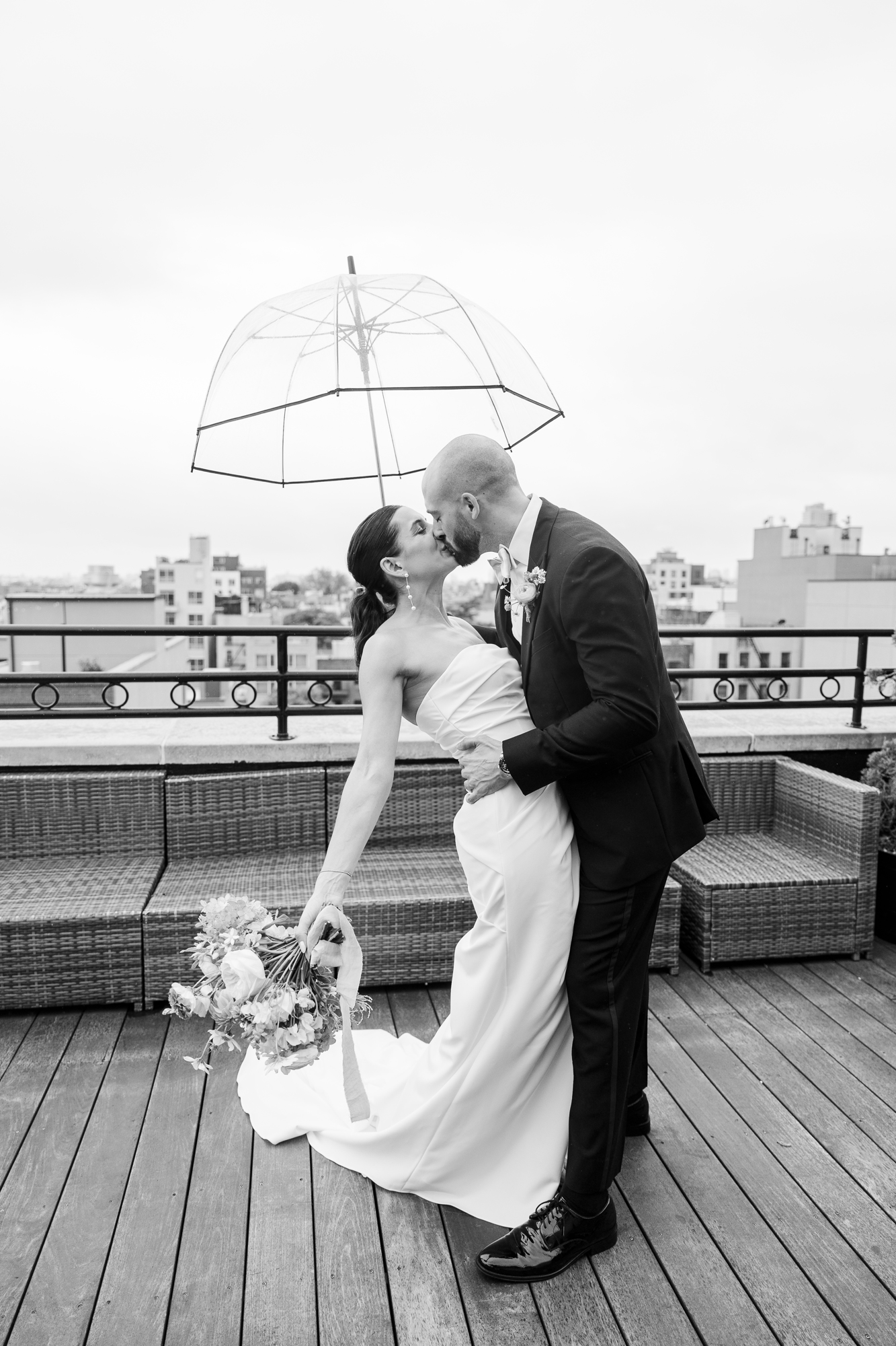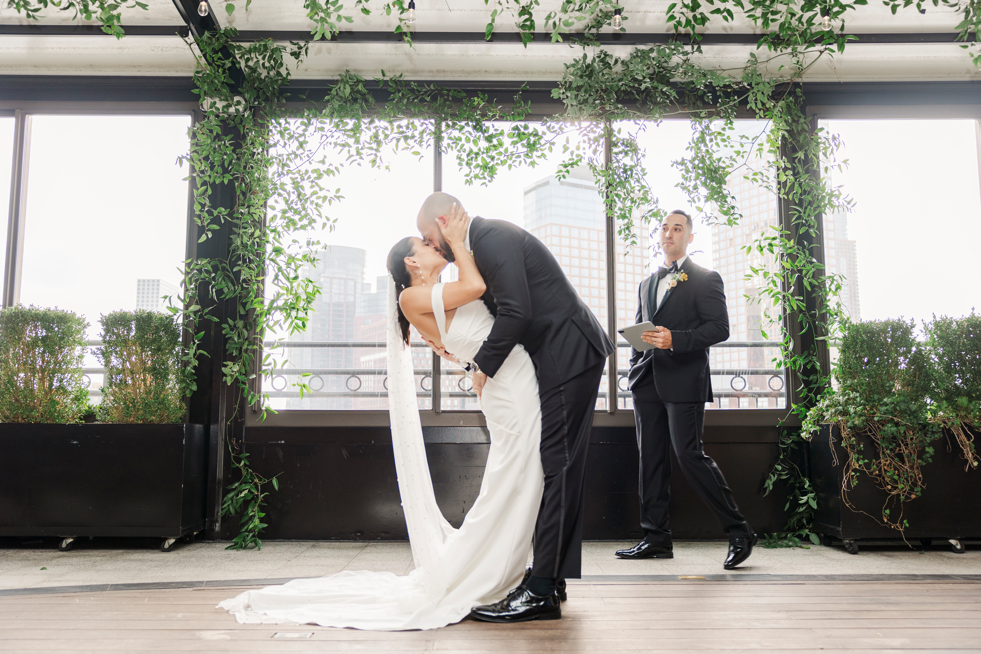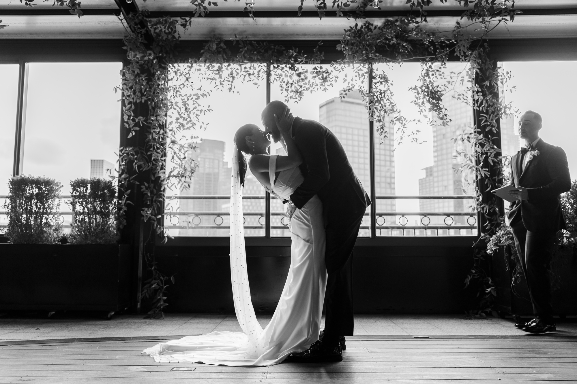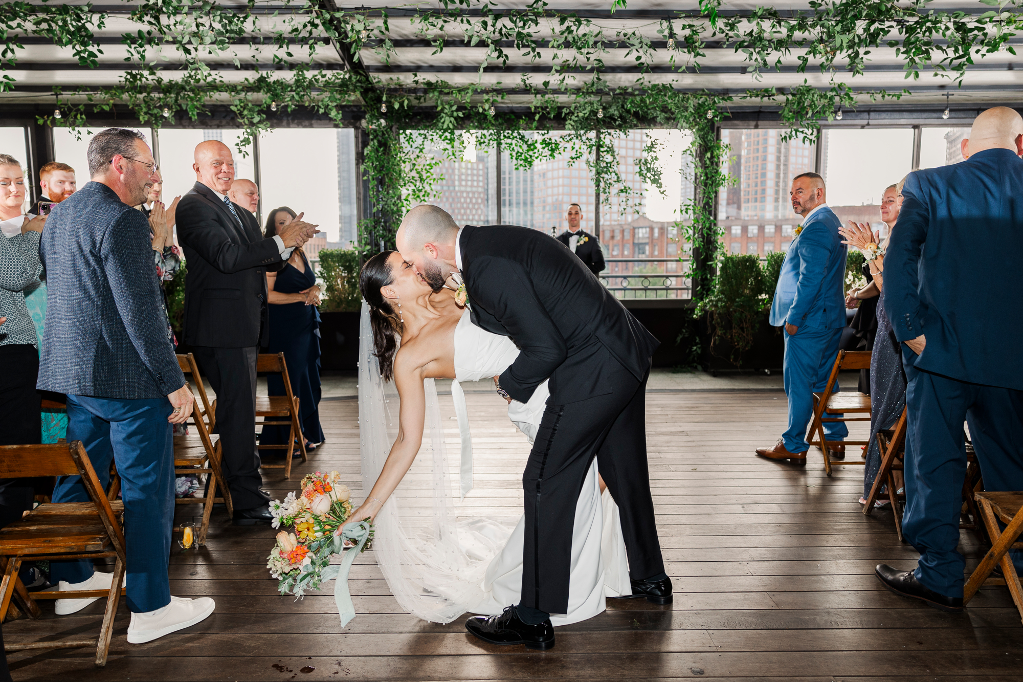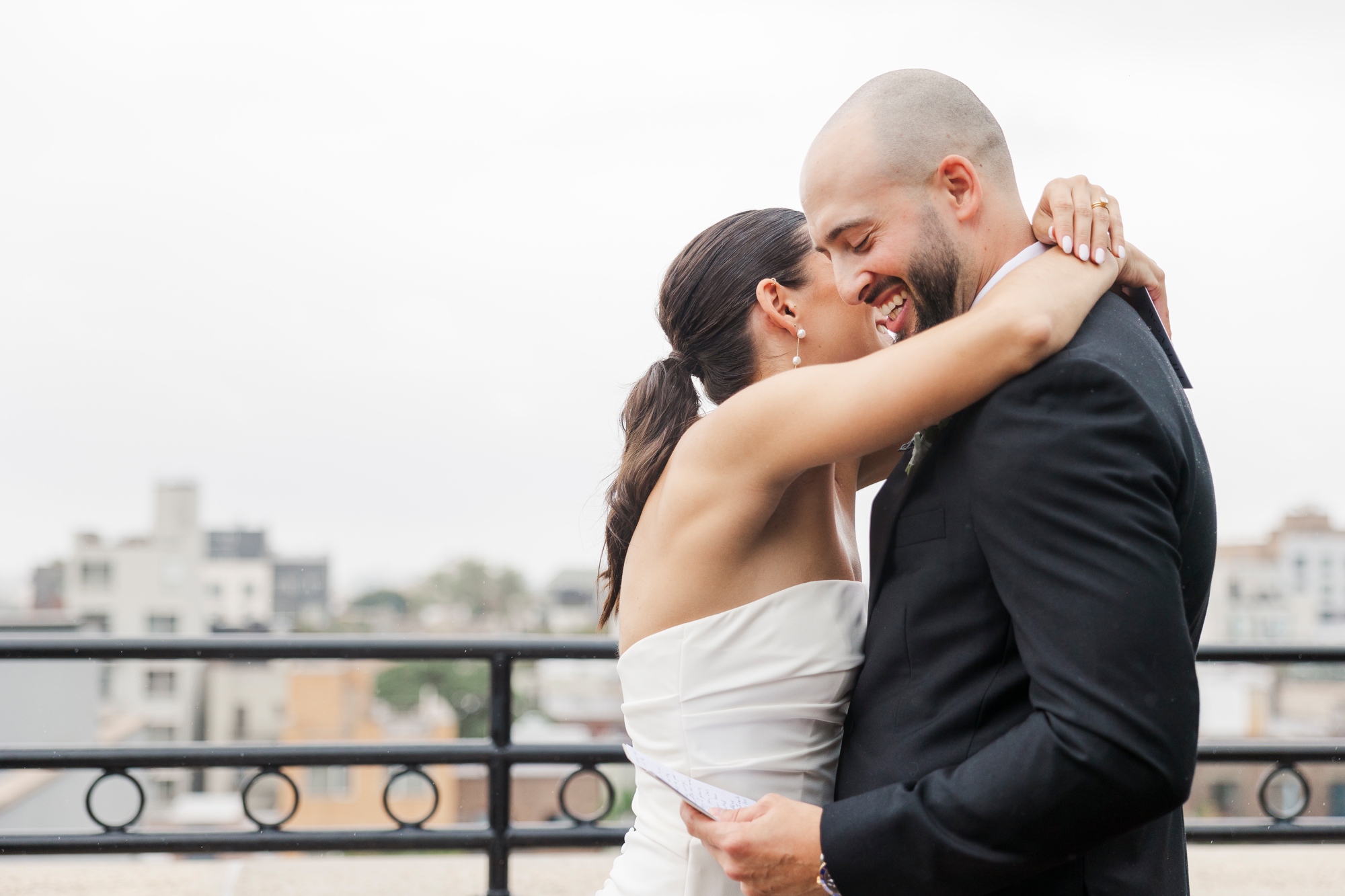 These Brooklyn wedding photos featured a closed rooftop for their hotel ceremony. It was raining on this day before the sun came out for cocktail hour. These two leaned in and enjoyed the cloudy weather as they said their vows to each other. The Box House Hotel rooftop was the perfect spot for their romantic ceremony surrounded by family and friends. This venue is great for couples who want a quintessential NYC celebration.