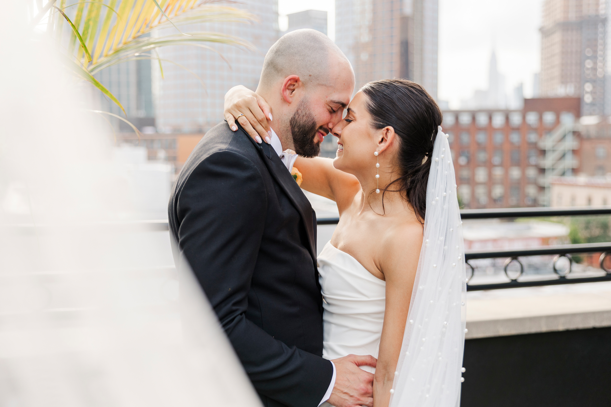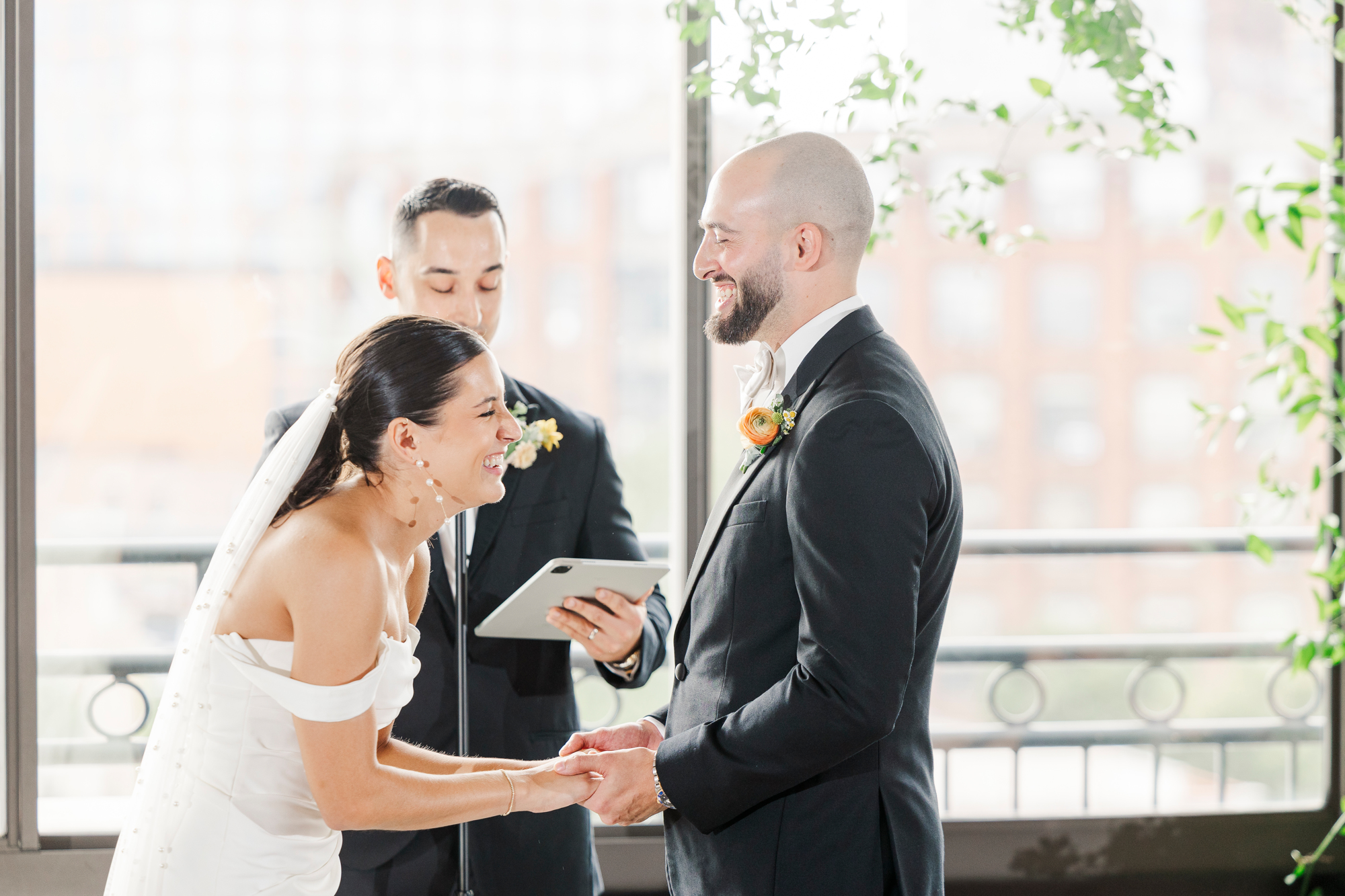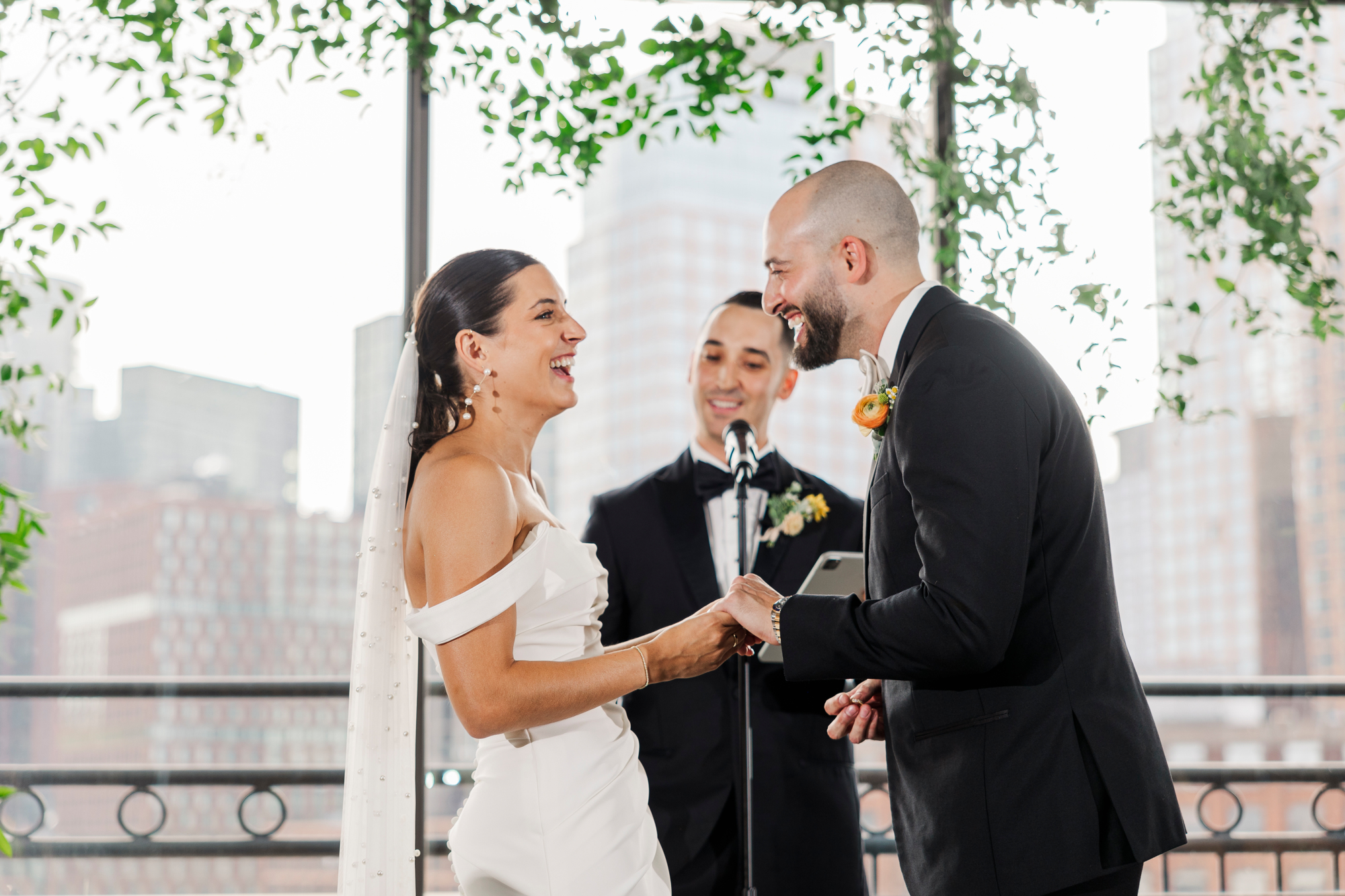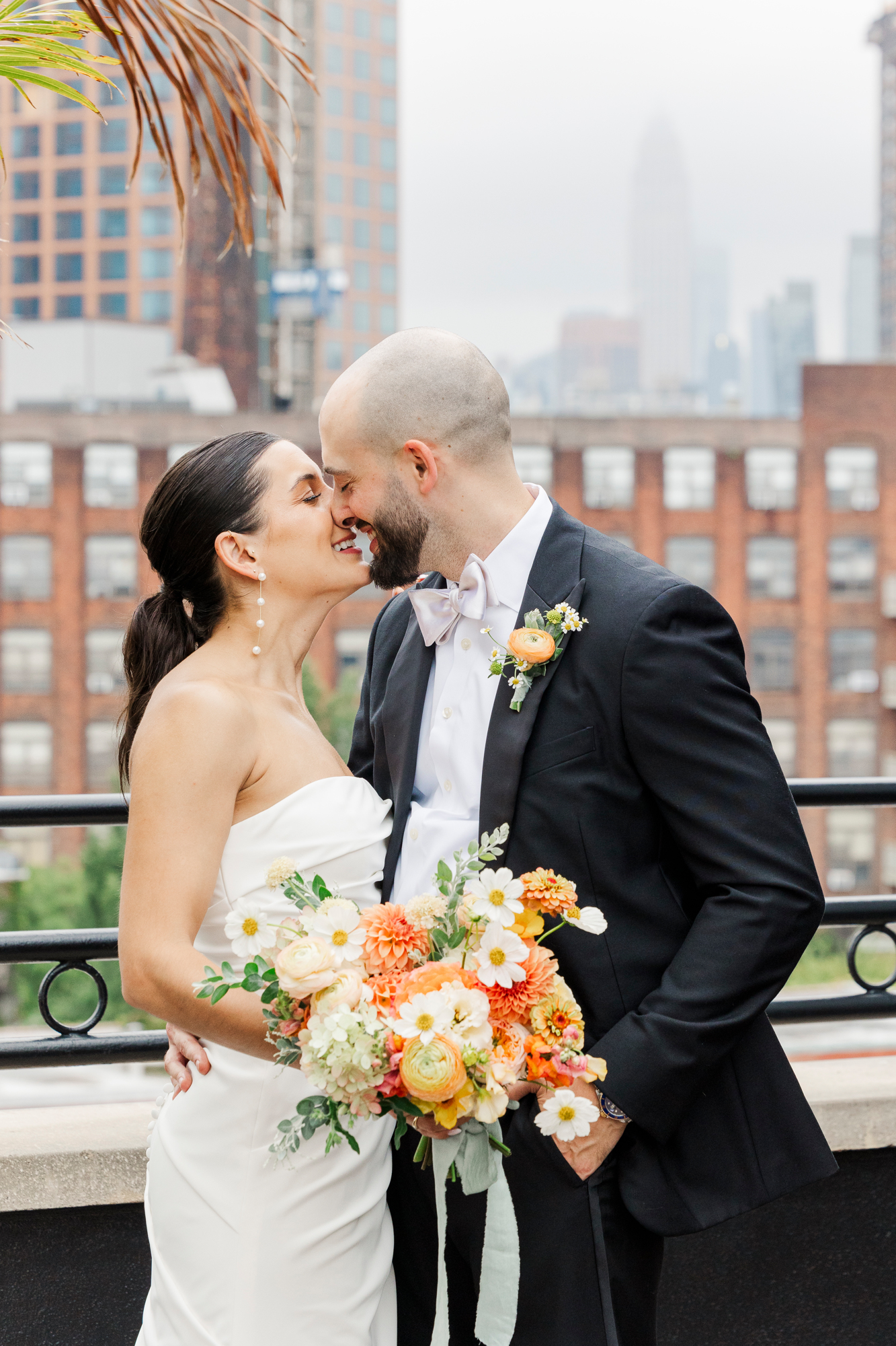 These Brooklyn wedding photos featured a closed rooftop for their hotel ceremony. It was raining on this day before the sun came out for cocktail hour. These two leaned in and enjoyed the cloudy weather as they said their vows to each other. The Box House Hotel rooftop was the perfect spot for their romantic ceremony surrounded by family and friends. This venue is great for couples who want a quintessential NYC celebration.