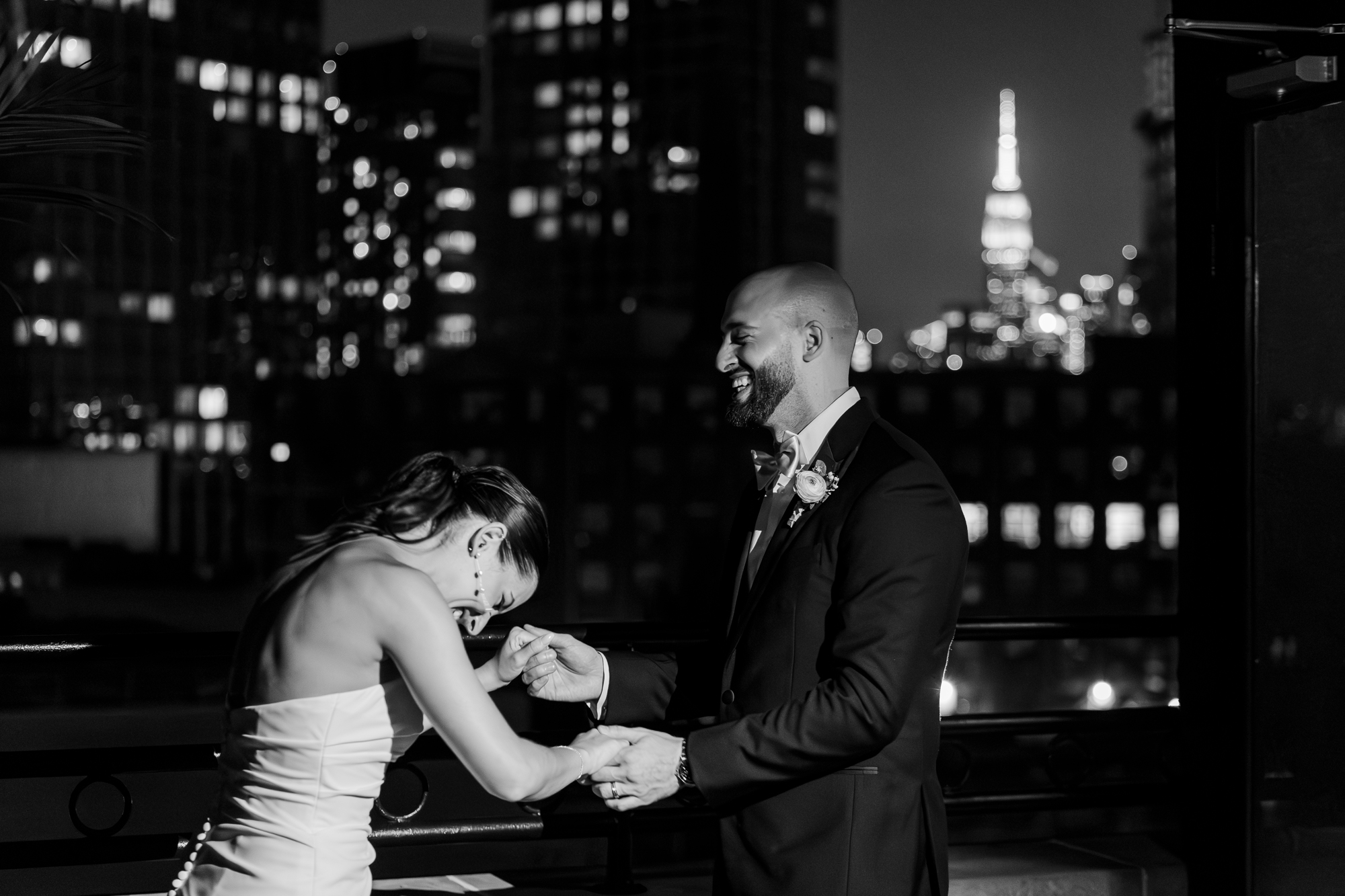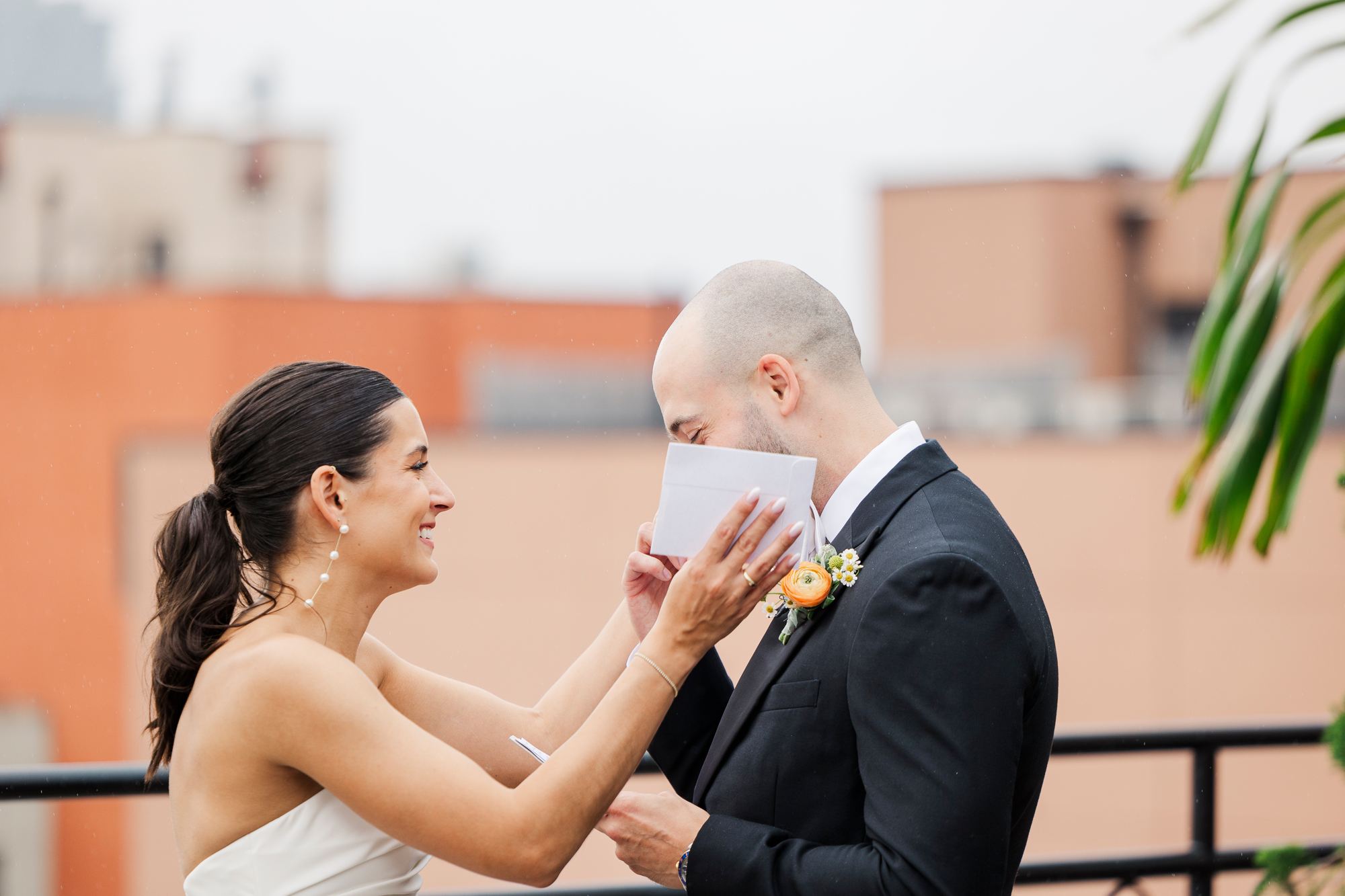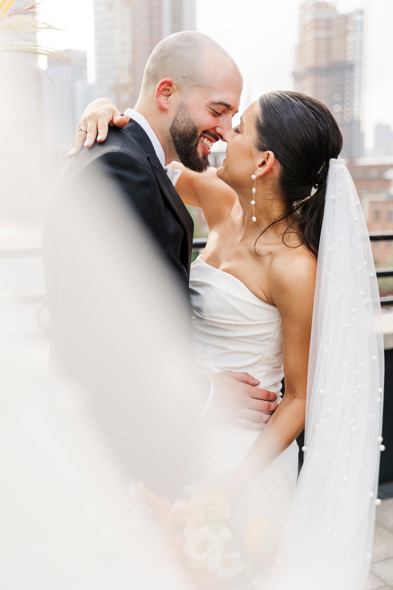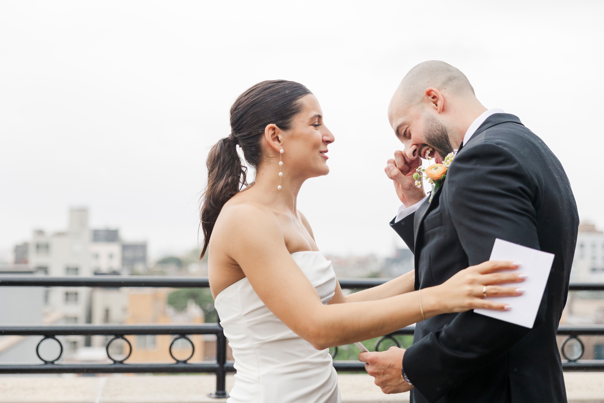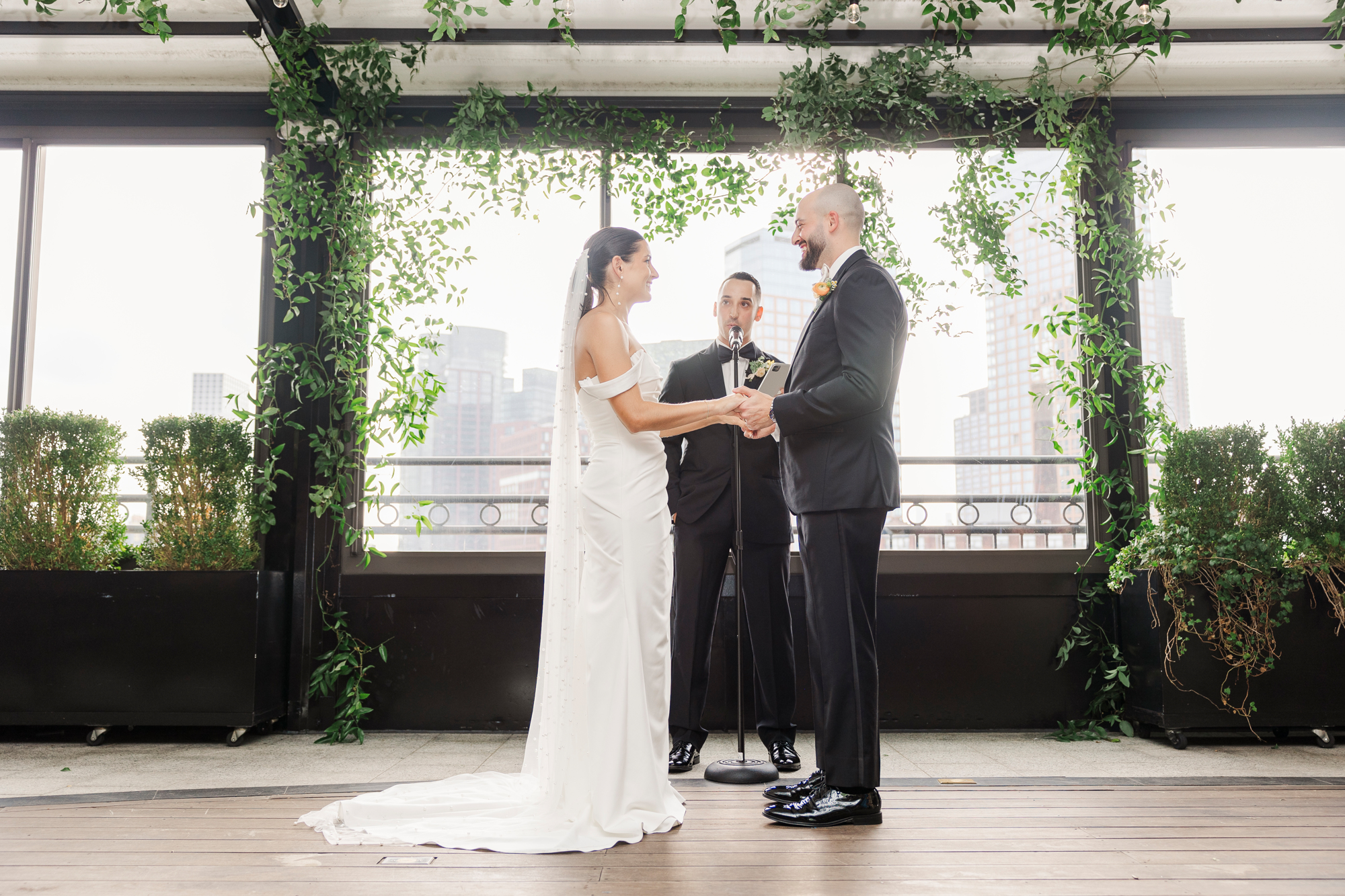 These Brooklyn wedding photos featured a closed rooftop for their hotel ceremony. It was raining on this day before the sun came out for cocktail hour. These two leaned in and enjoyed the cloudy weather as they said their vows to each other. The Box House Hotel rooftop was the perfect spot for their romantic ceremony surrounded by family and friends. This venue is great for couples who want a quintessential NYC celebration.