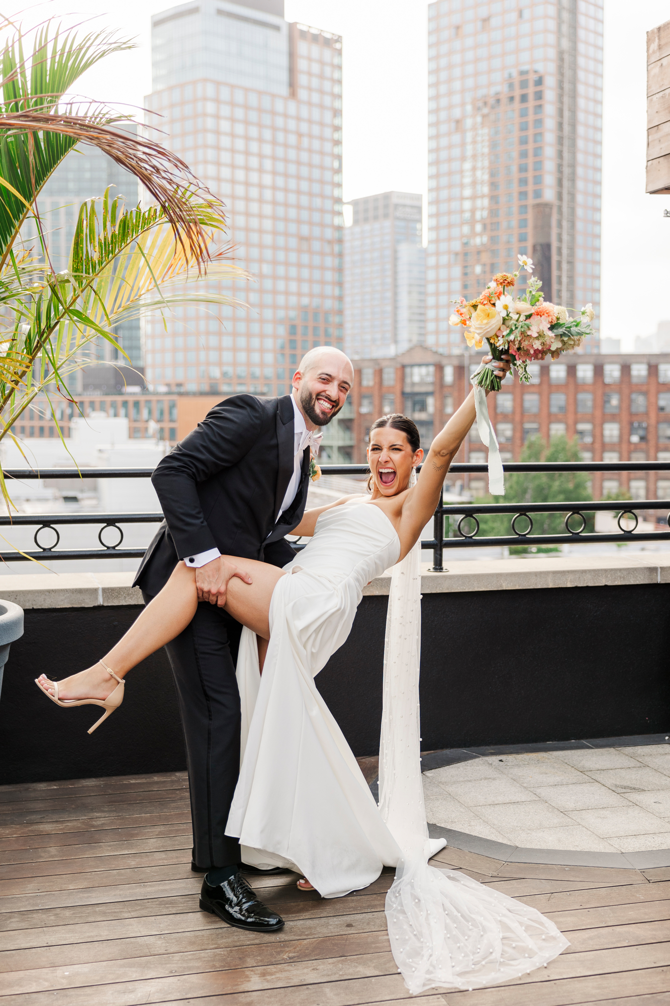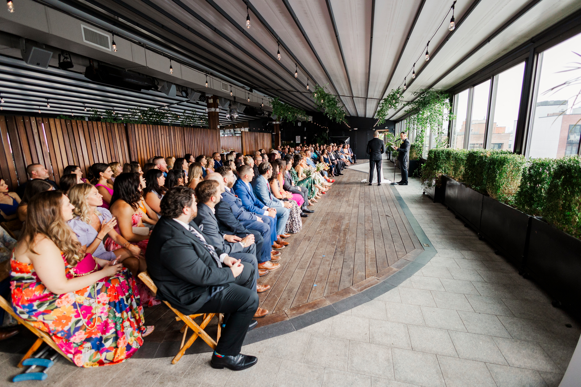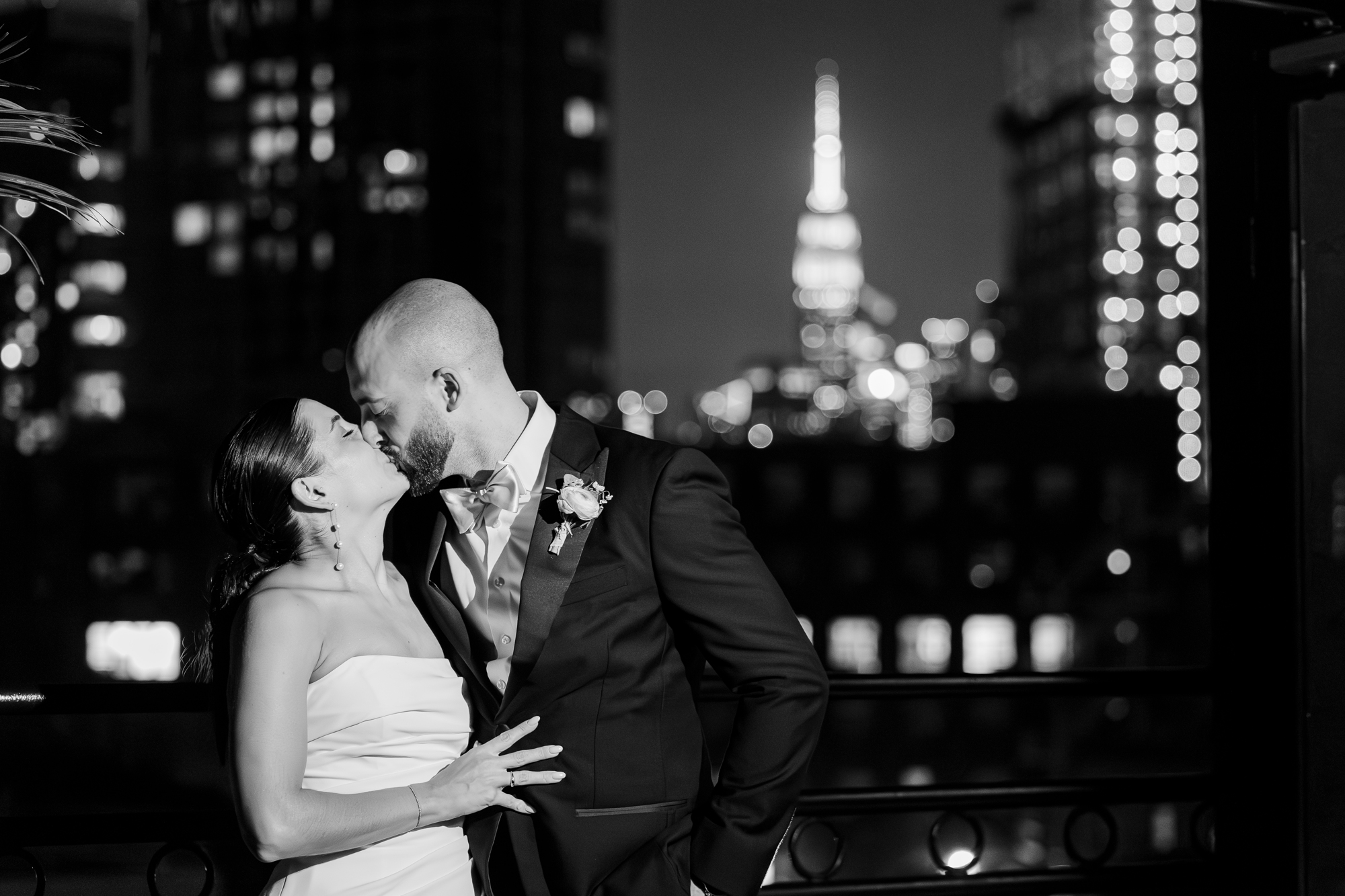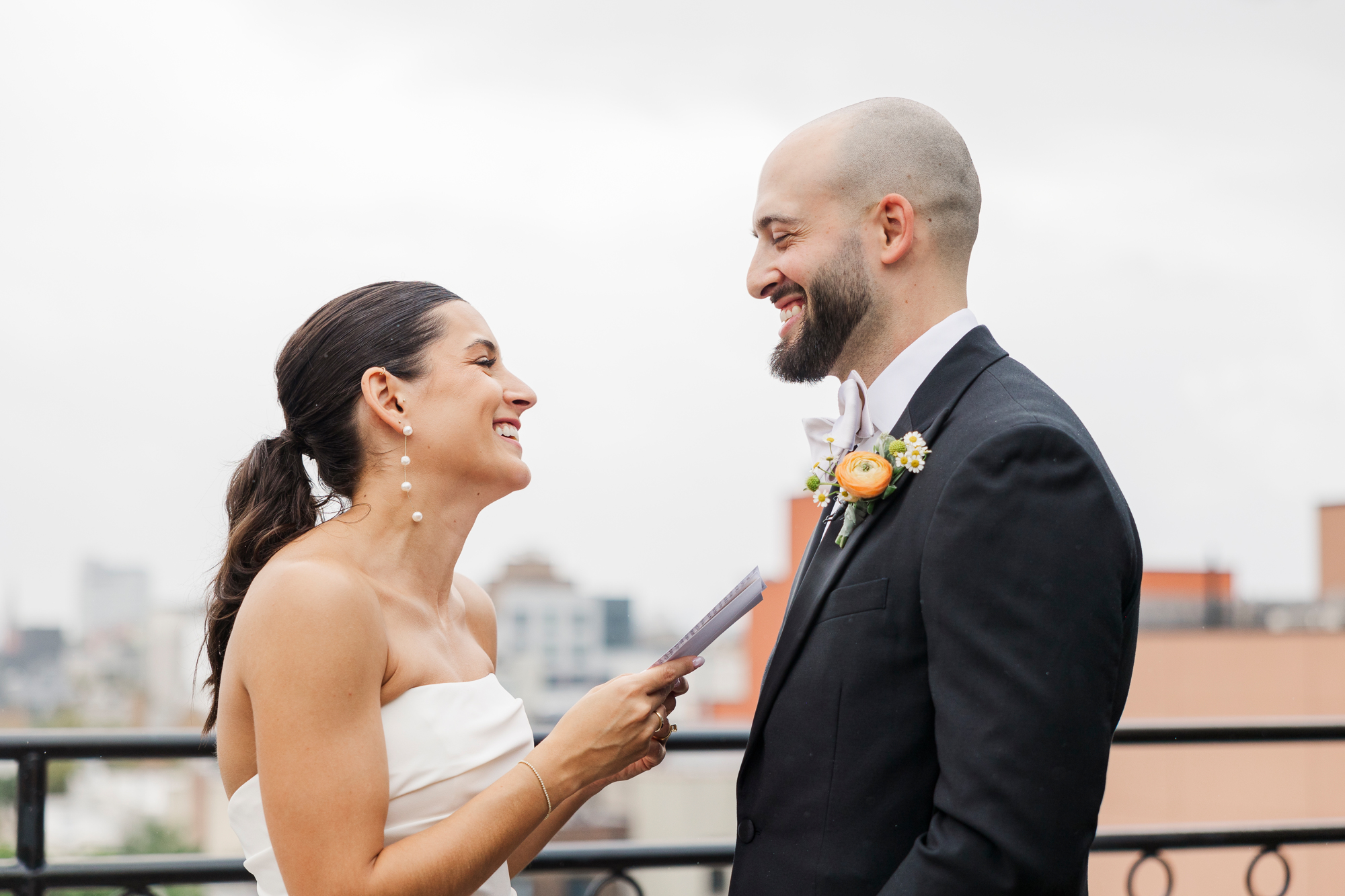 These Brooklyn wedding photos featured a closed rooftop for their hotel ceremony. It was raining on this day before the sun came out for cocktail hour. These two leaned in and enjoyed the cloudy weather as they said their vows to each other. The Box House Hotel rooftop was the perfect spot for their romantic ceremony surrounded by family and friends. This venue is great for couples who want a quintessential NYC celebration.