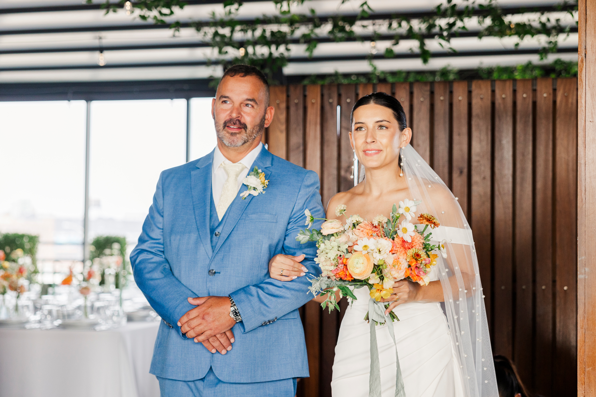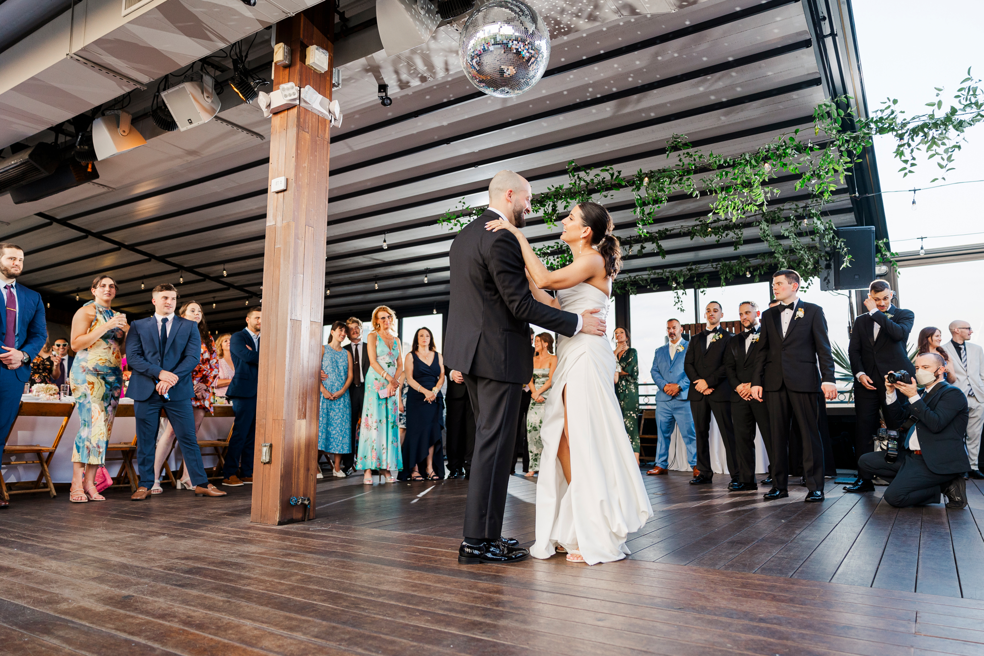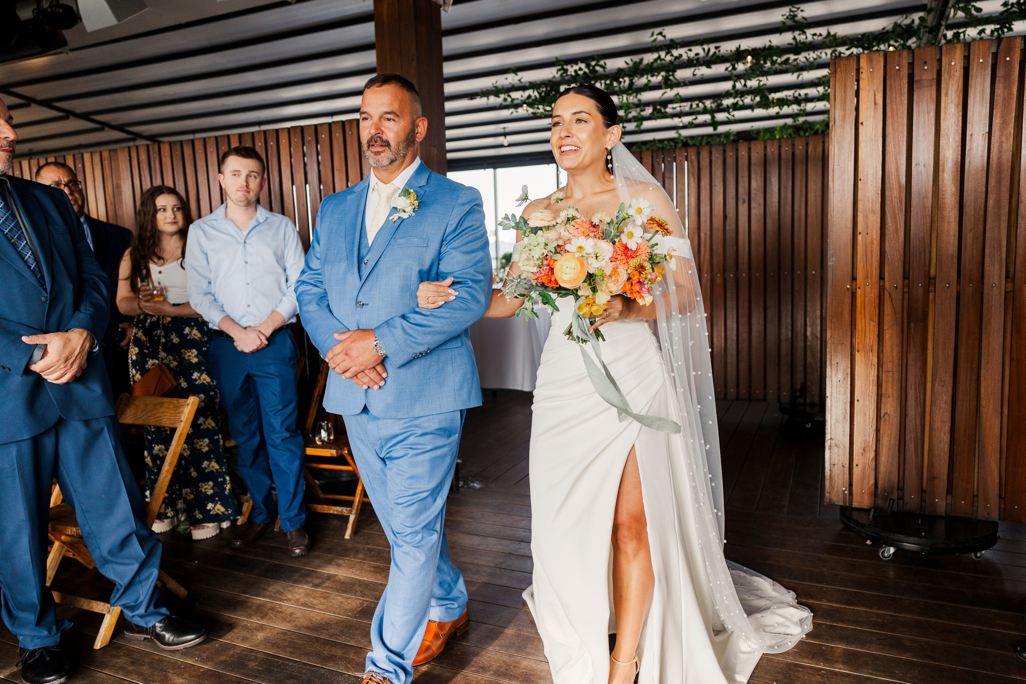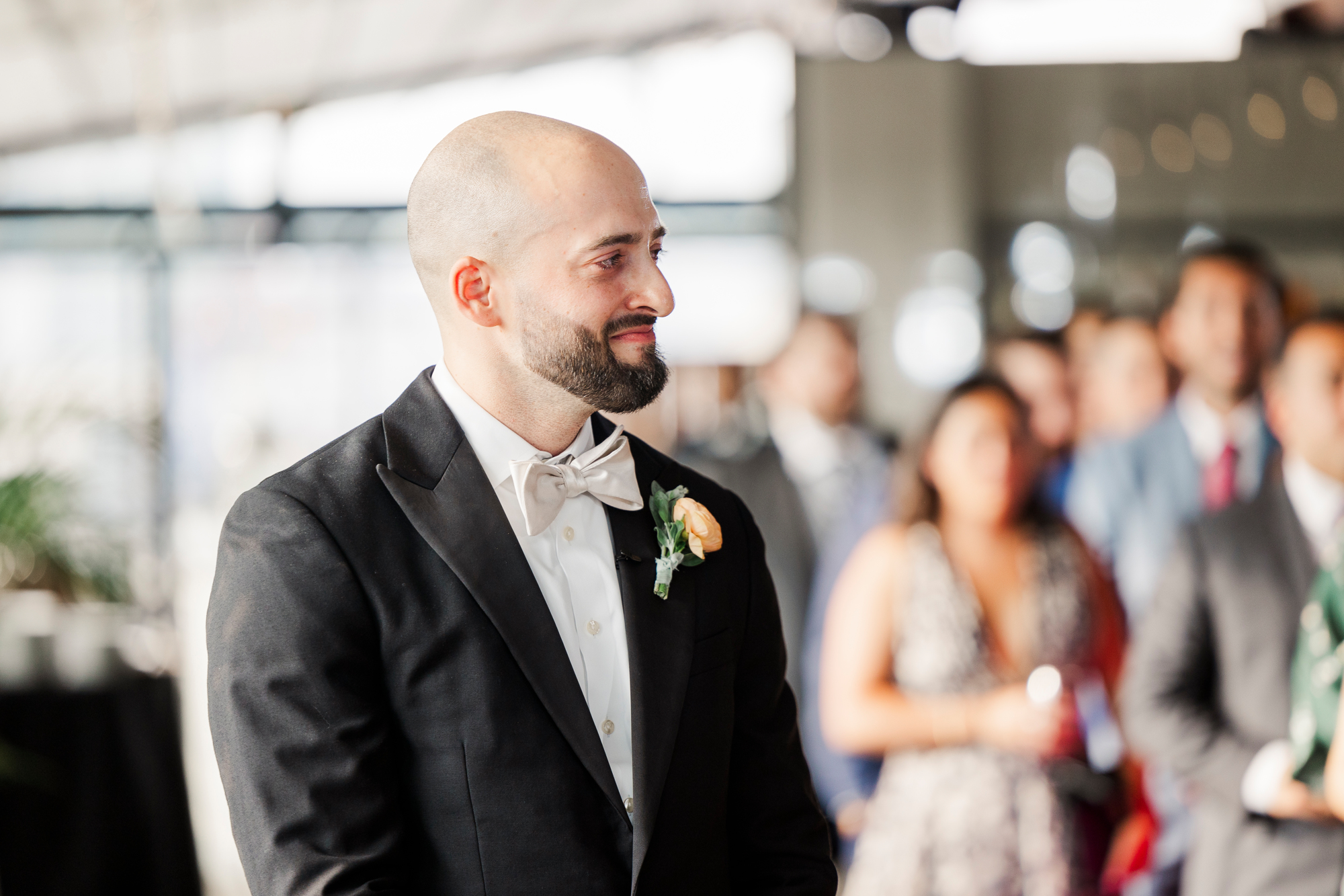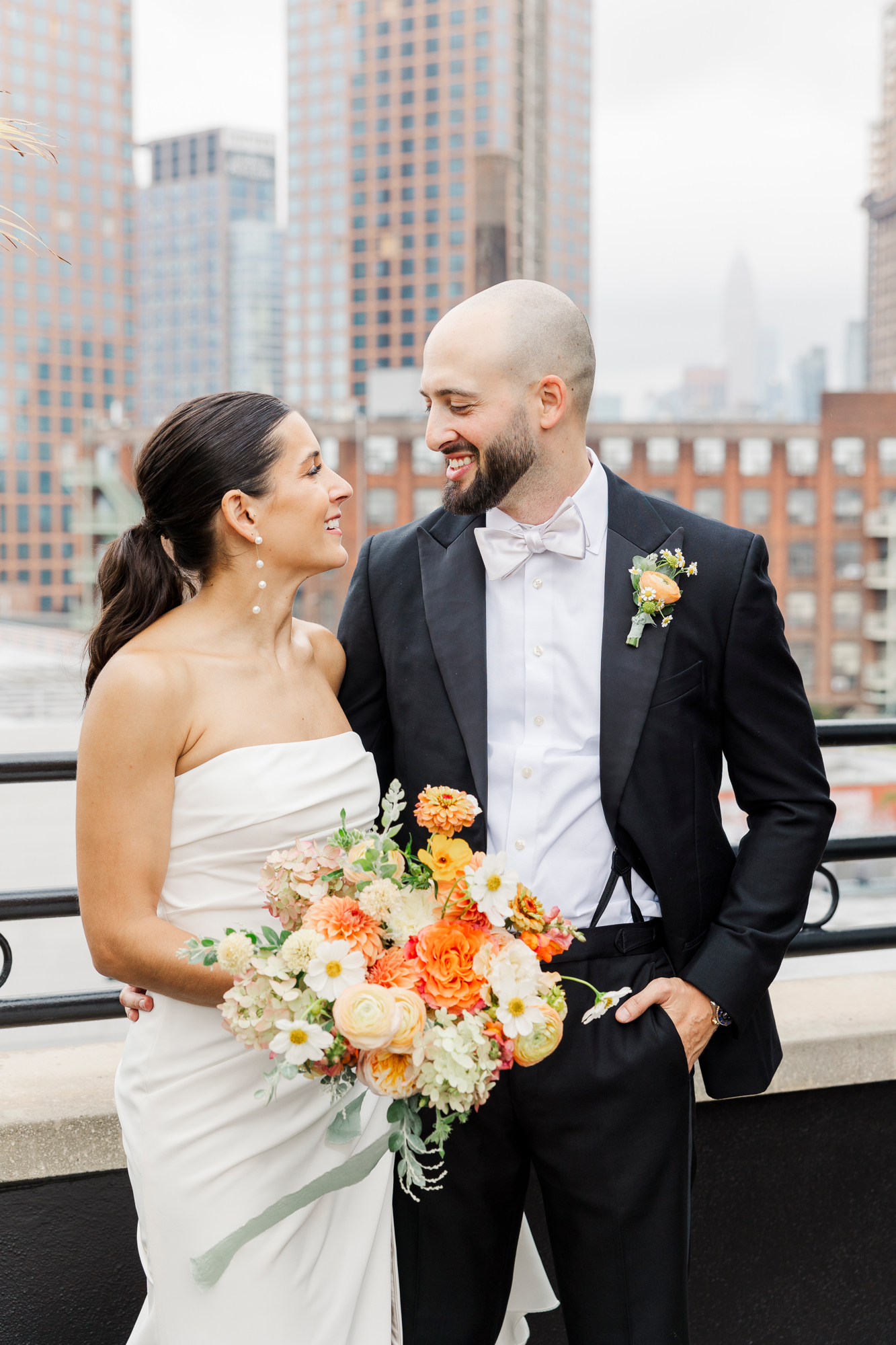 These Brooklyn wedding photos featured a closed rooftop for their hotel ceremony. It was raining on this day before the sun came out for cocktail hour. These two leaned in and enjoyed the cloudy weather as they said their vows to each other. The Box House Hotel rooftop was the perfect spot for their romantic ceremony surrounded by family and friends. This venue is great for couples who want a quintessential NYC celebration.