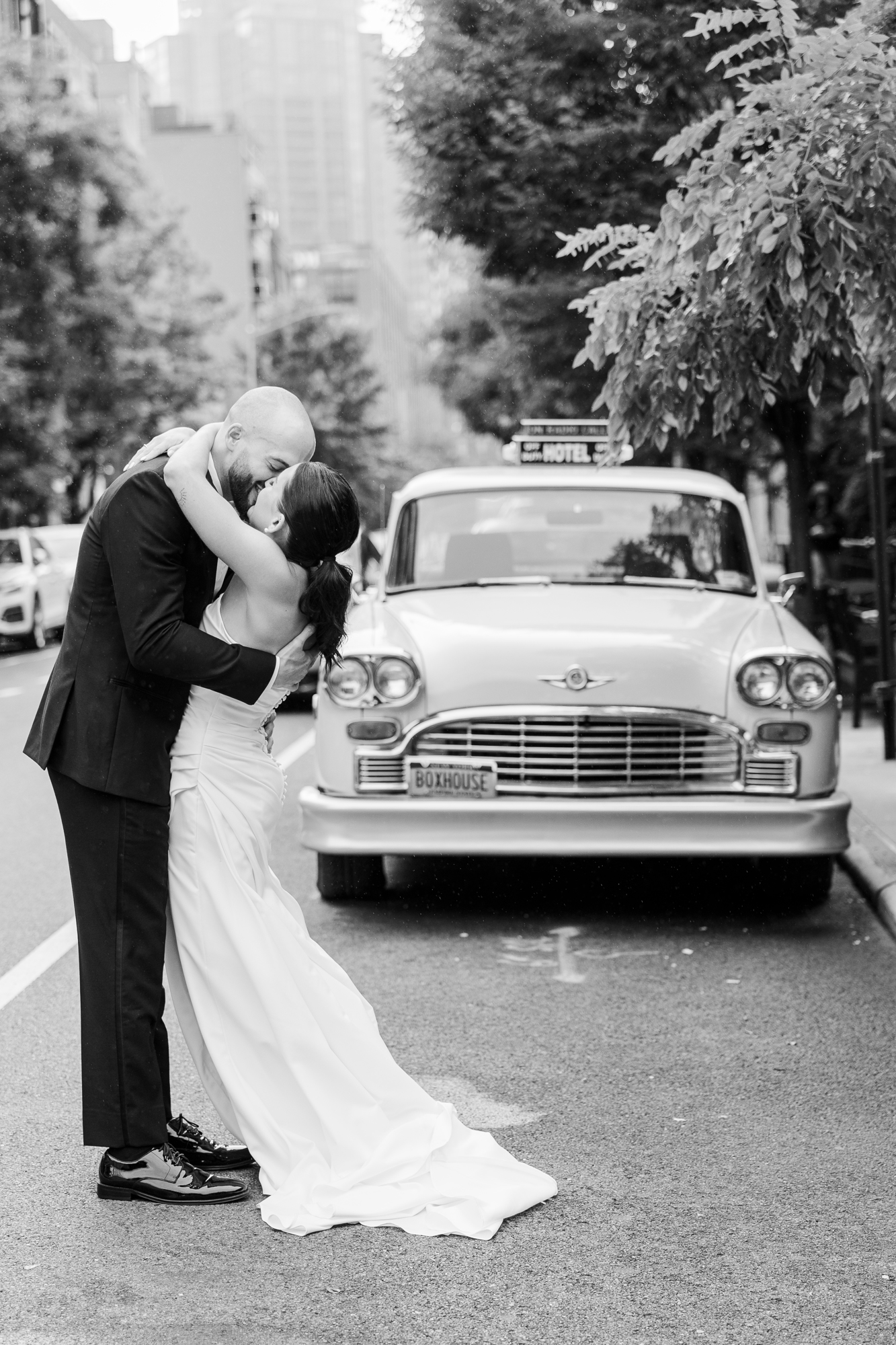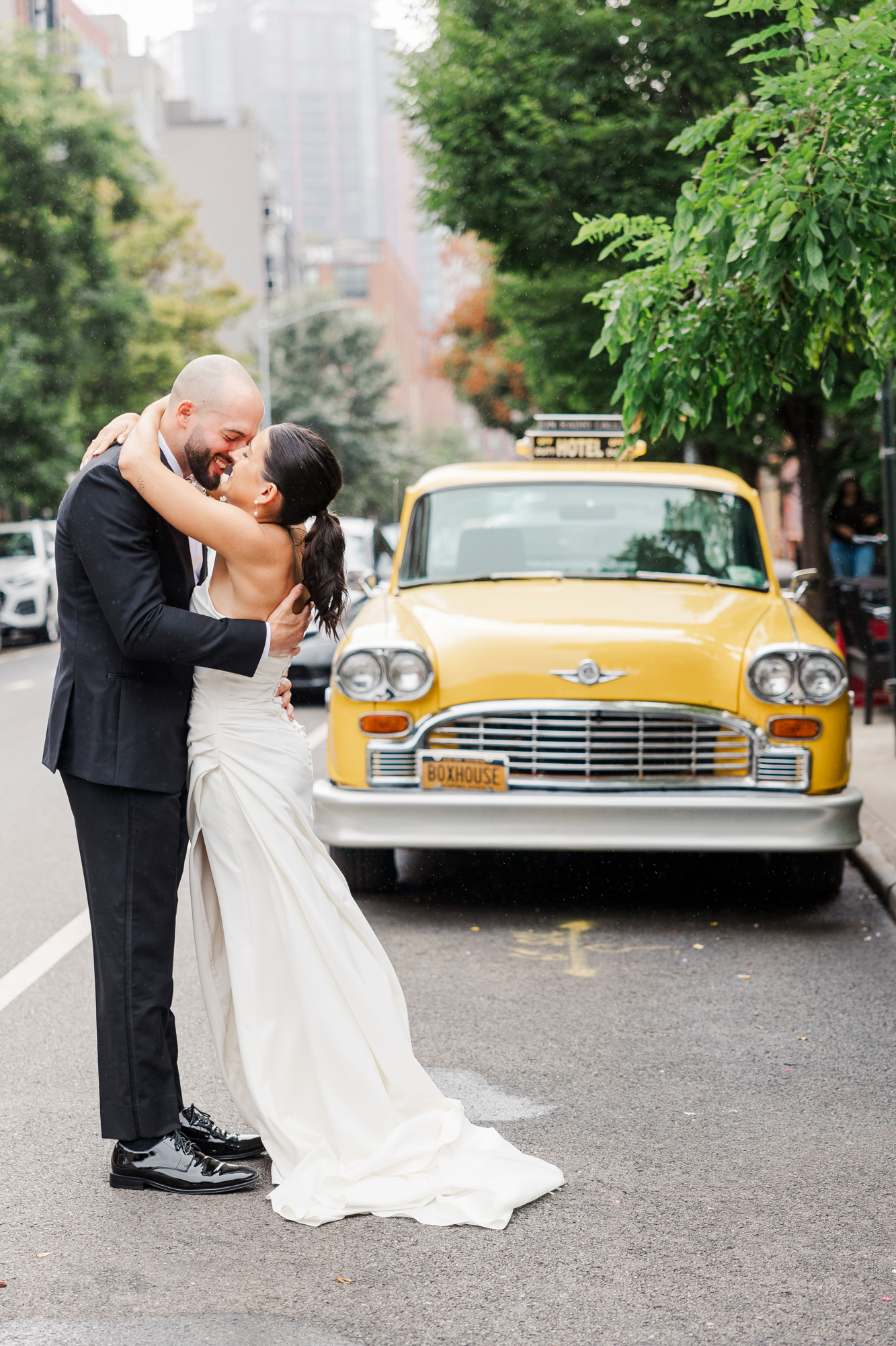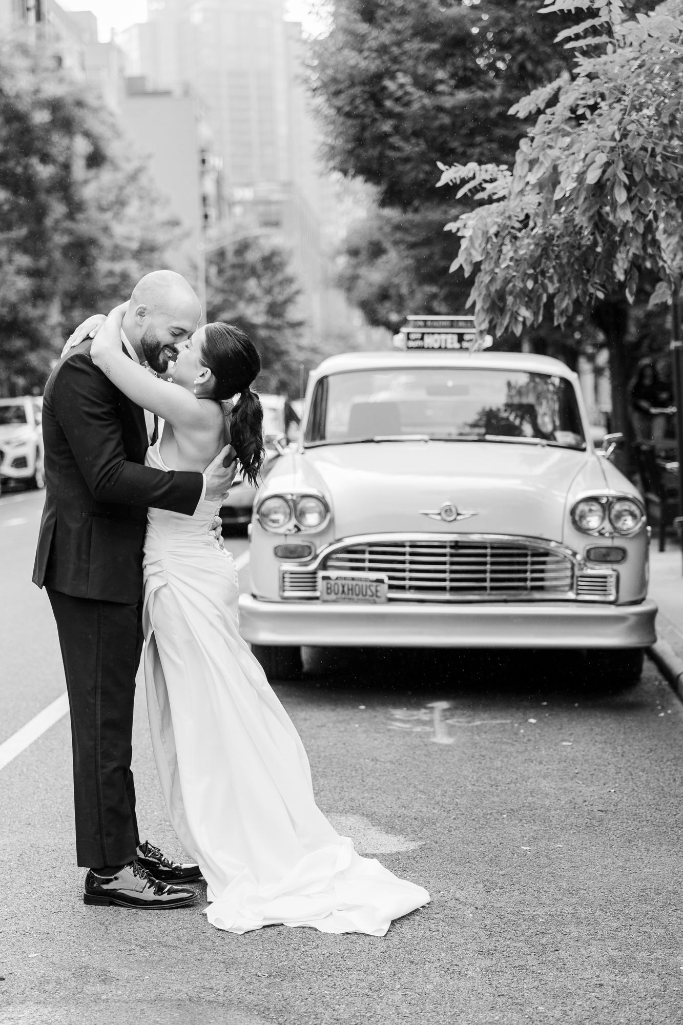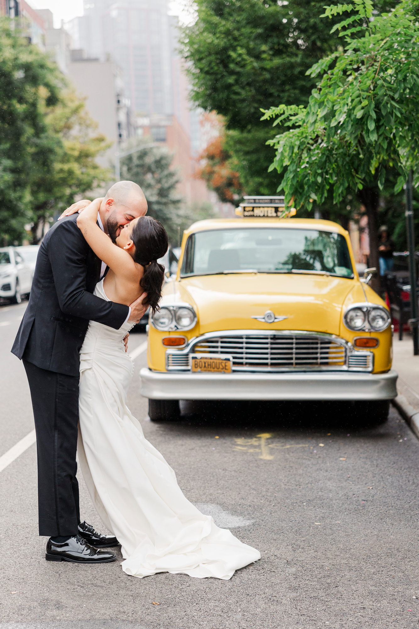 They each got ready in their respective rooms at the hotel. They then met outside for their first look, featuring the vintage yellow cab. When it comes to a Box House Hotel wedding, you must capture the taxi for the full effect. We love this built-in prop that comes with the venue. Before walking down the aisle, we also got their wedding party and family photos done on the roof.