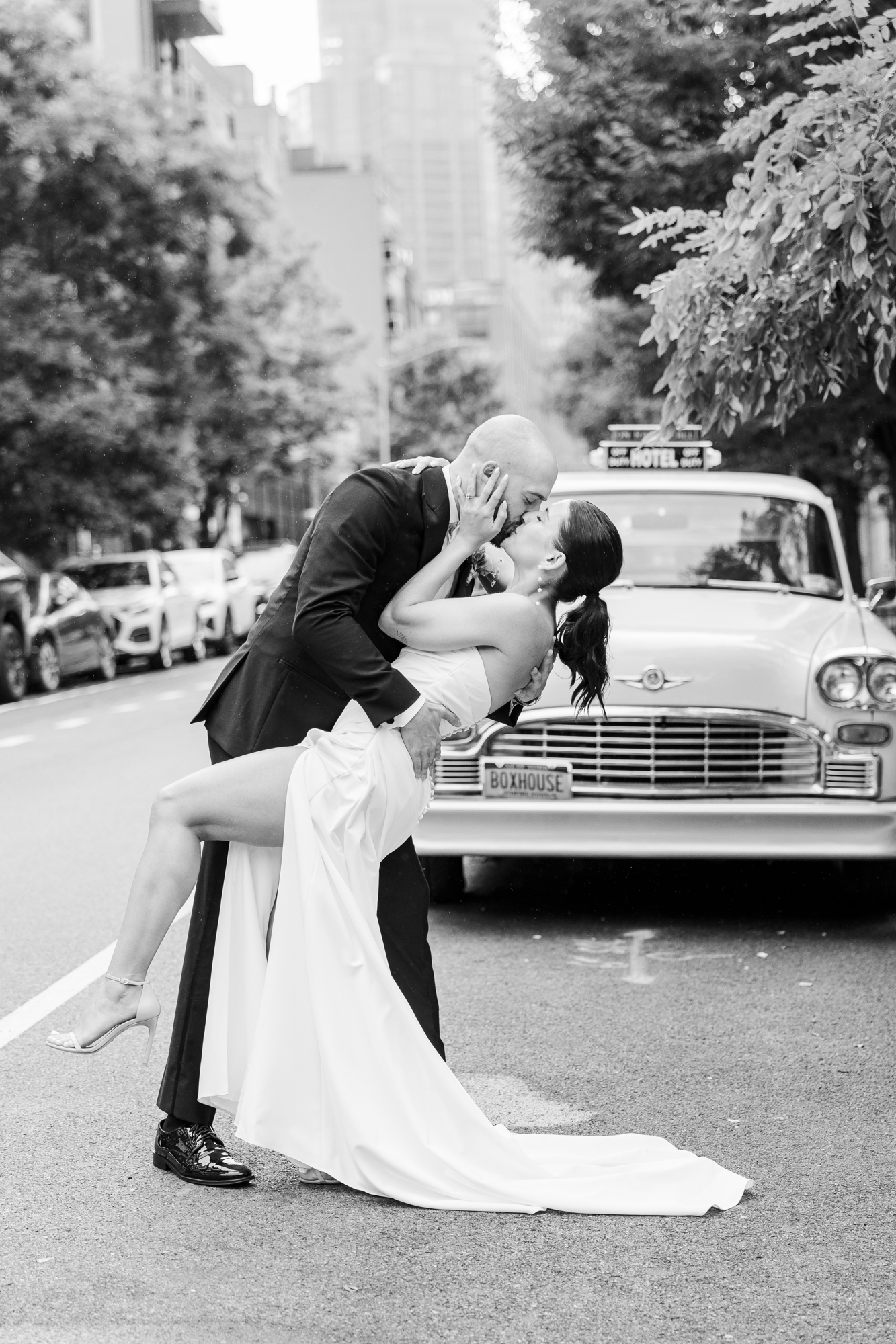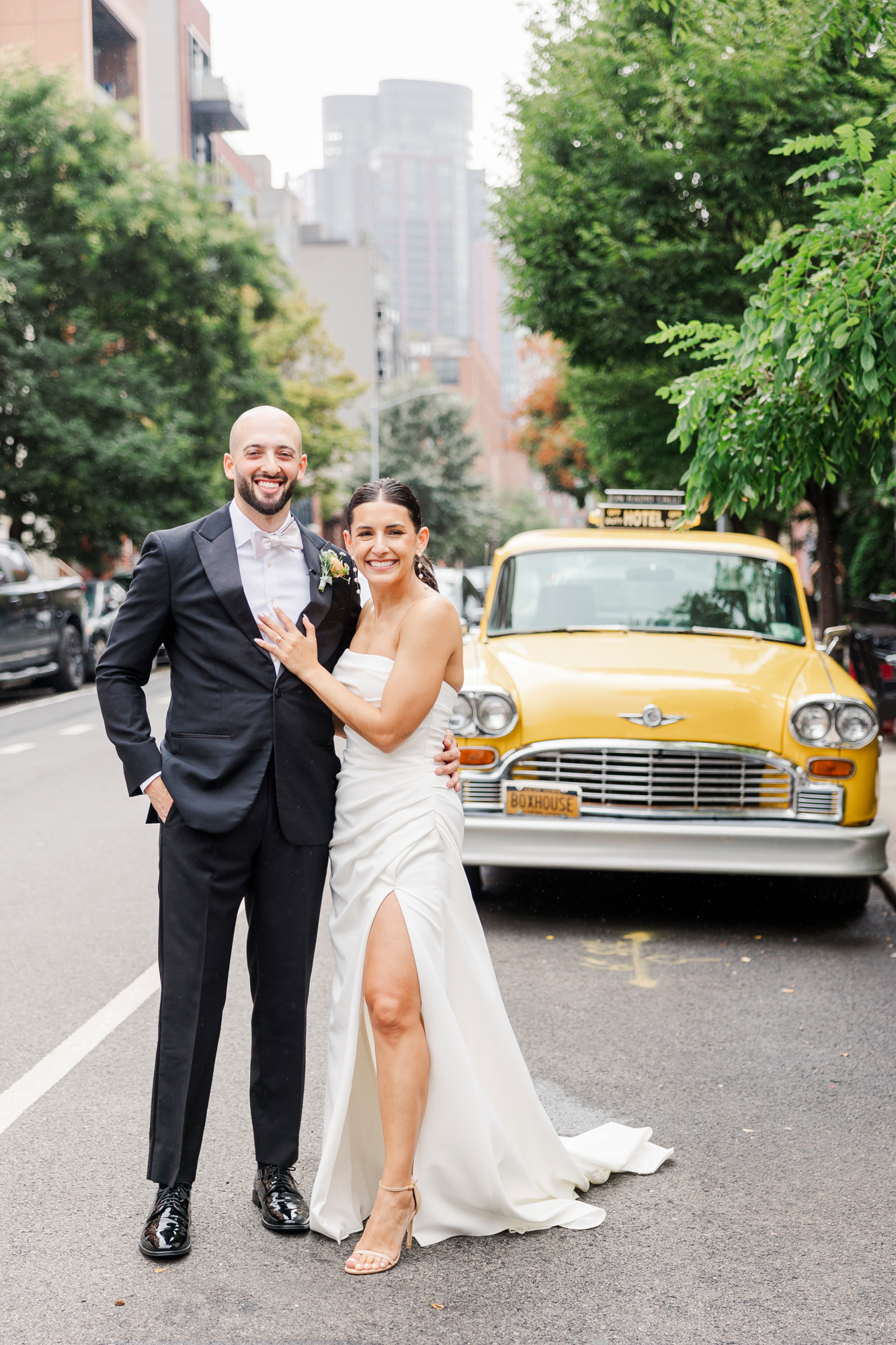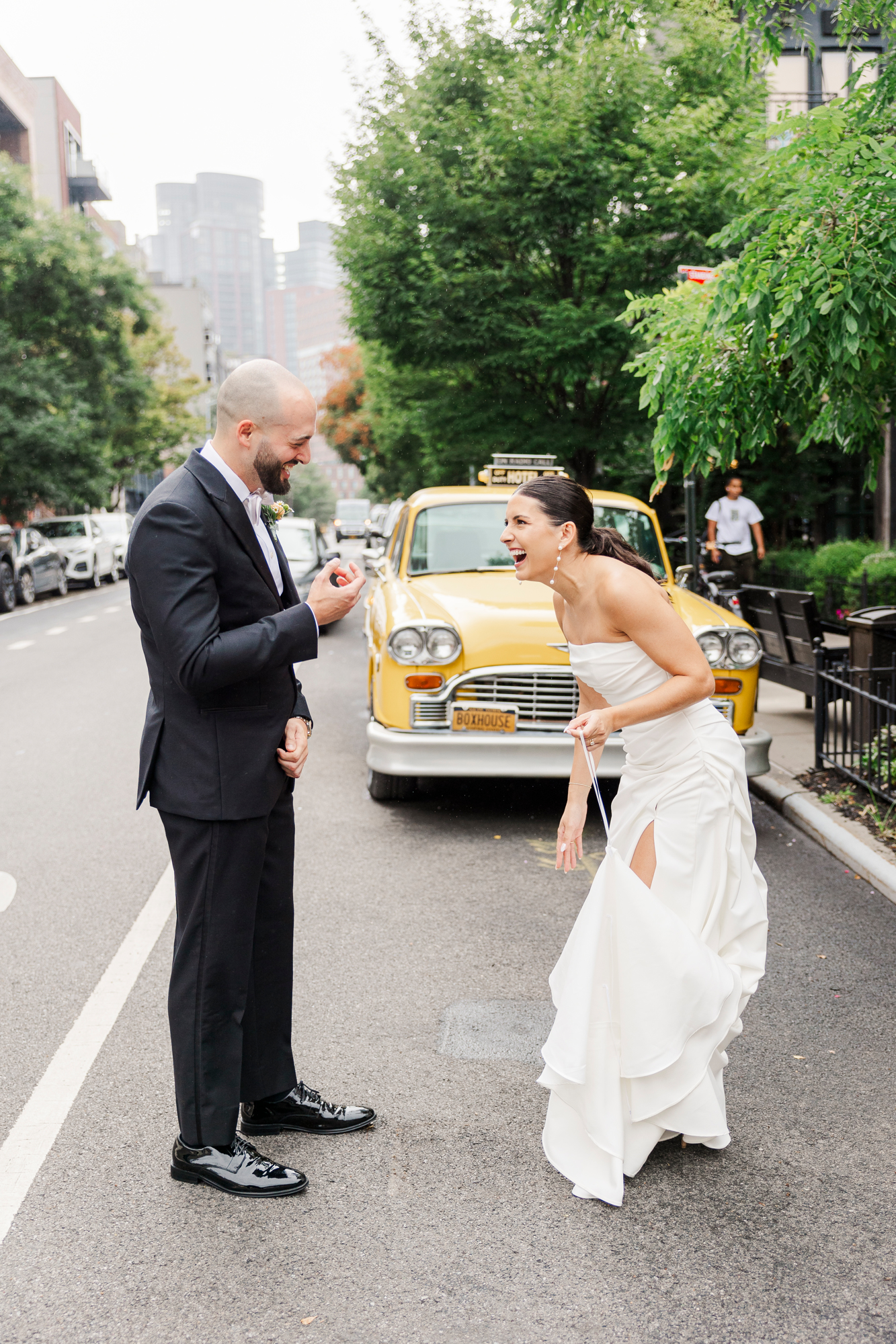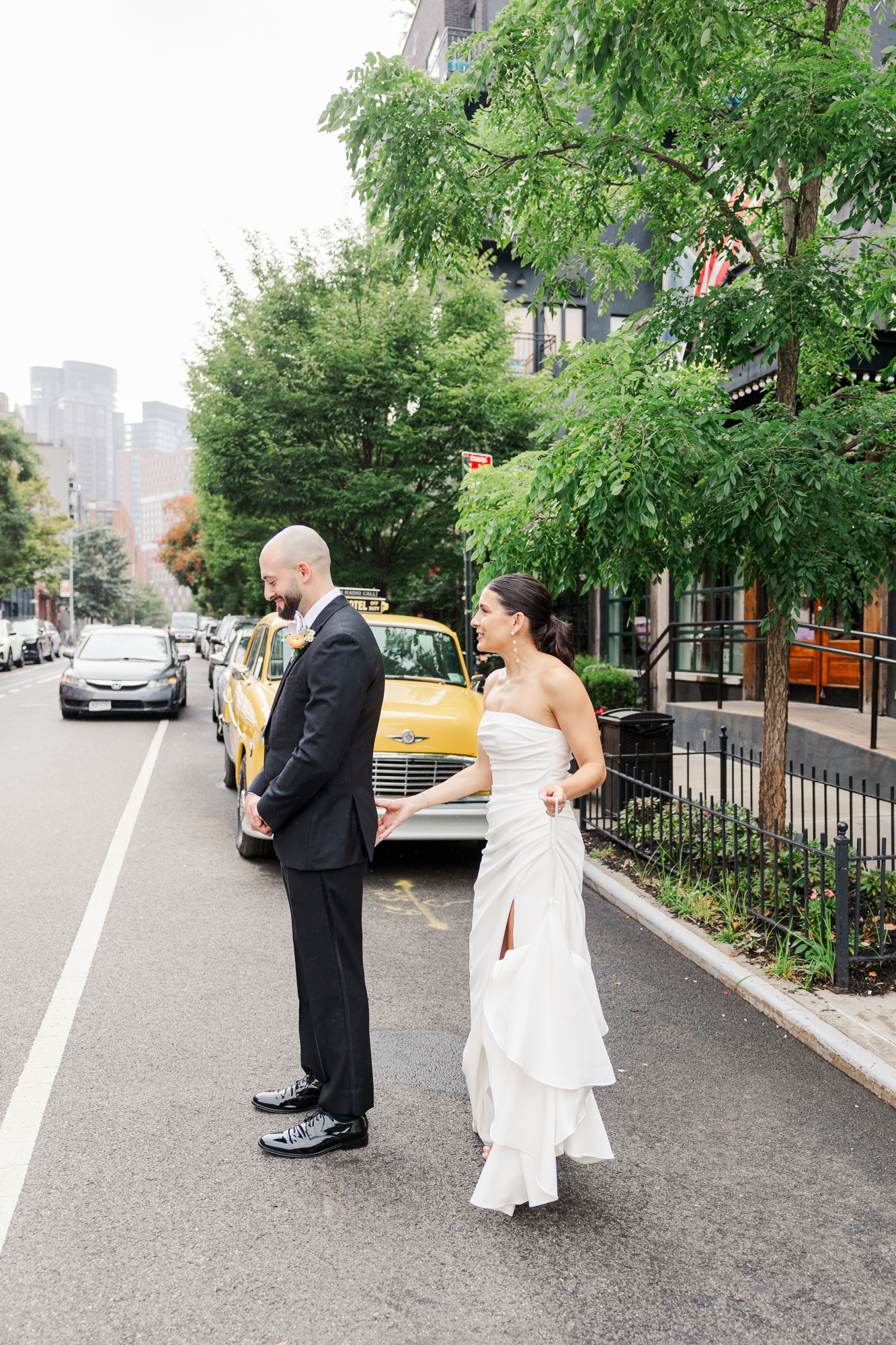 They each got ready in their respective rooms at the hotel. They then met outside for their first look, featuring the vintage yellow cab. When it comes to a Box House Hotel wedding, you must capture the taxi for the full effect. We love this built-in prop that comes with the venue. Before walking down the aisle, we also got their wedding party and family photos done on the roof.