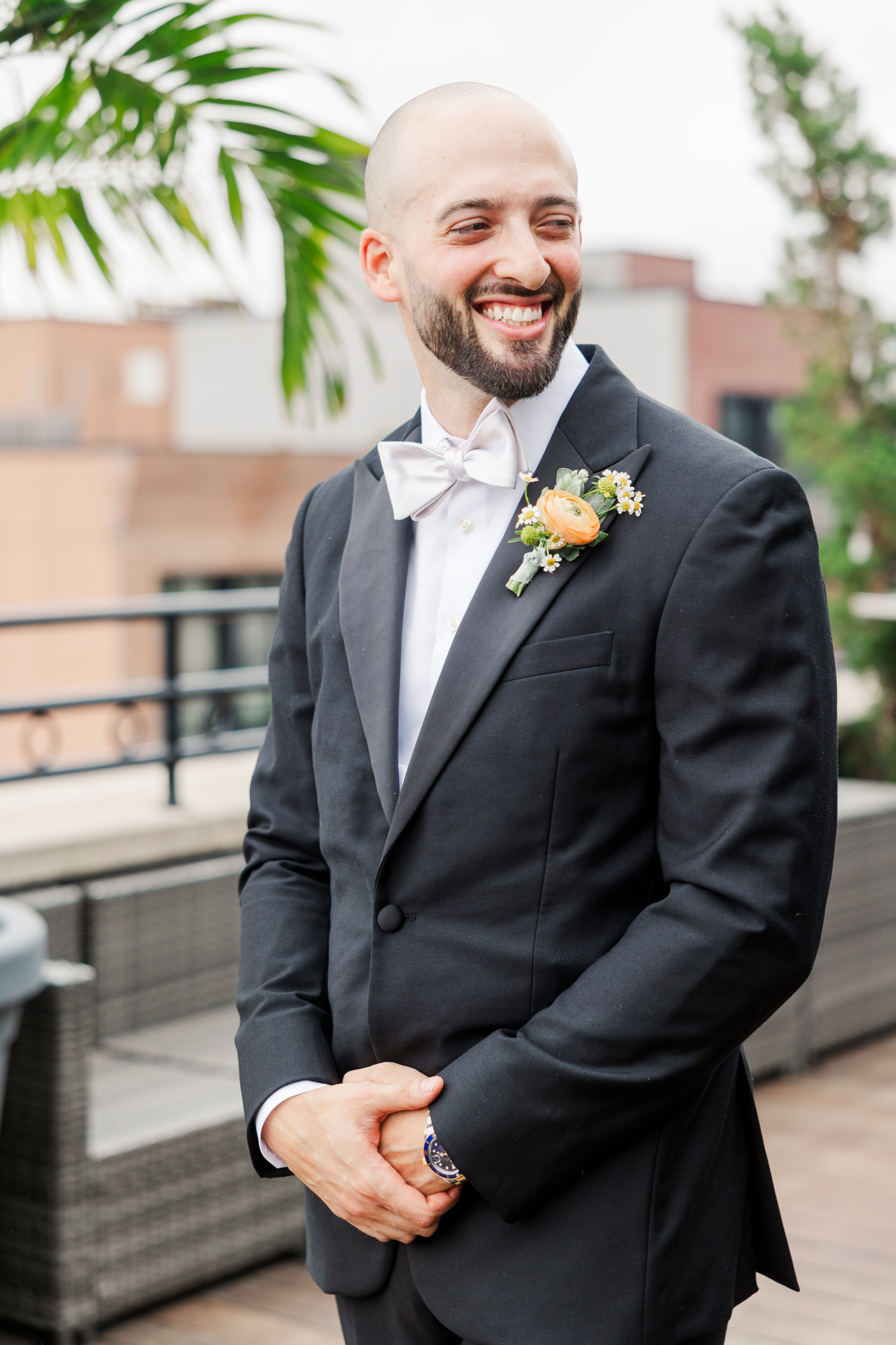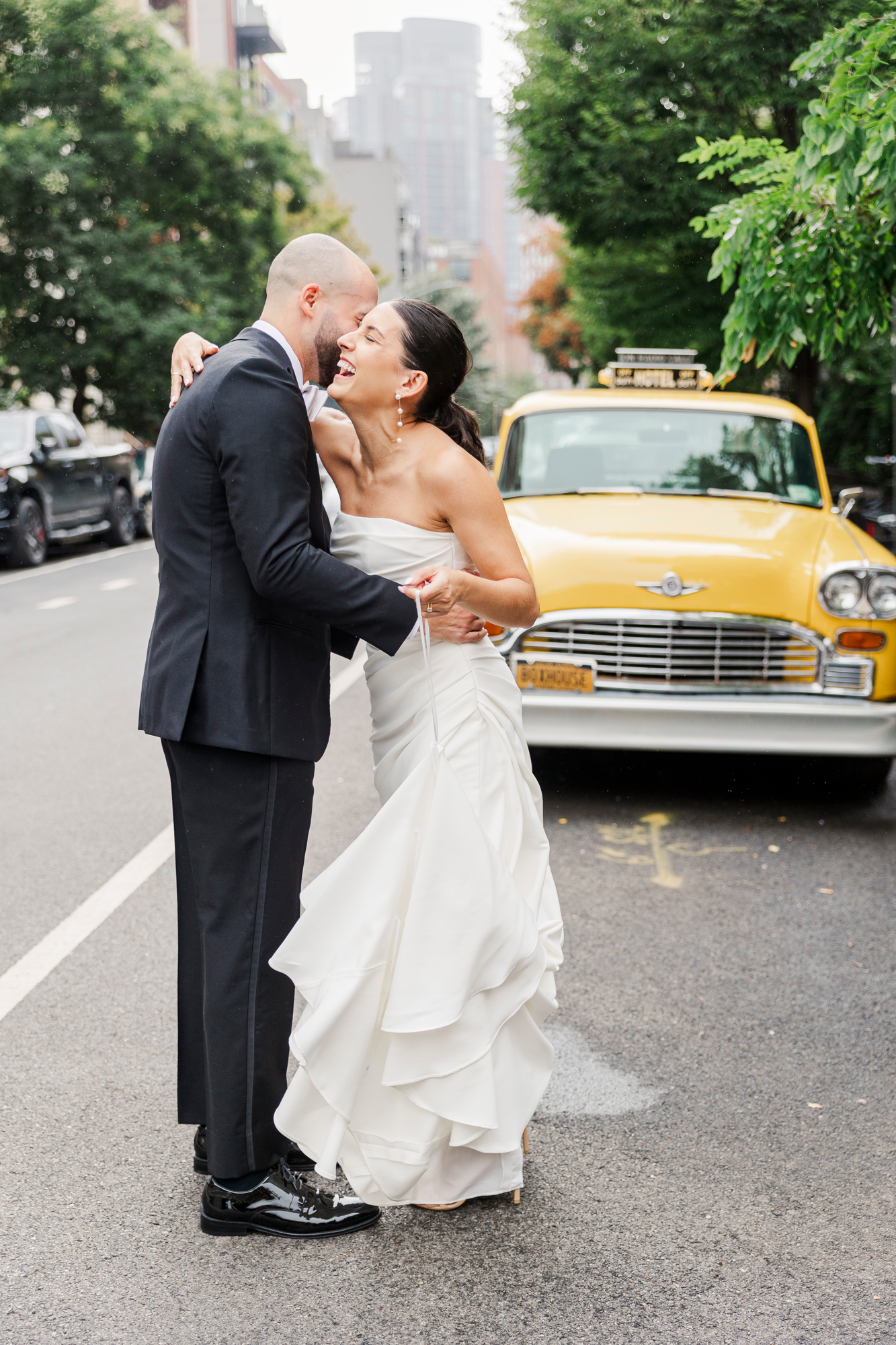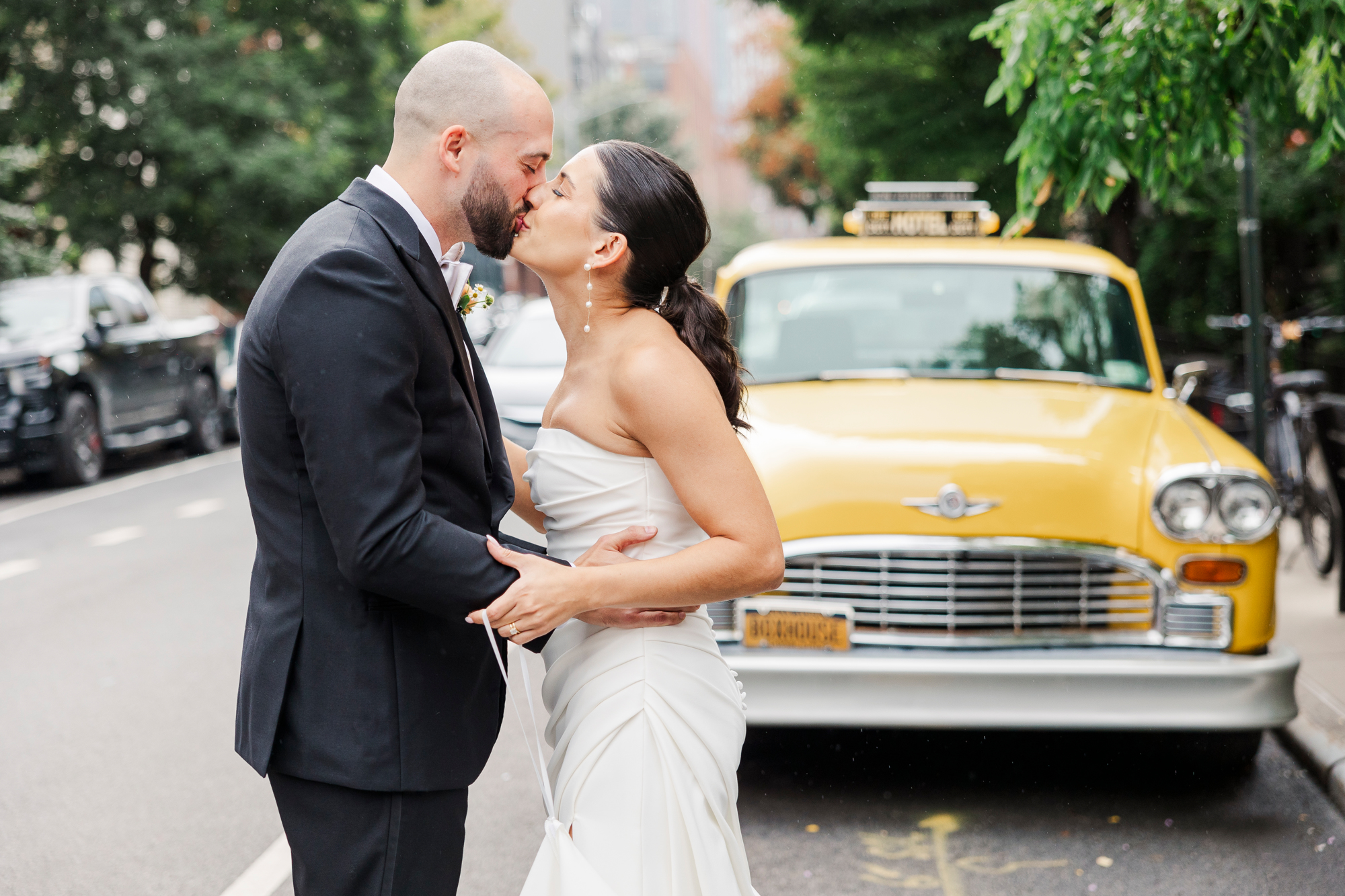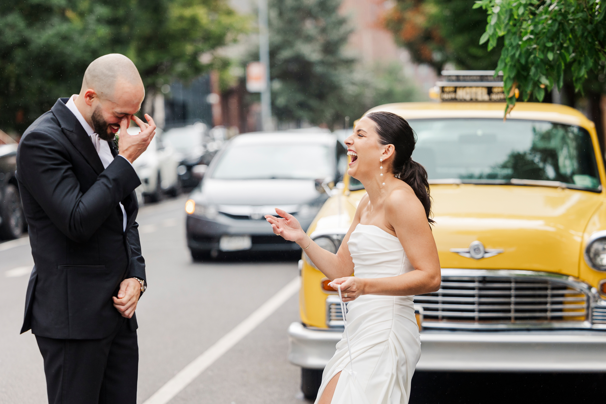 They each got ready in their respective rooms at the hotel. They then met outside for their first look, featuring the vintage yellow cab. When it comes to a Box House Hotel wedding, you must capture the taxi for the full effect. We love this built-in prop that comes with the venue. Before walking down the aisle, we also got their wedding party and family photos done on the roof.