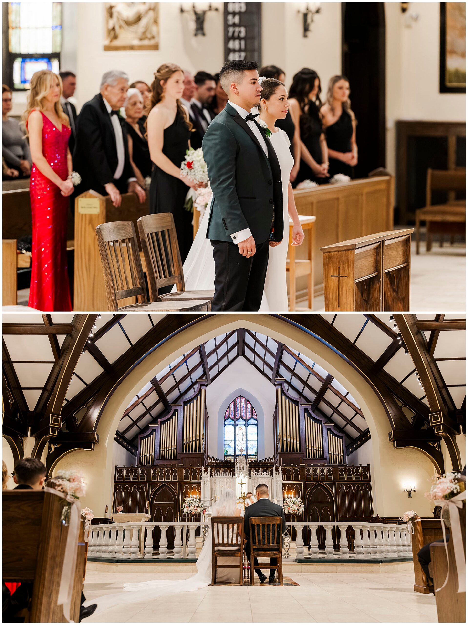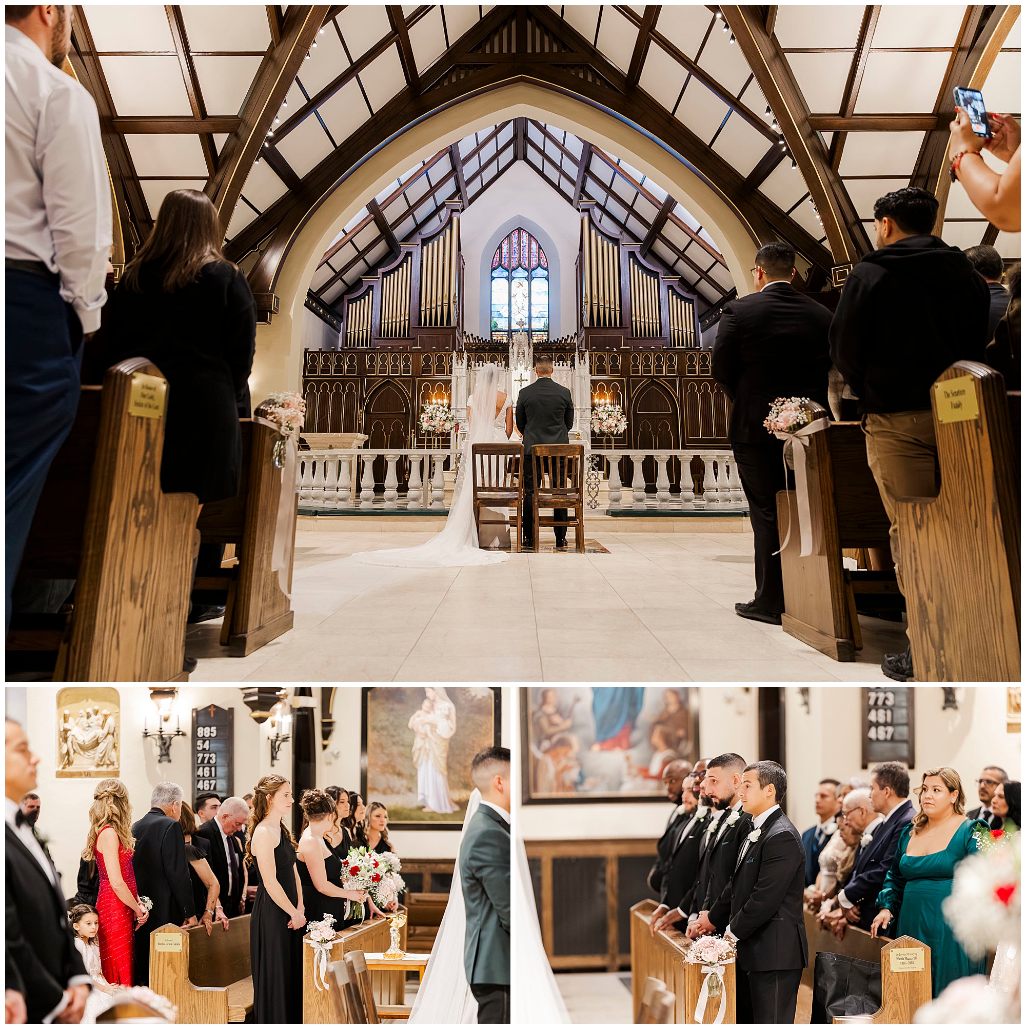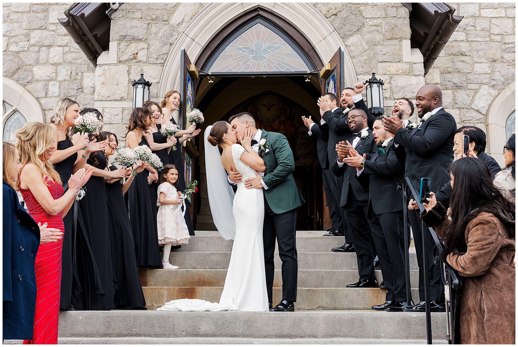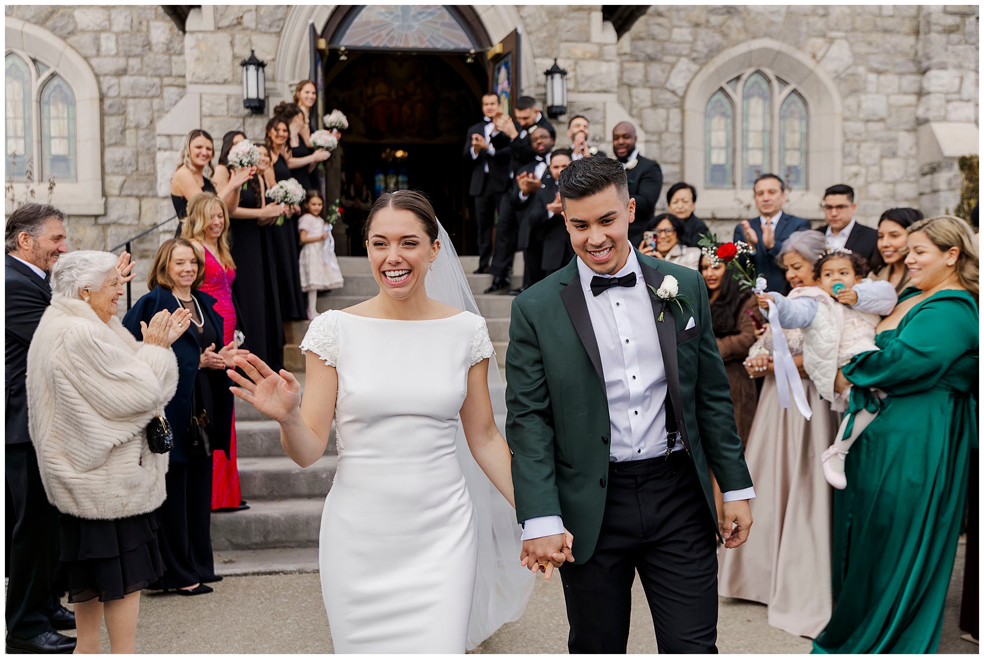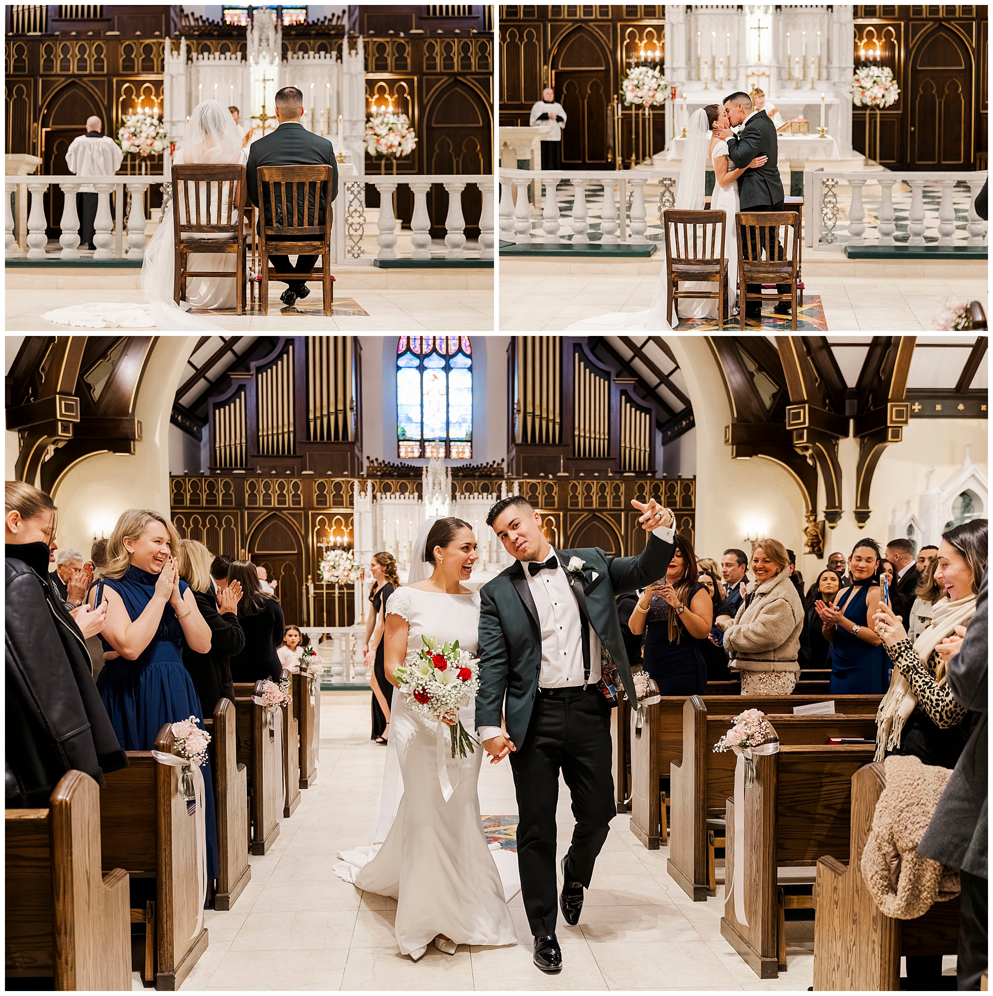 After exchanging vows, Caroline and Ernesto made a grand exit from the church. Consequently, the cheers from their guests echoed through the Poughkeepsie streets. The couple then circled back inside for family portraits at the altar. Moreover, the altar’s elegant details created a timeless setting for their family photos.