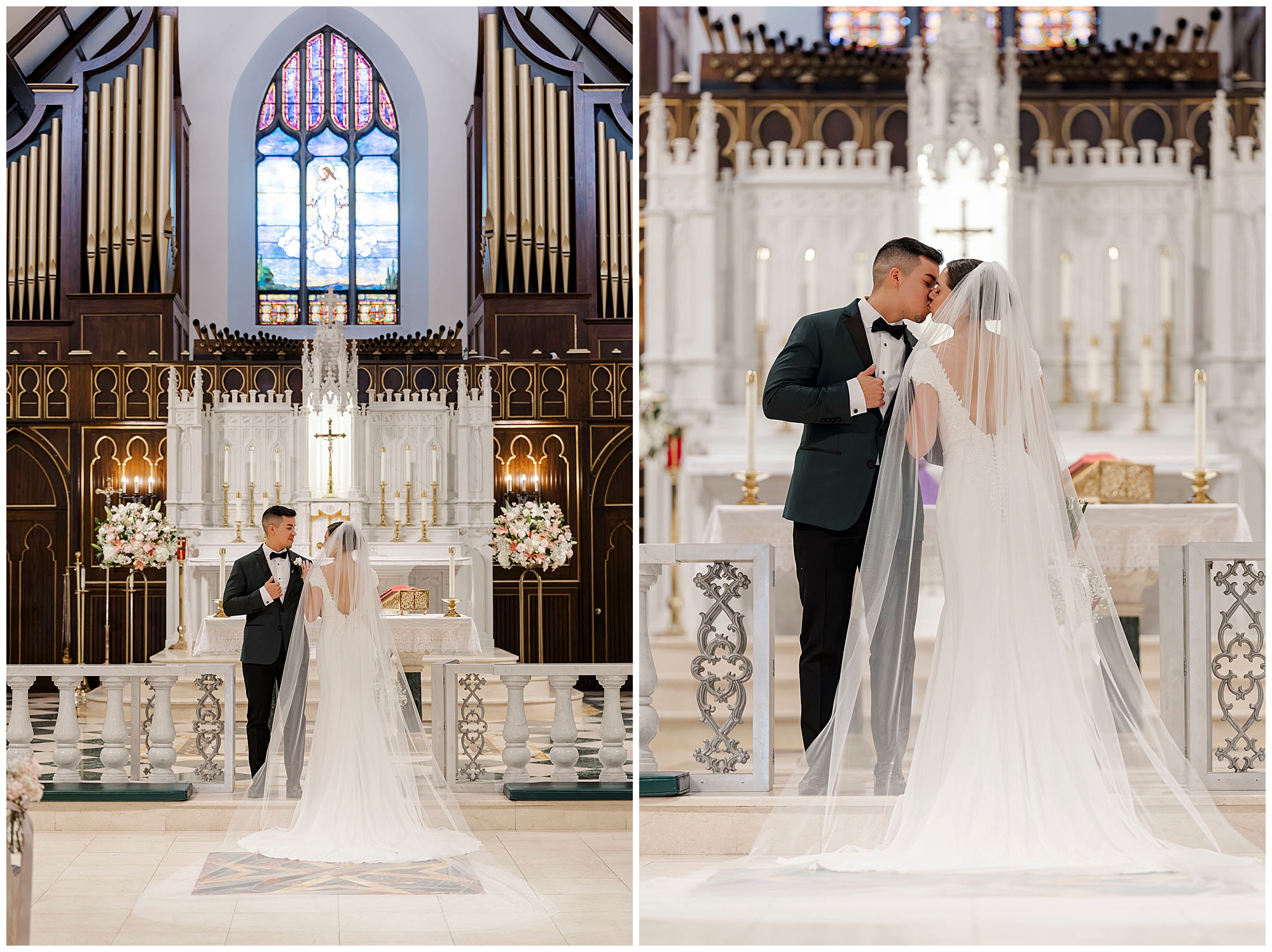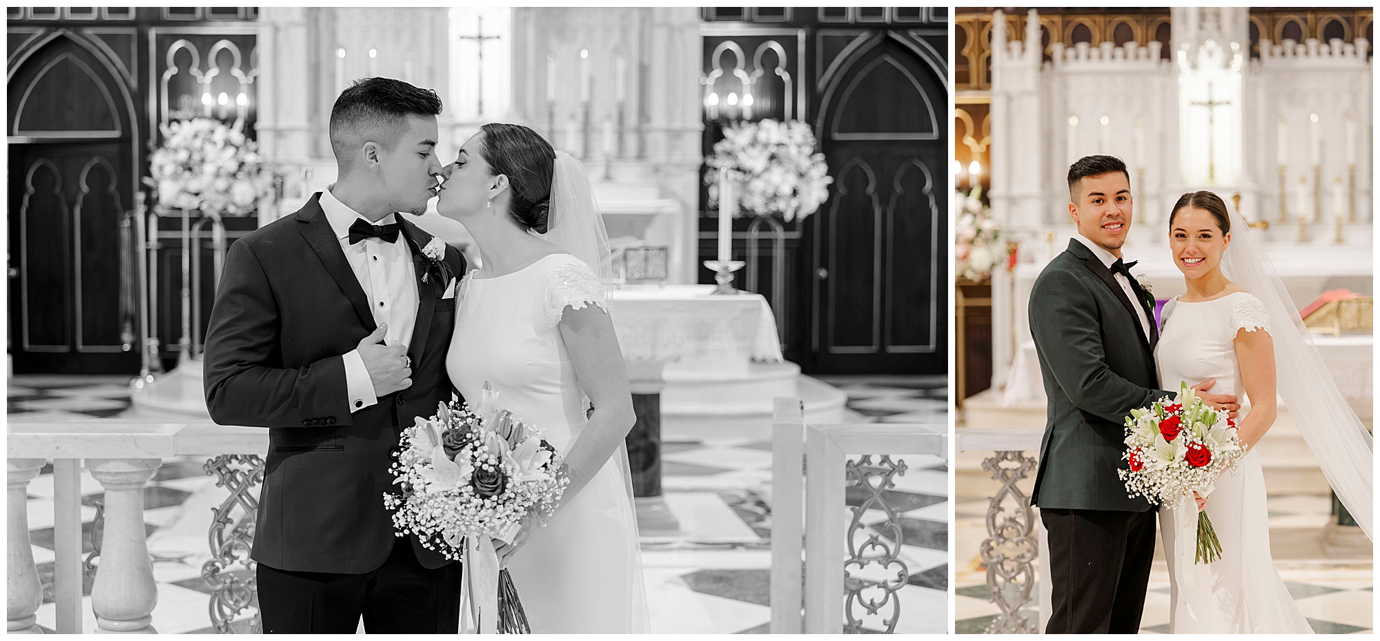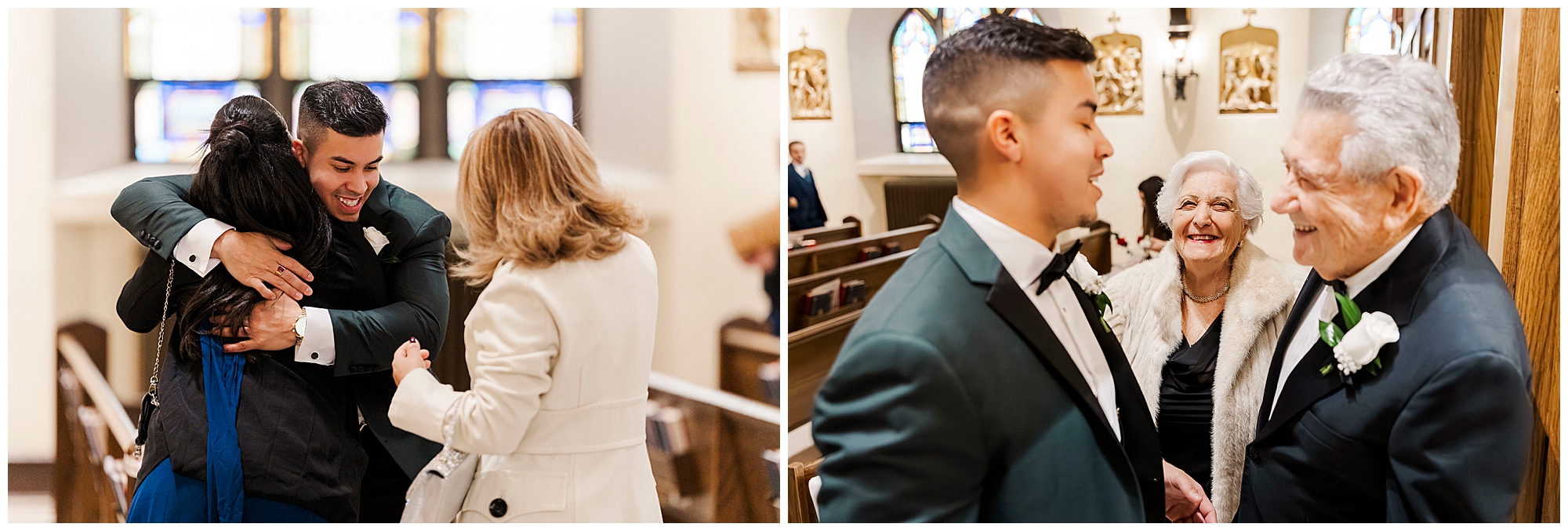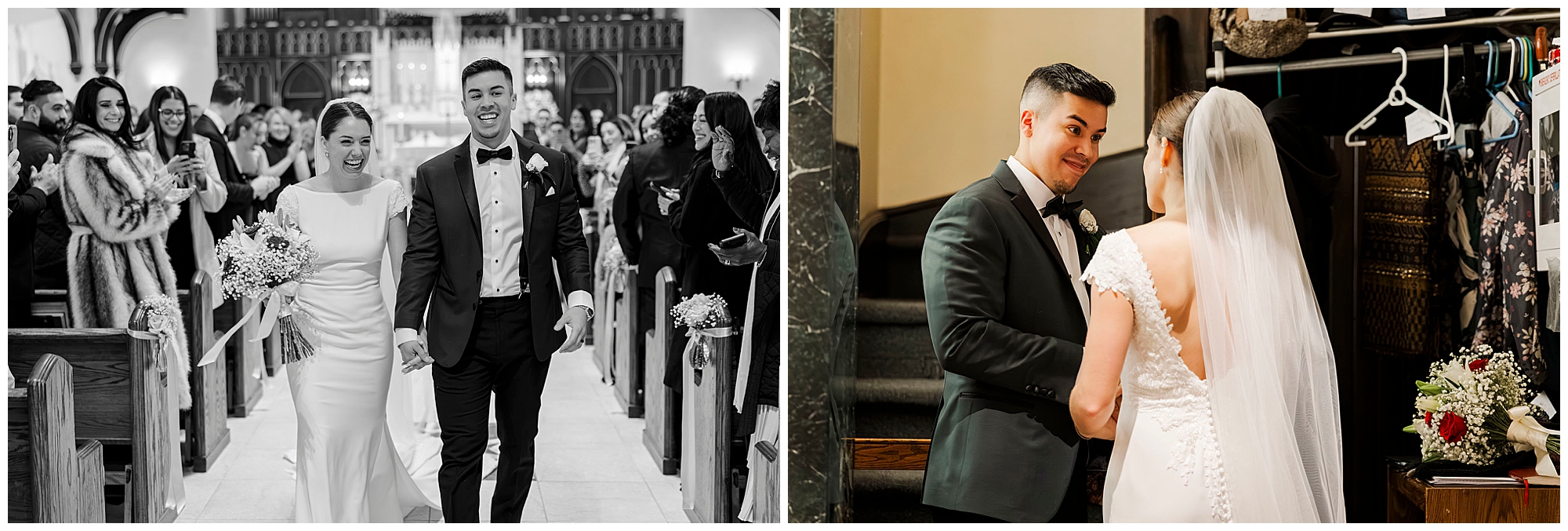 After exchanging vows, Caroline and Ernesto made a grand exit from the church. Consequently, the cheers from their guests echoed through the Poughkeepsie streets. The couple then circled back inside for family portraits at the altar. Moreover, the altar’s elegant details created a timeless setting for their family photos.