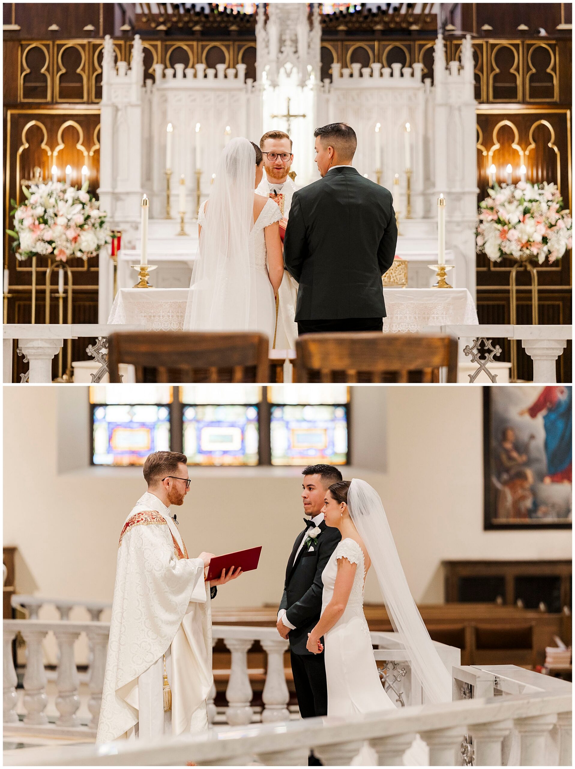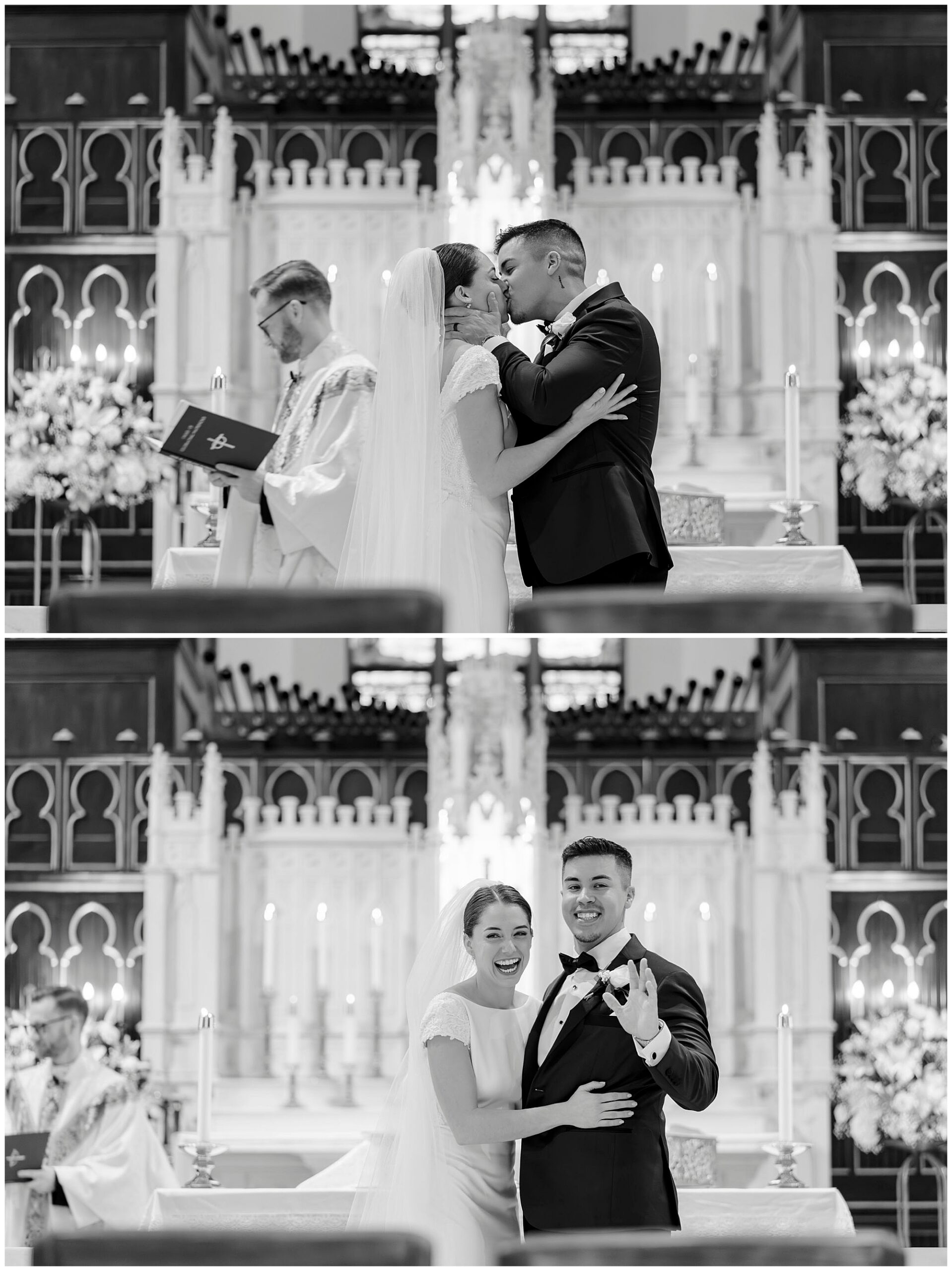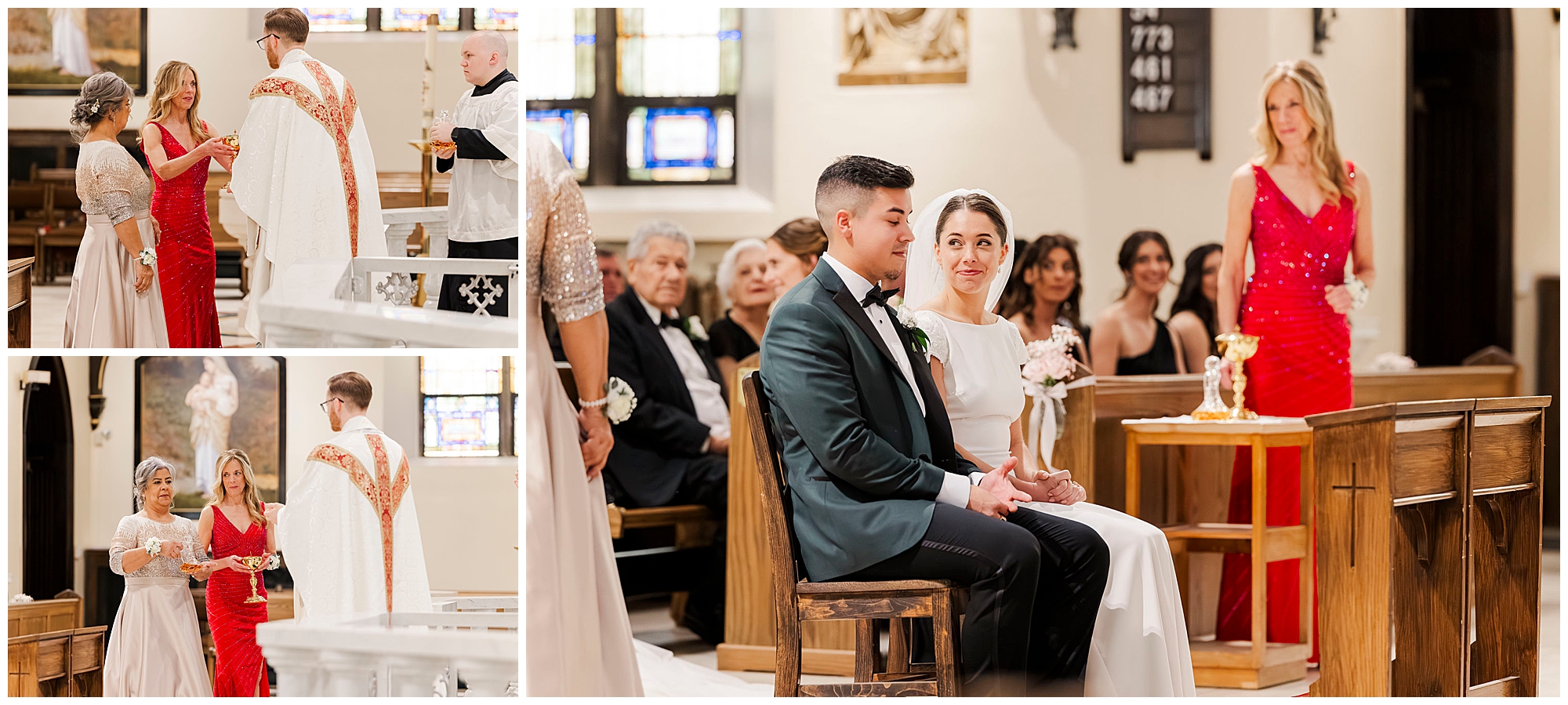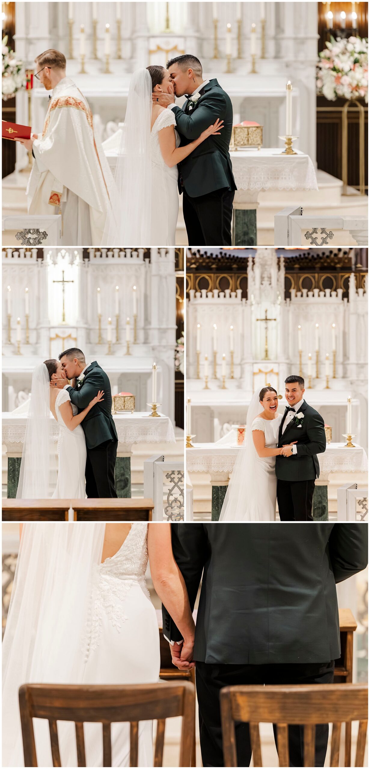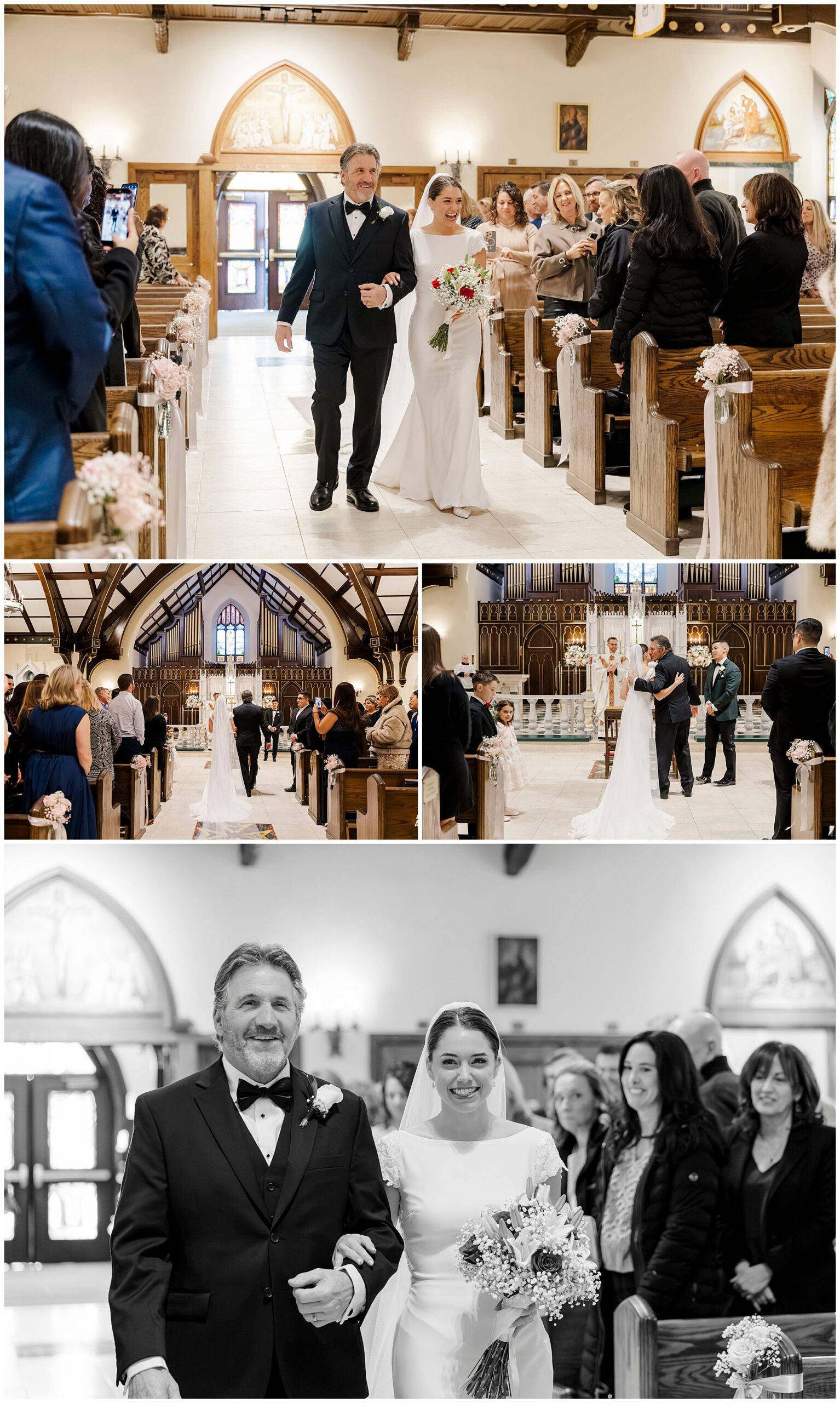 After exchanging vows, Caroline and Ernesto made a grand exit from the church. Consequently, the cheers from their guests echoed through the Poughkeepsie streets. The couple then circled back inside for family portraits at the altar. Moreover, the altar’s elegant details created a timeless setting for their family photos.