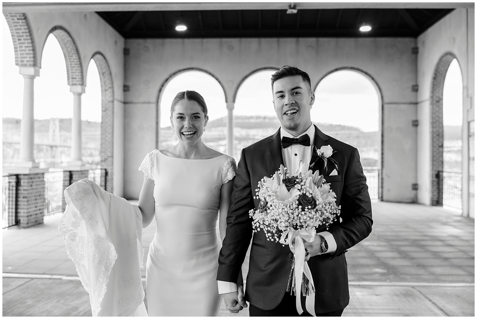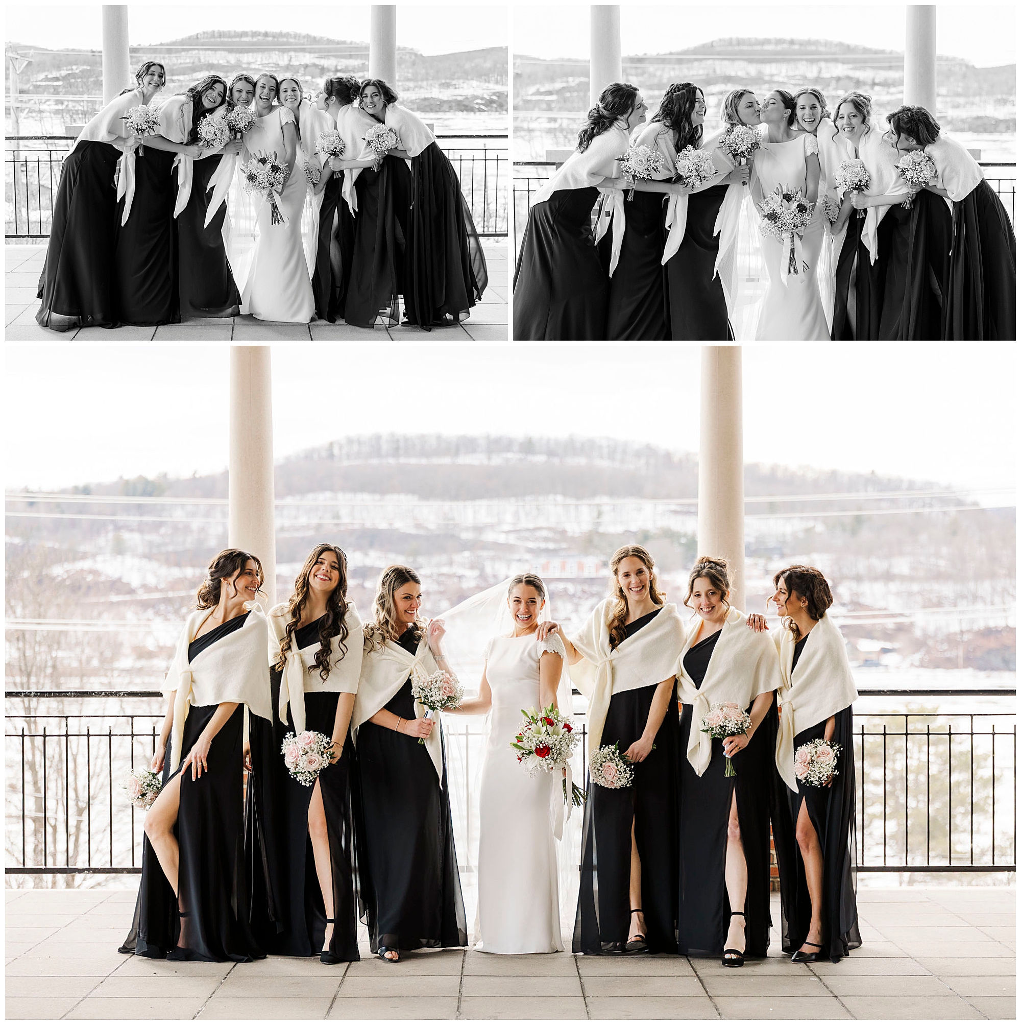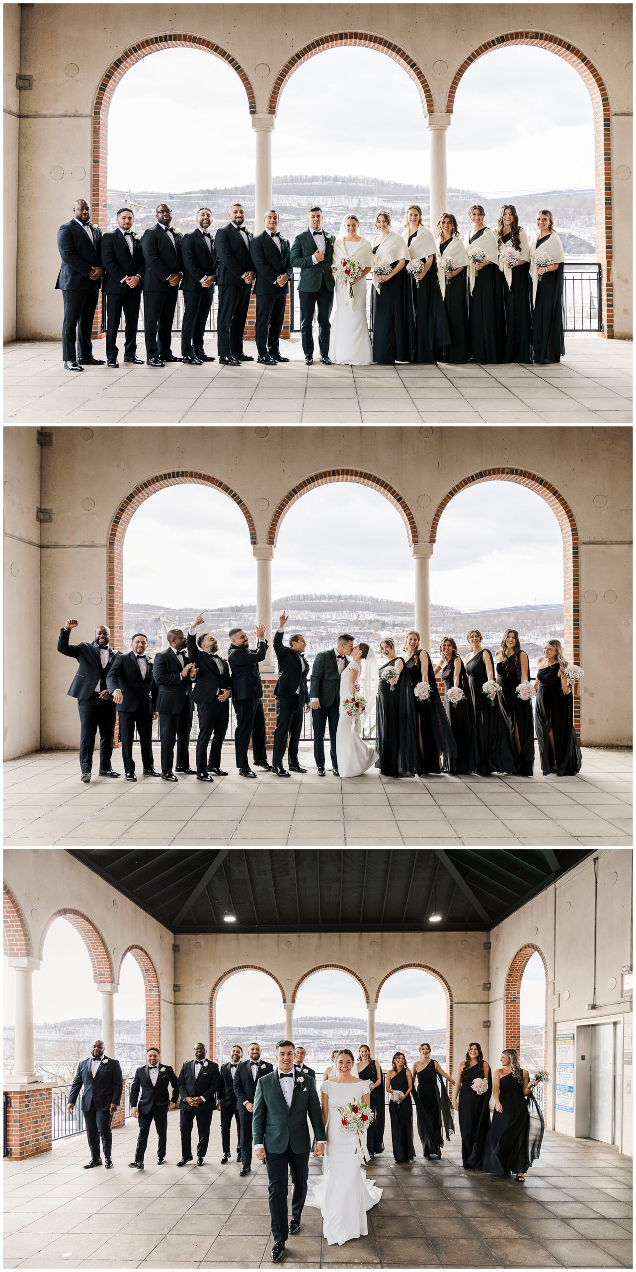 For group photos, we took the entire wedding party over to Poughkeepsie Train Station. The beautiful arches overlooking the Hudson River provided a breathtaking backdrop for everyone involved. In addition, this iconic and historic location is one of our favorite spots as a Beacon-based photography team. The Poughkeepsie train station wedding portraits turned out absolutely incredible and stunning.