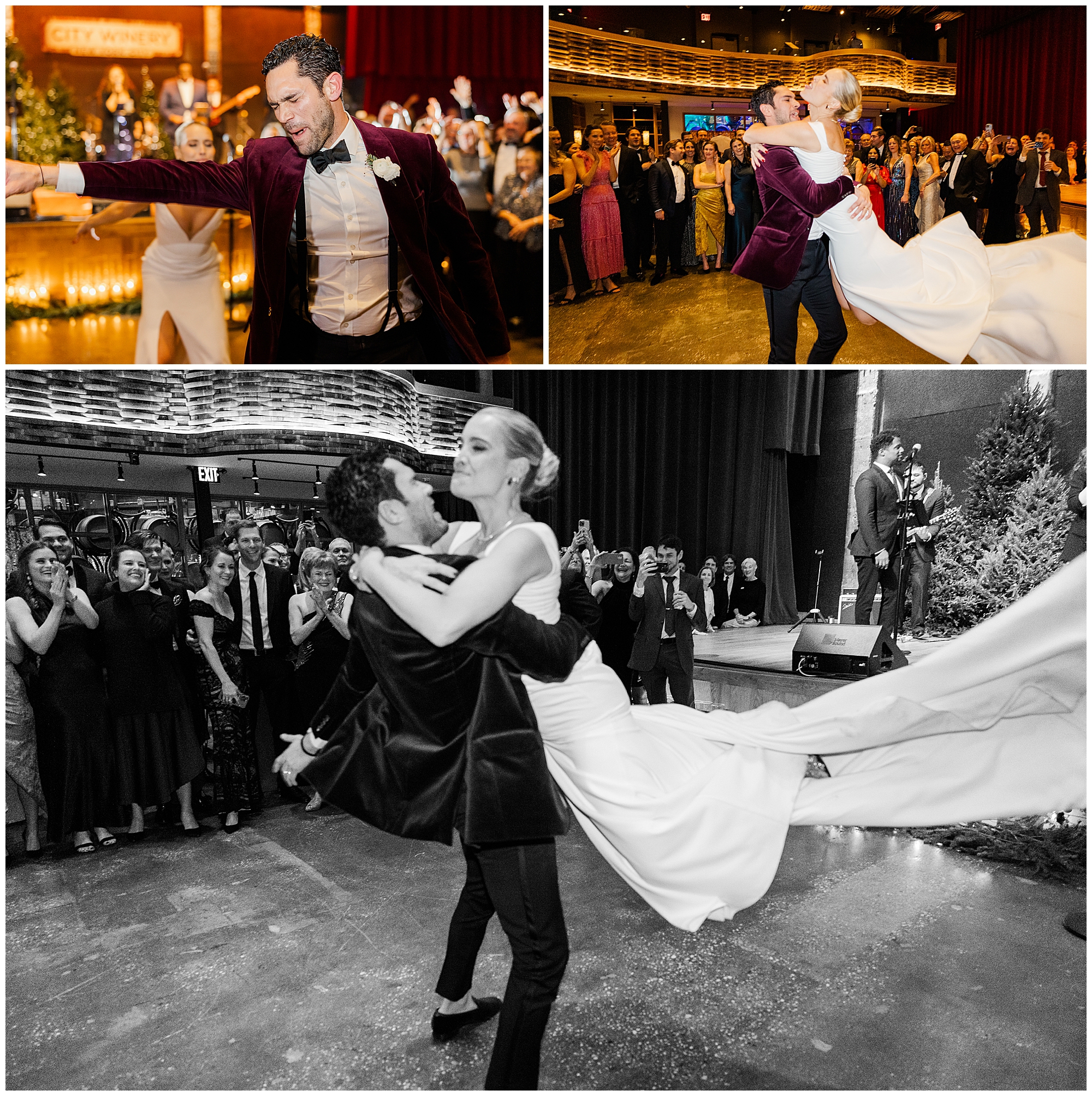 The reception at City Winery was full of laughter, dancing, and heartfelt moments. The Storytellers Band set the tone for the night with an incredible mix of live music that kept everyone on the dance floor. Sam and Nico’s design aesthetic leaned into the winter season with a rich, moody palette of greens and golds. The floral arrangements from Ivie Joy Flowers added warmth and elegance to the space. Every table was softly lit by candles, creating a cozy glow that reflected the couple’s vision perfectly.