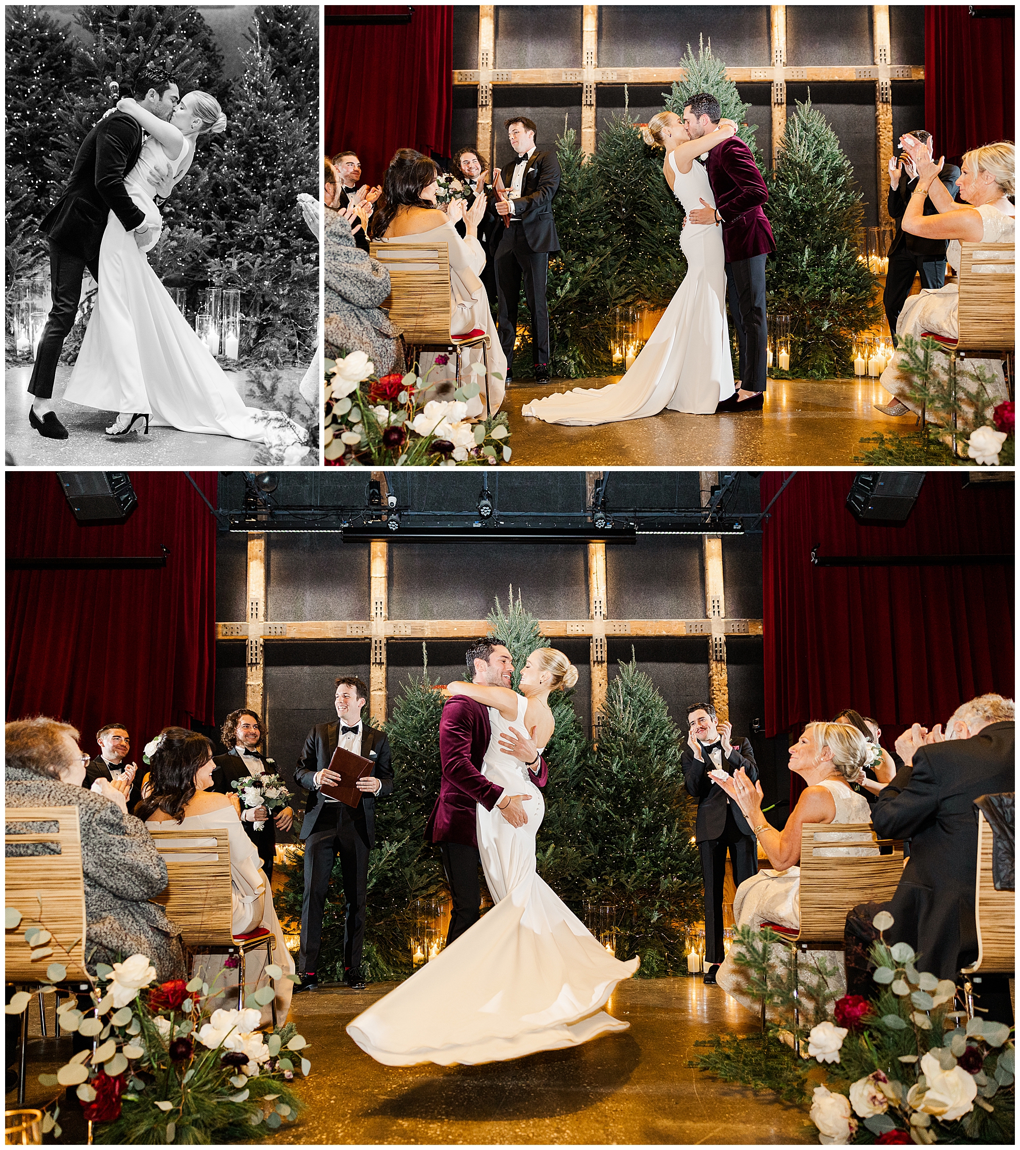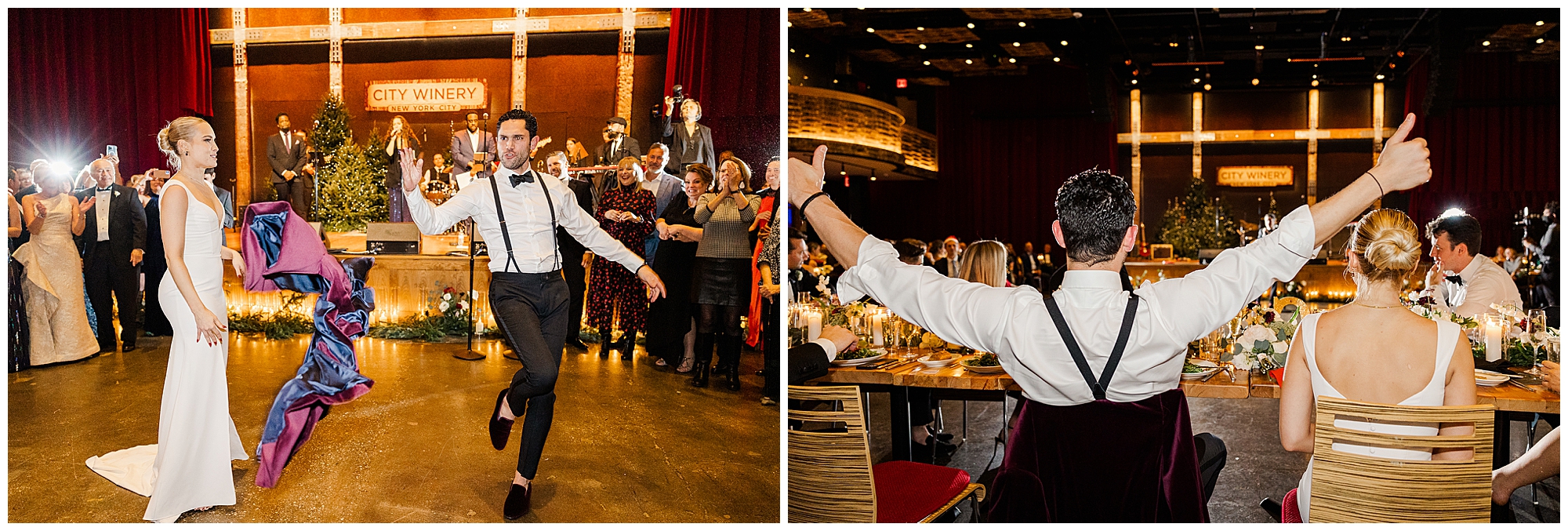 City Winery Manhattan is one of the most spectacular waterfront venues in New York. The space features a mix of rustic and modern design with wood accents, high ceilings, and floor-to-ceiling windows overlooking the Hudson River. The natural light creates an inviting glow, even on winter days. Having photographed many celebrations at City Winery Hudson Valley, we immediately recognized the familiar warmth and character this venue offers. Sam and Nico’s ceremony took place surrounded by twinkling Christmas trees and glowing candlelight, setting a romantic and festive atmosphere.