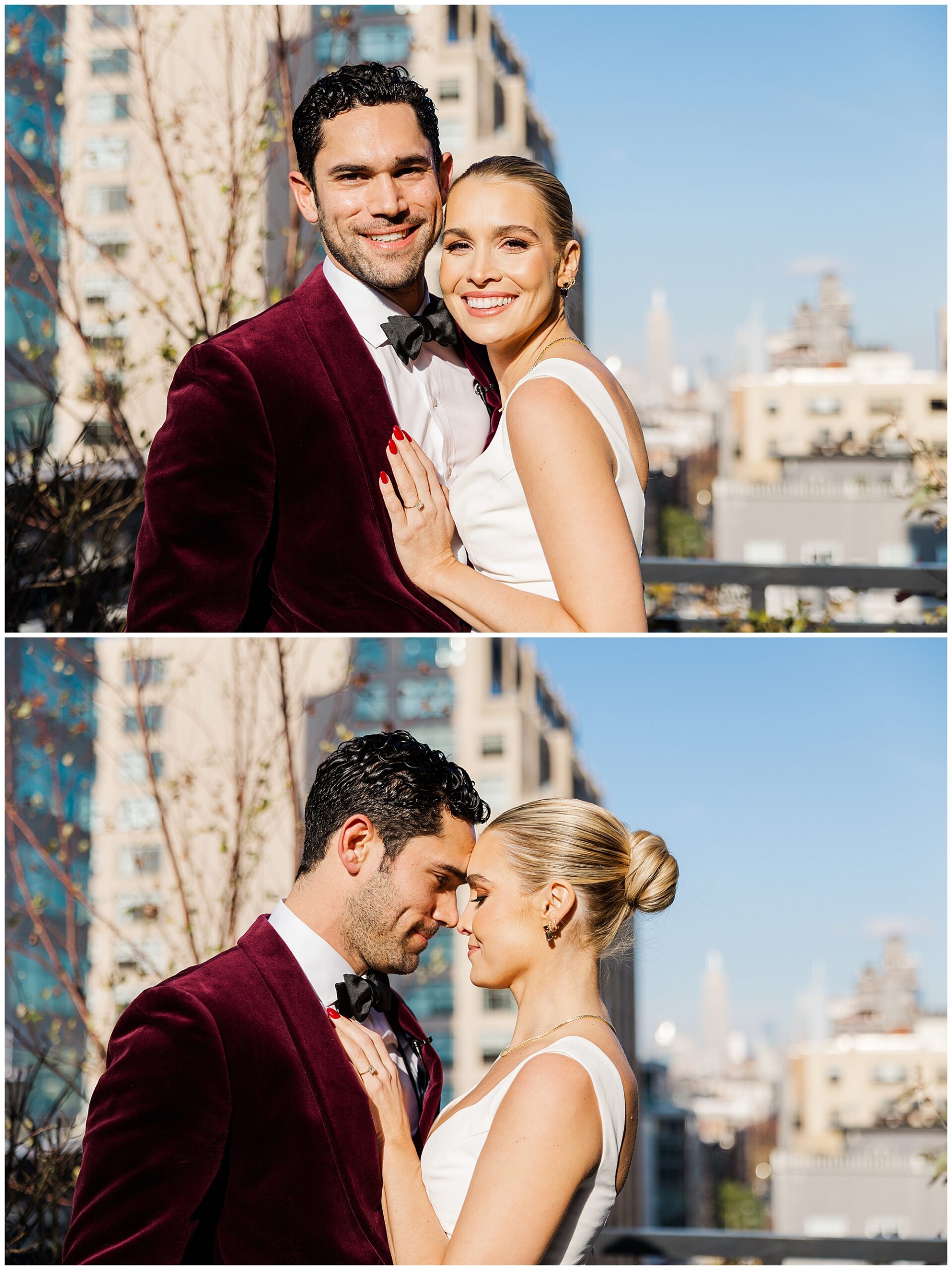 Before heading to their City Winery Manhattan wedding, Sam and Nico shared a first look on the terrace of the Soho Grand. The sun was shining, the winter air was crisp, and the moment was filled with emotion. Seeing each other for the first time brought genuine tears and smiles. Choosing to do a first look gave them precious quiet time together before the celebration. It also allowed them to take many of their portraits early, ensuring they could fully enjoy cocktail hour later.