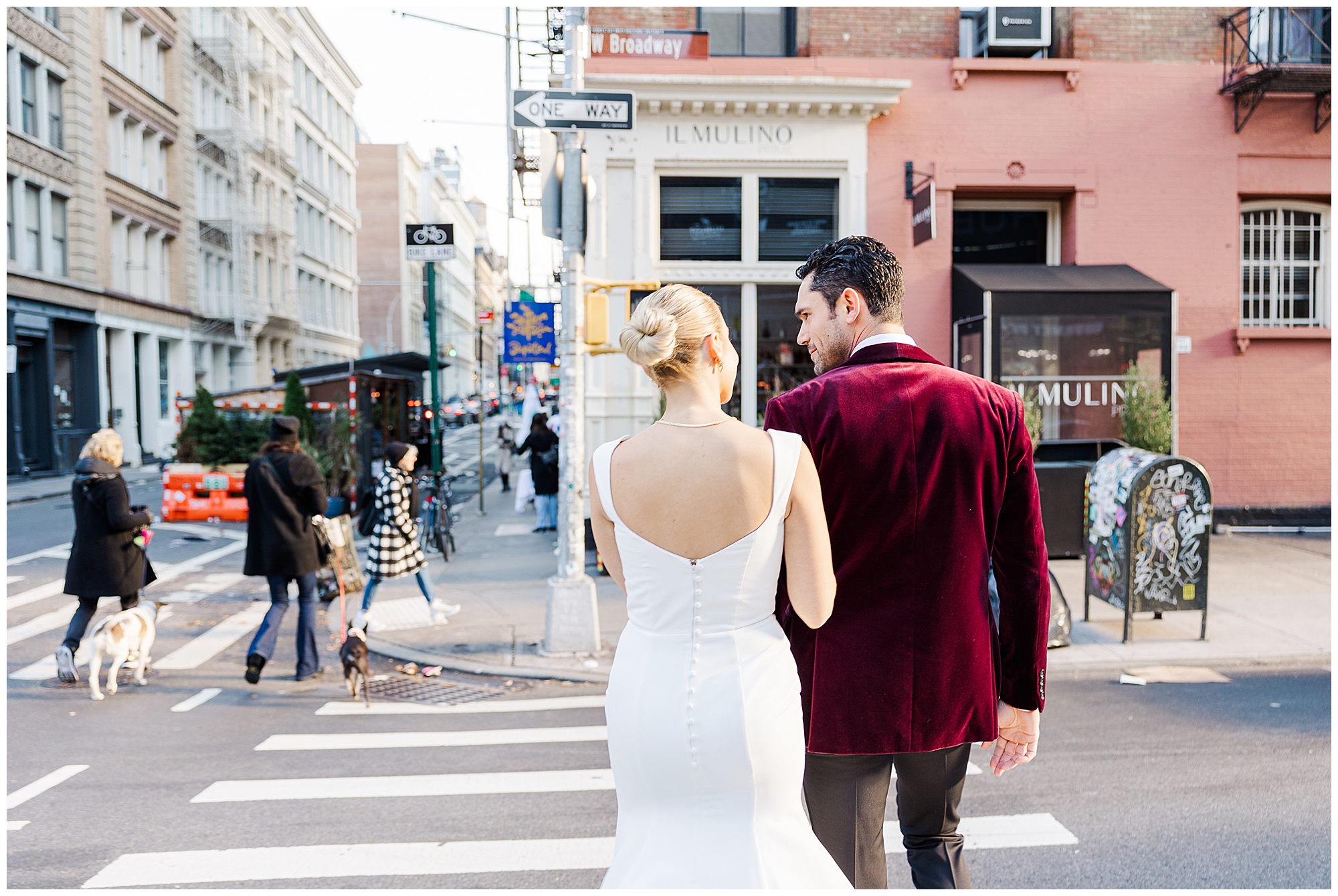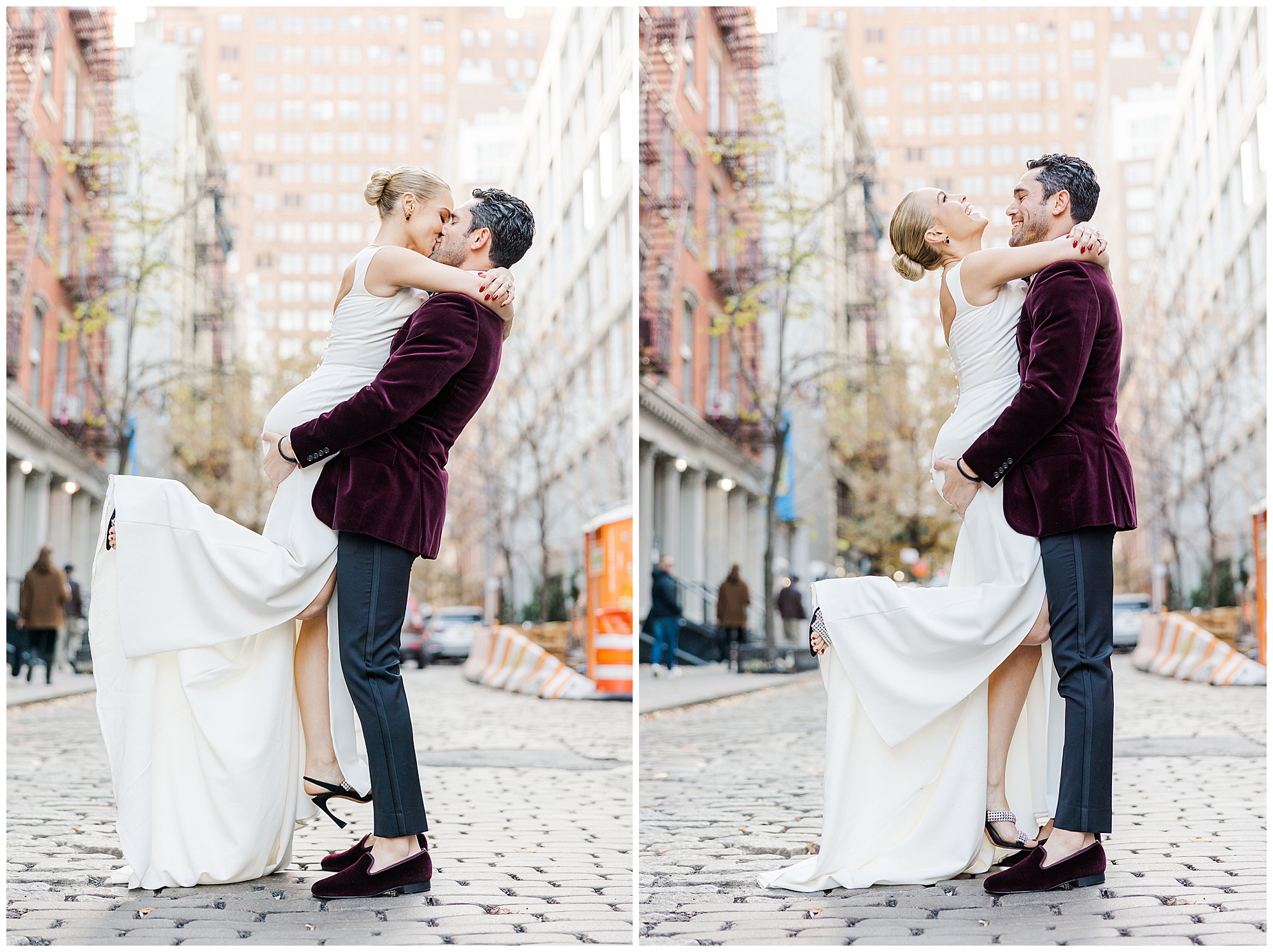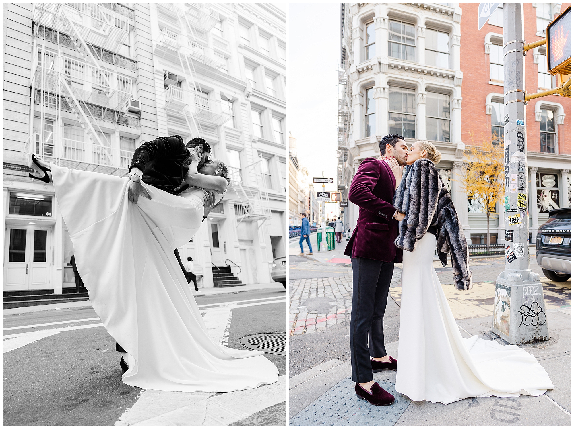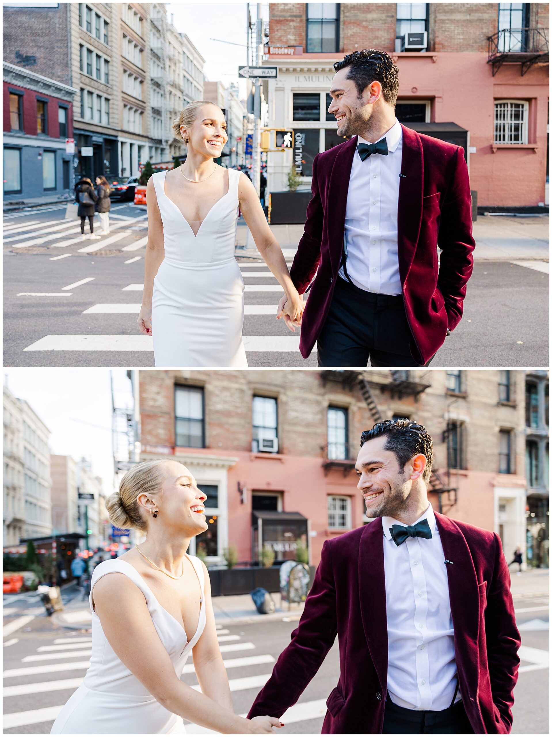 After their first look, we explored the surrounding Soho streets for portraits. The cobblestone roads, chic storefronts, and classic architecture created a timeless New York backdrop. Sam and Nico were effortless together, laughing and holding hands as we documented every candid moment. As Hudson Valley wedding photographers, we love these in-between moments that feel natural and full of life. Their connection came through beautifully in every frame, setting the tone for the rest of their City Winery Manhattan wedding day.