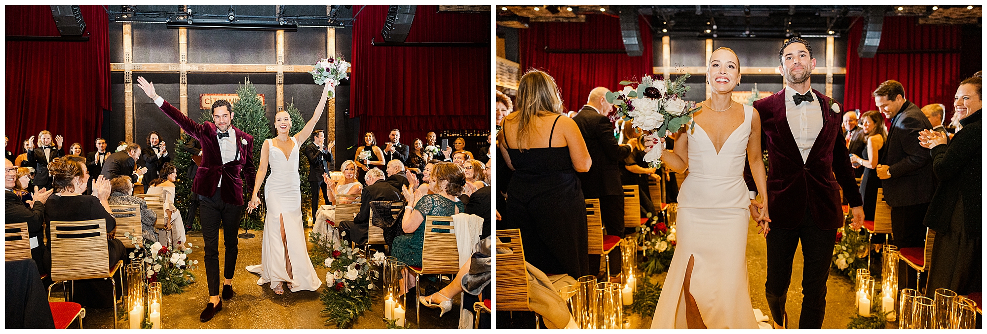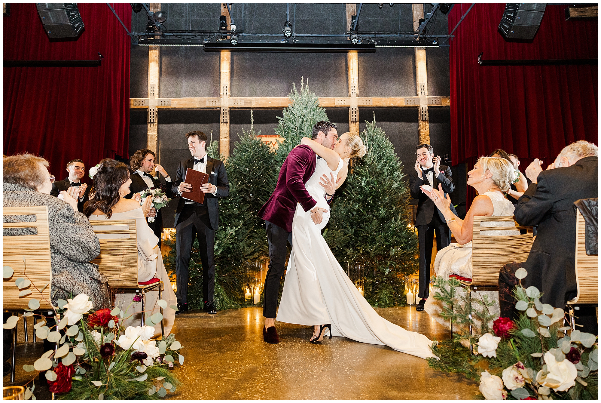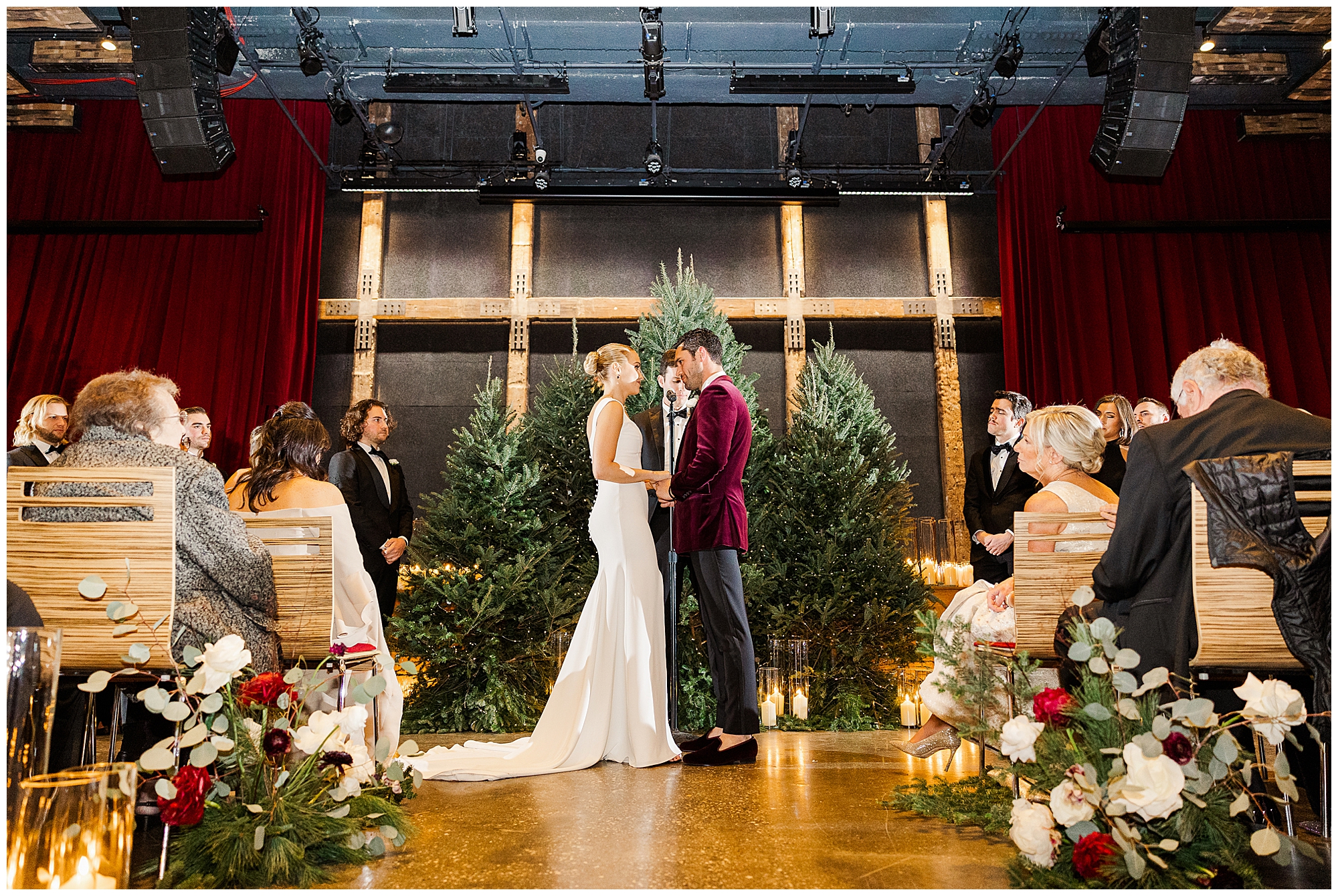 City Winery Manhattan is one of the most spectacular waterfront venues in New York. The space features a mix of rustic and modern design with wood accents, high ceilings, and floor-to-ceiling windows overlooking the Hudson River. The natural light creates an inviting glow, even on winter days. Having photographed many celebrations at City Winery Hudson Valley, we immediately recognized the familiar warmth and character this venue offers. Sam and Nico’s ceremony took place surrounded by twinkling Christmas trees and glowing candlelight, setting a romantic and festive atmosphere.