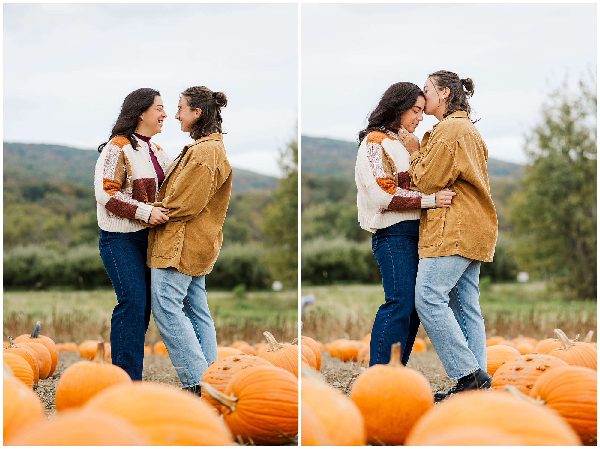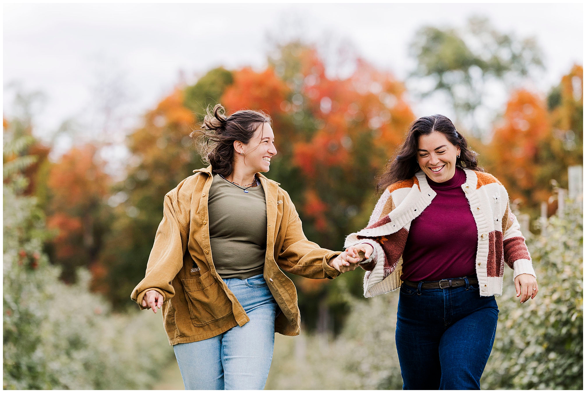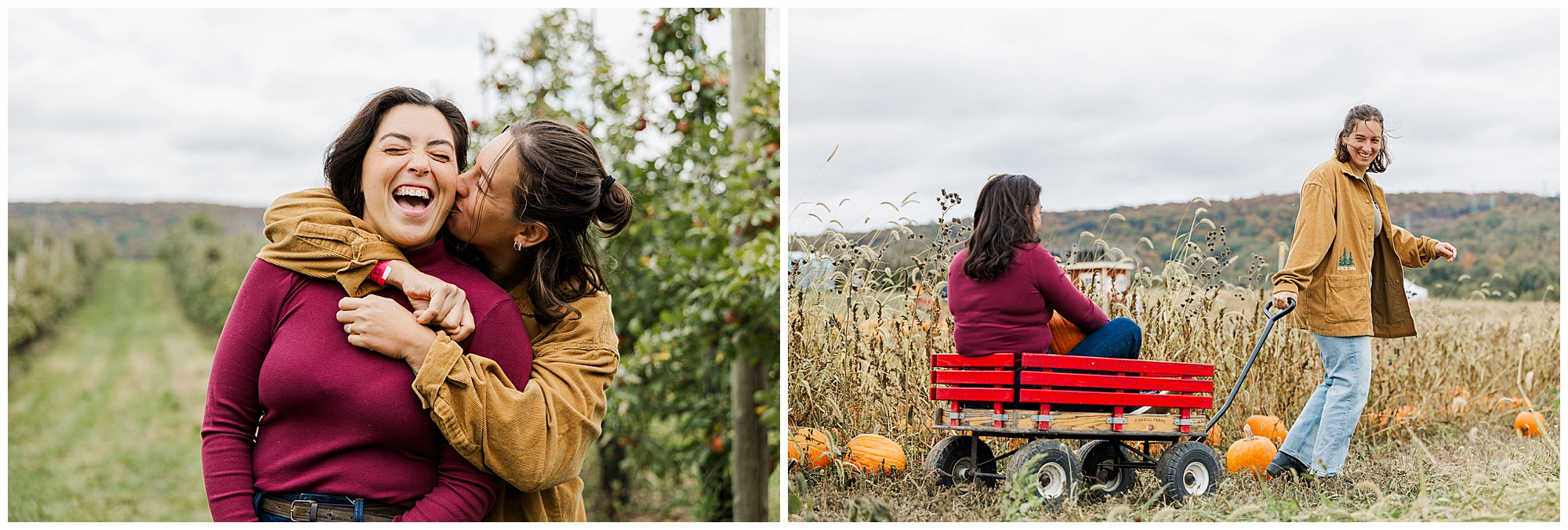 Our work as Beacon wedding photographers centers around natural connection and storytelling. We use gentle direction so couples feel comfortable and present. During Emma and Claire’s session, we leaned into the overcast lighting, using the orchards as both backdrop and story element. Every Fishkill Farms engagement session has its own rhythm, shaped by laughter and the movement of the day.