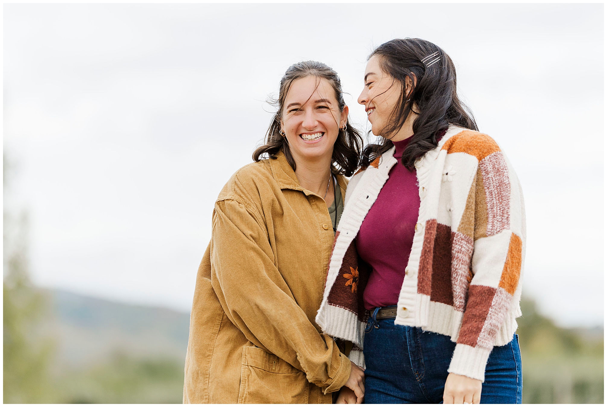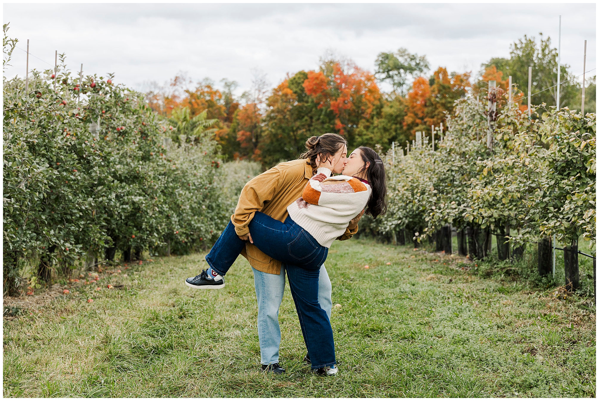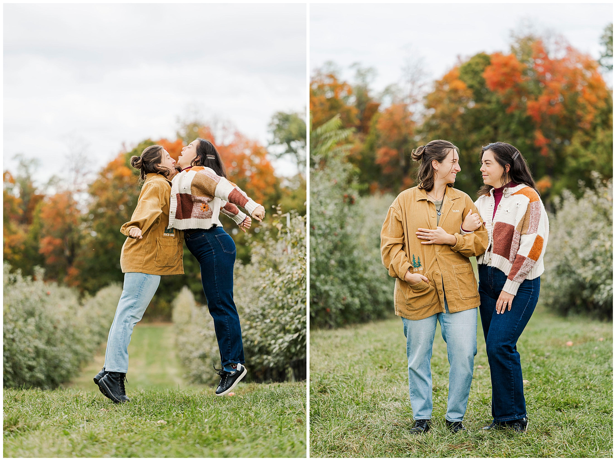 Our work as Beacon wedding photographers centers around natural connection and storytelling. We use gentle direction so couples feel comfortable and present. During Emma and Claire’s session, we leaned into the overcast lighting, using the orchards as both backdrop and story element. Every Fishkill Farms engagement session has its own rhythm, shaped by laughter and the movement of the day.