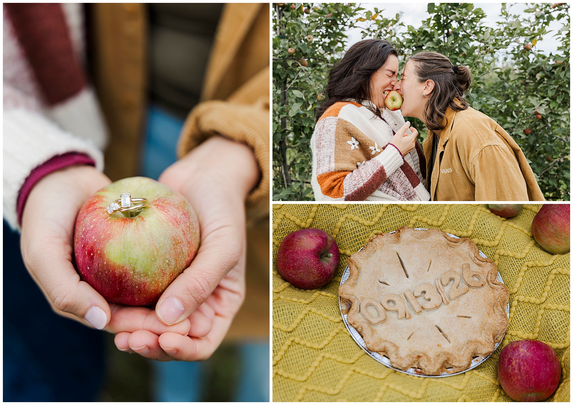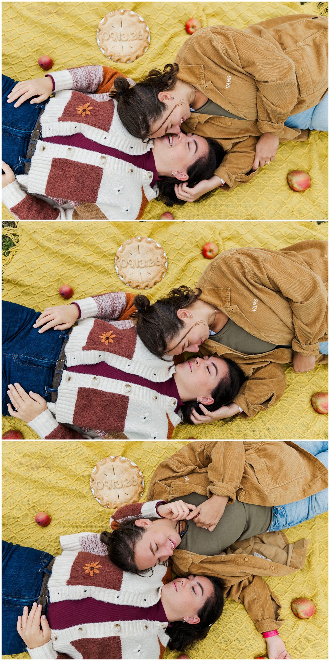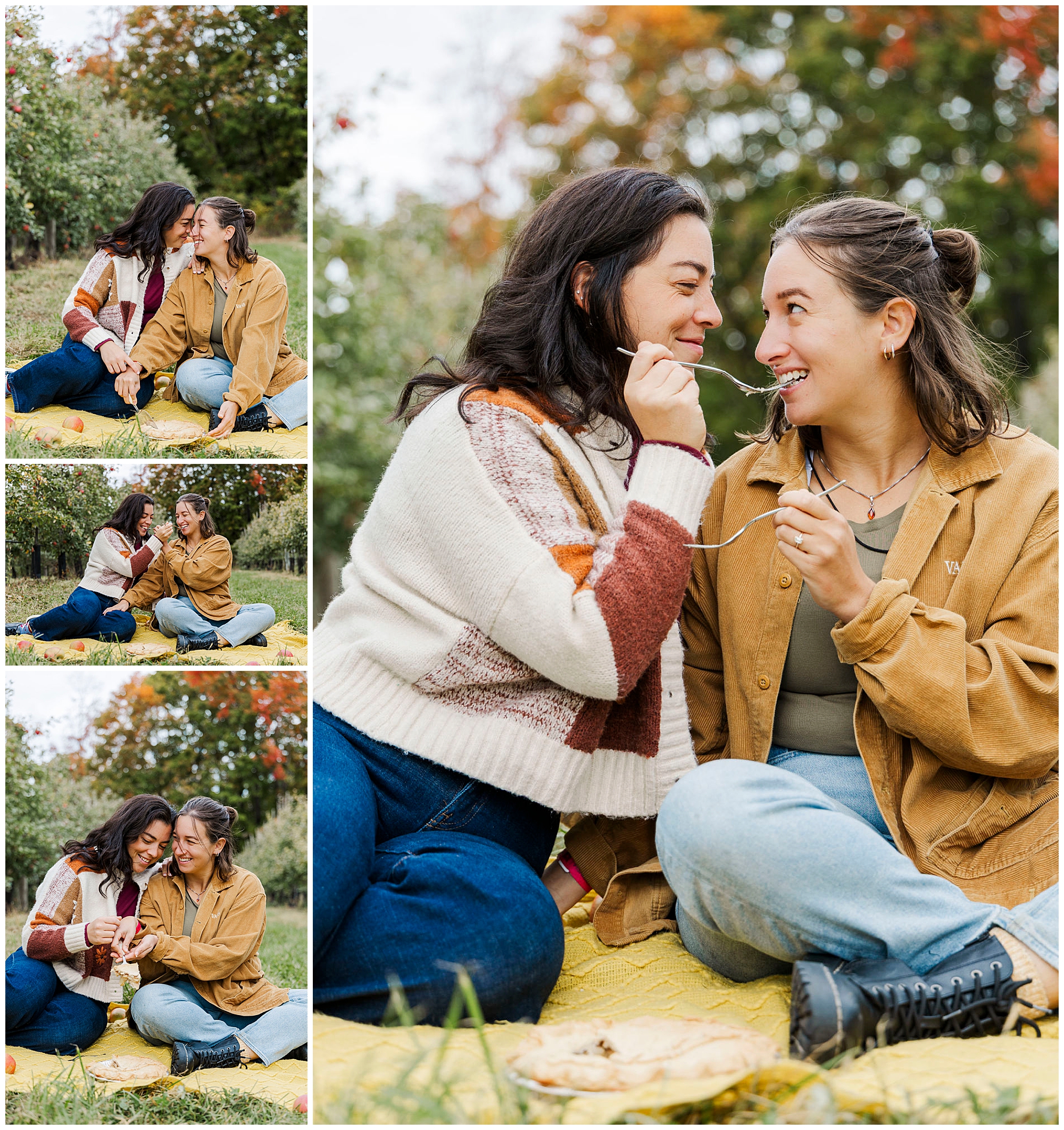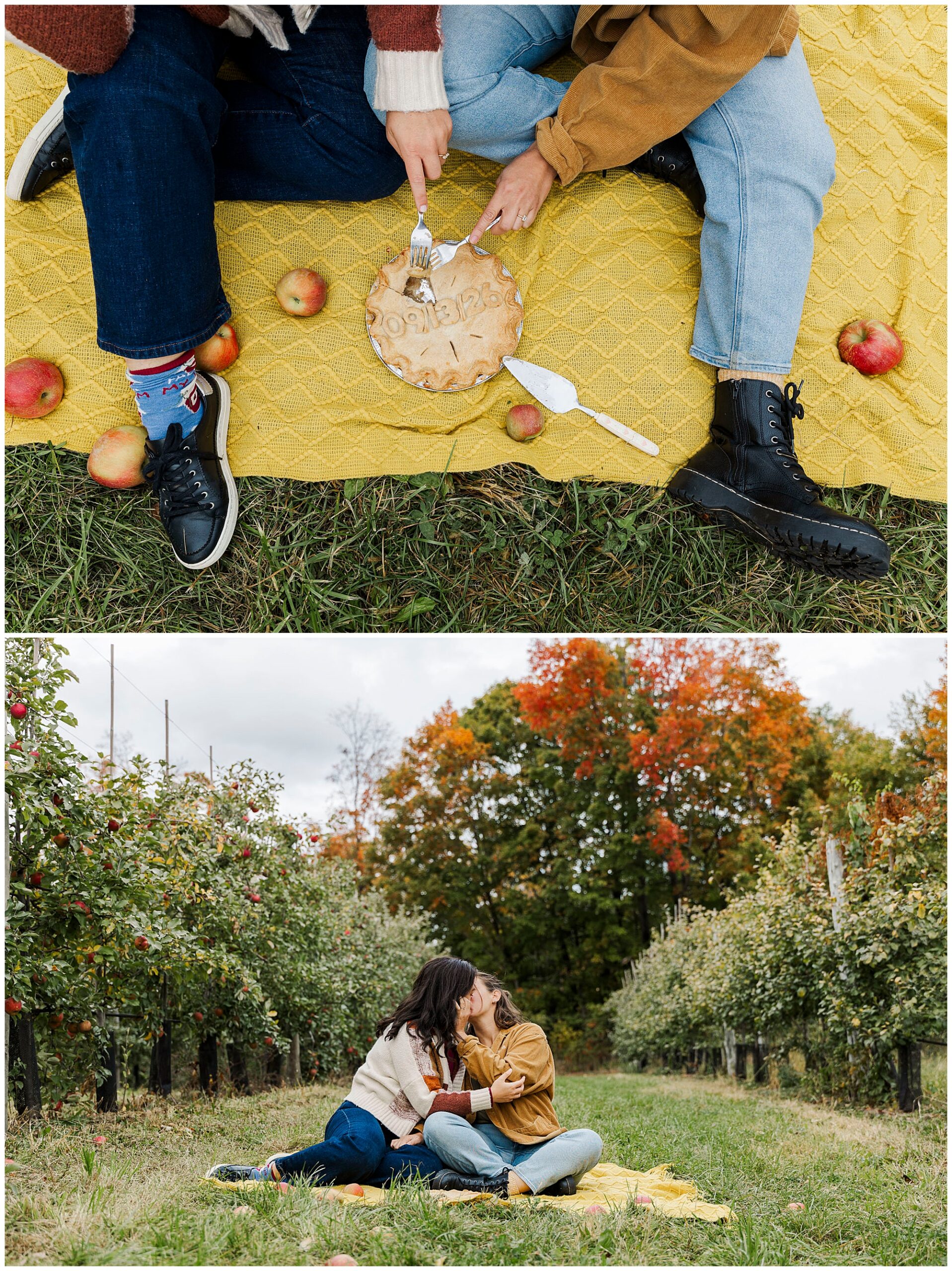 Once the apple baskets were full, these two took a break with an apple pie from Noble Pies Beacon. The pie had their wedding date written on top — such a sweet touch. They spread out a cozy blanket right between the trees and shared slices of pie together. This part of their Fishkill Farms engagement session felt extra special. It was calm and intimate, surrounded by nothing but orchards and soft autumn light.