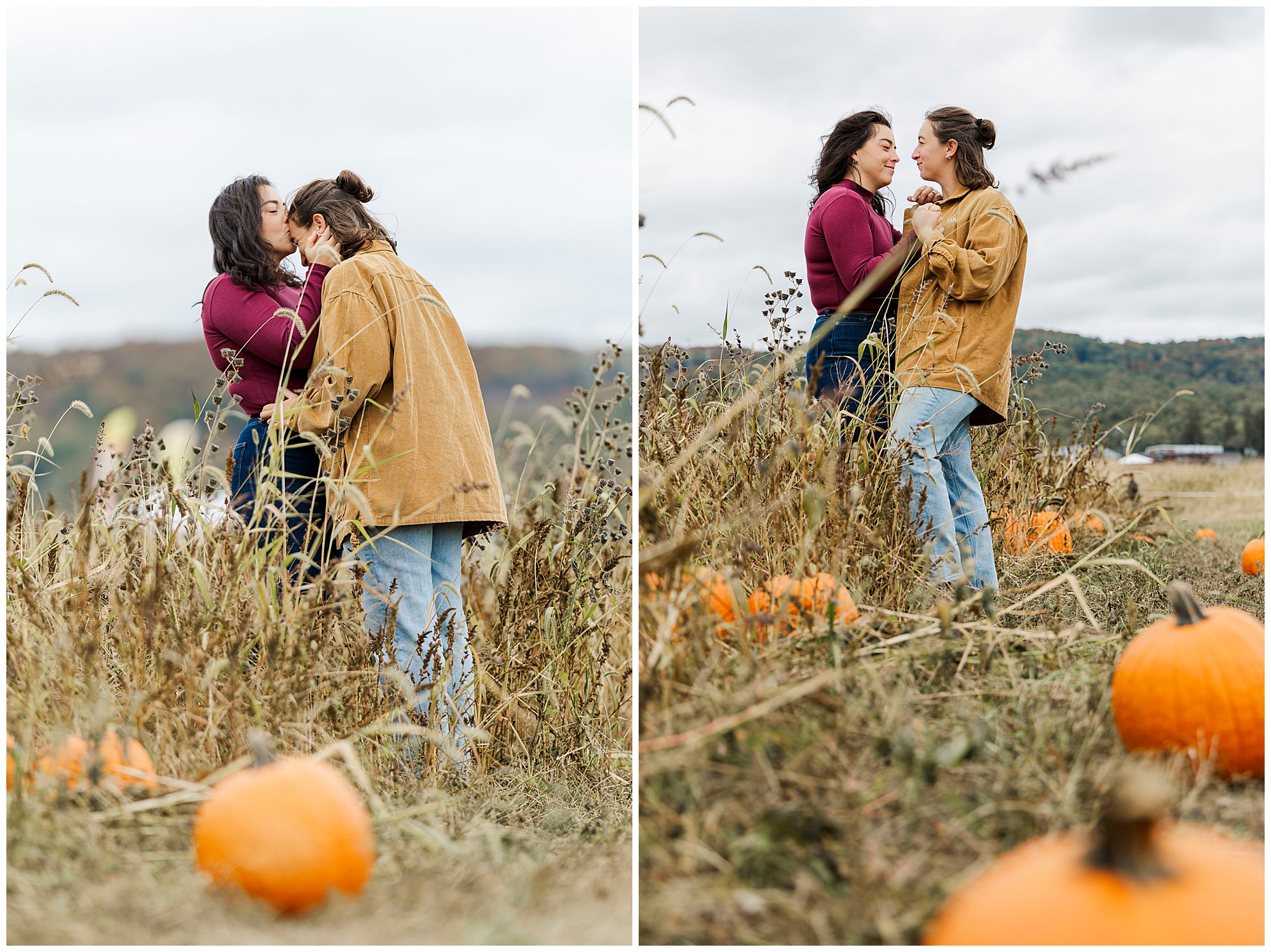 This overcast autumnal day was the perfect choice for their engagement photo shoot. Emma and Claire held each other, surrounded by the very place where they had spent the morning celebrating their love. Their Fishkill Farms engagement is a reminder that the best photos come from genuine moments, captured with care and intention.