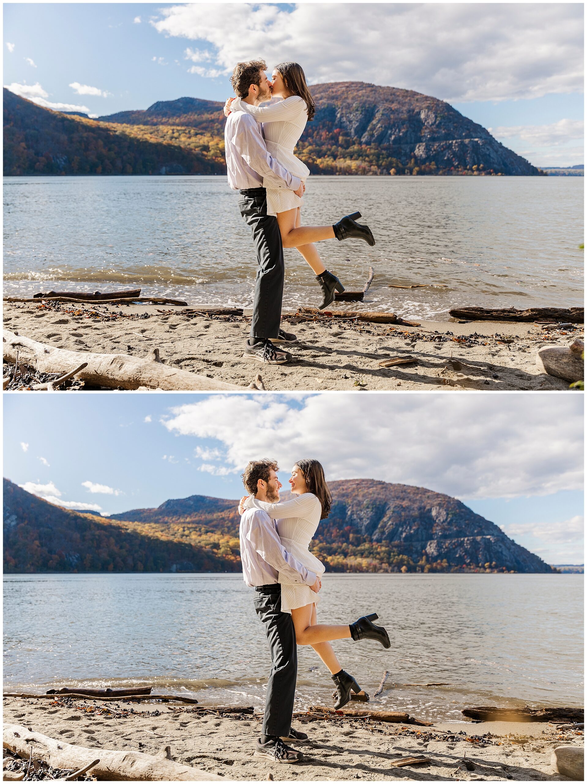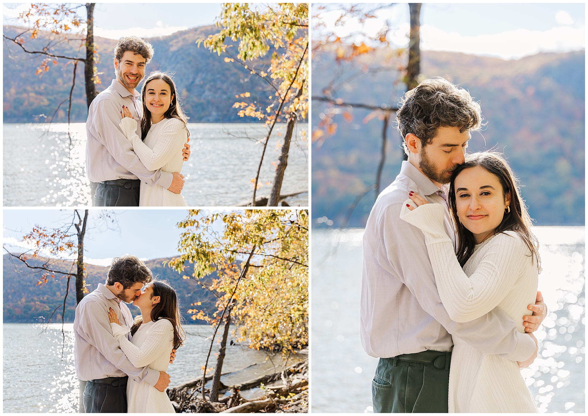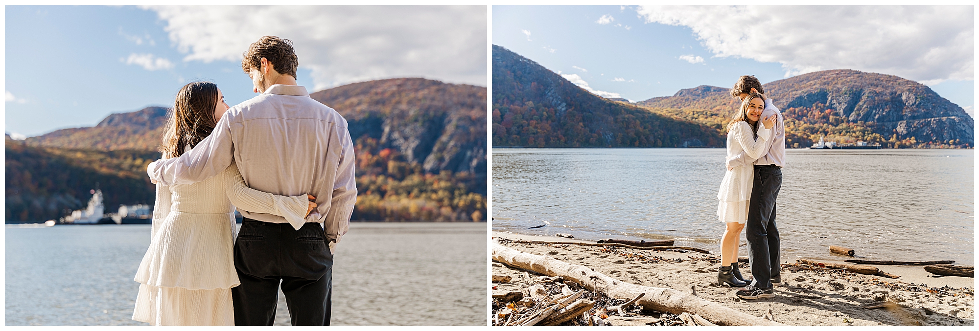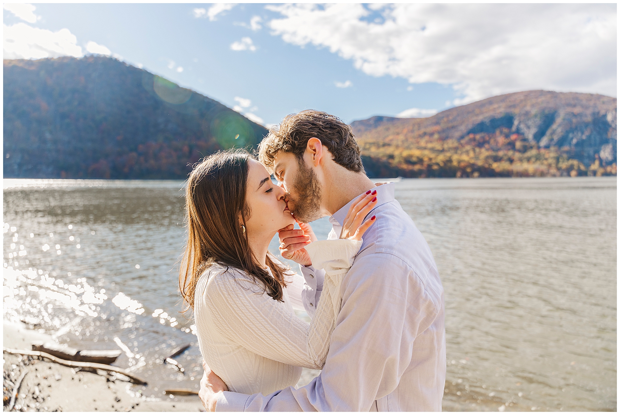 To close the session, we make our way to the beach by the water. The river glows with the reflection of the setting sun, wrapping the couple in warm light. These final images feel romantic and serene, capturing the peaceful energy of the day. It’s moments like these that remind us why we love photographing fall engagement sessions in the Hudson Valley.