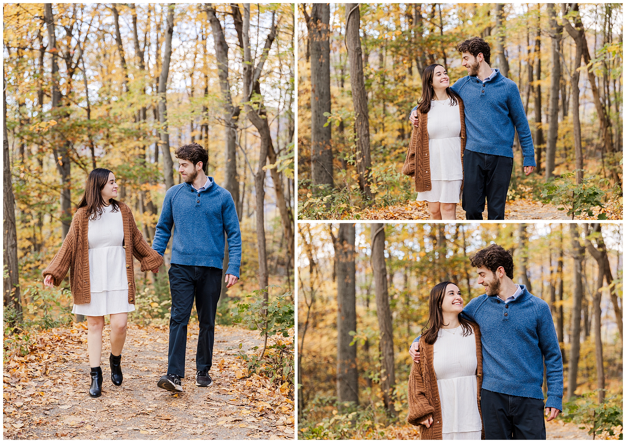 We begin the session at the overlook, where the views stretch across the Hudson River. The distant mountains and golden leaves frame Monica and Jarred beautifully. From there, we move along the forest trails, surrounded by warm tones and soft textures. Each step reveals something new, from sunlit clearings to quiet shaded paths that feel intimate and cozy.