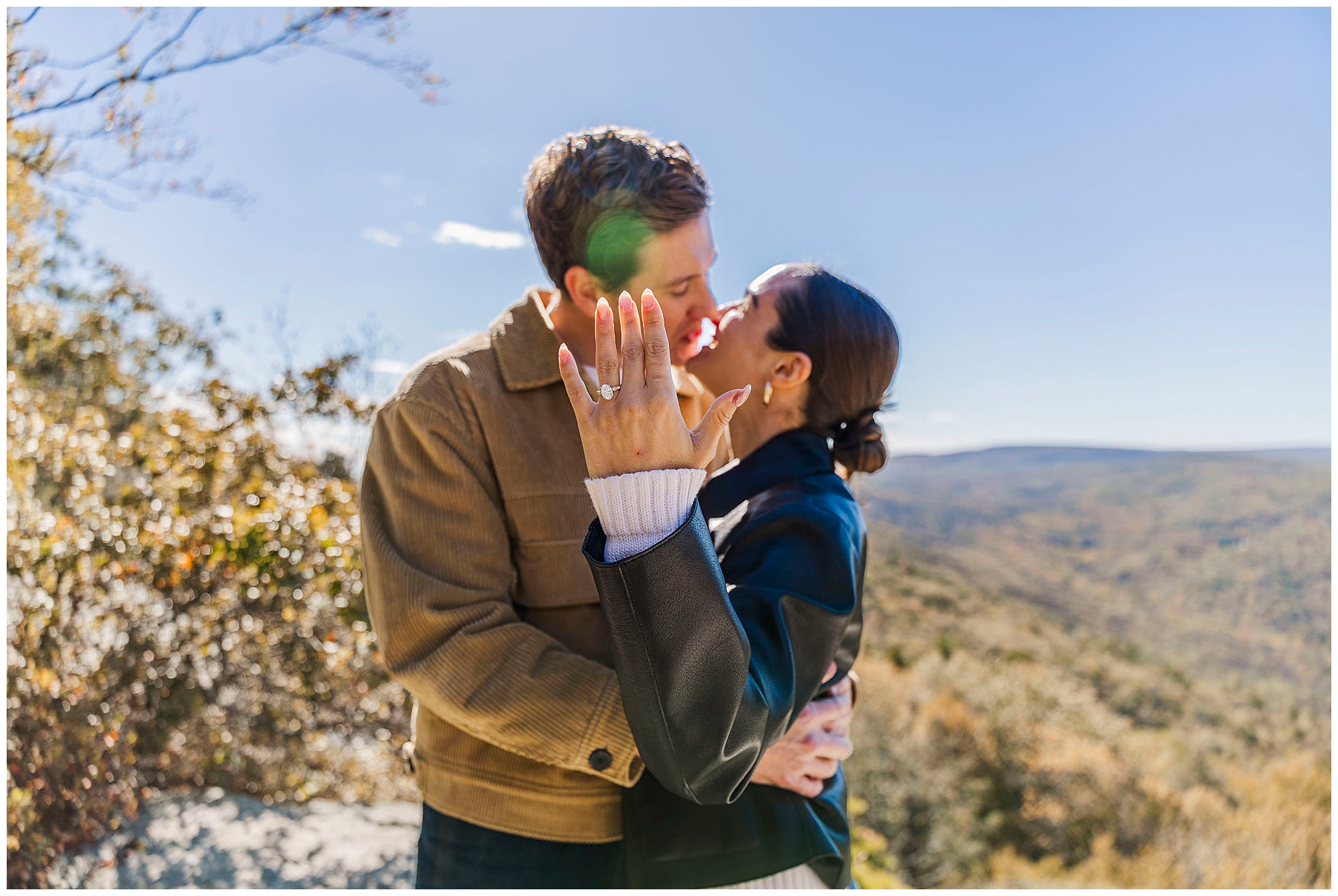 After Bianca says yes, they take a few quiet moments together to process everything. The air feels calm, filled with relief and joy. Then we transition into portraits, using Cope’s Lookout as the first backdrop. The cliffs and forest views create an incredible sense of depth and warmth. Every corner of the Mohonk property feels like it was designed for romance.