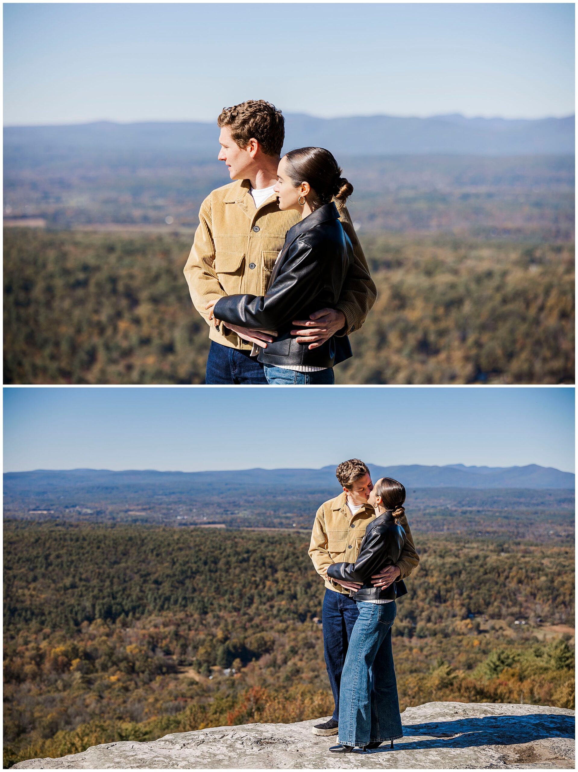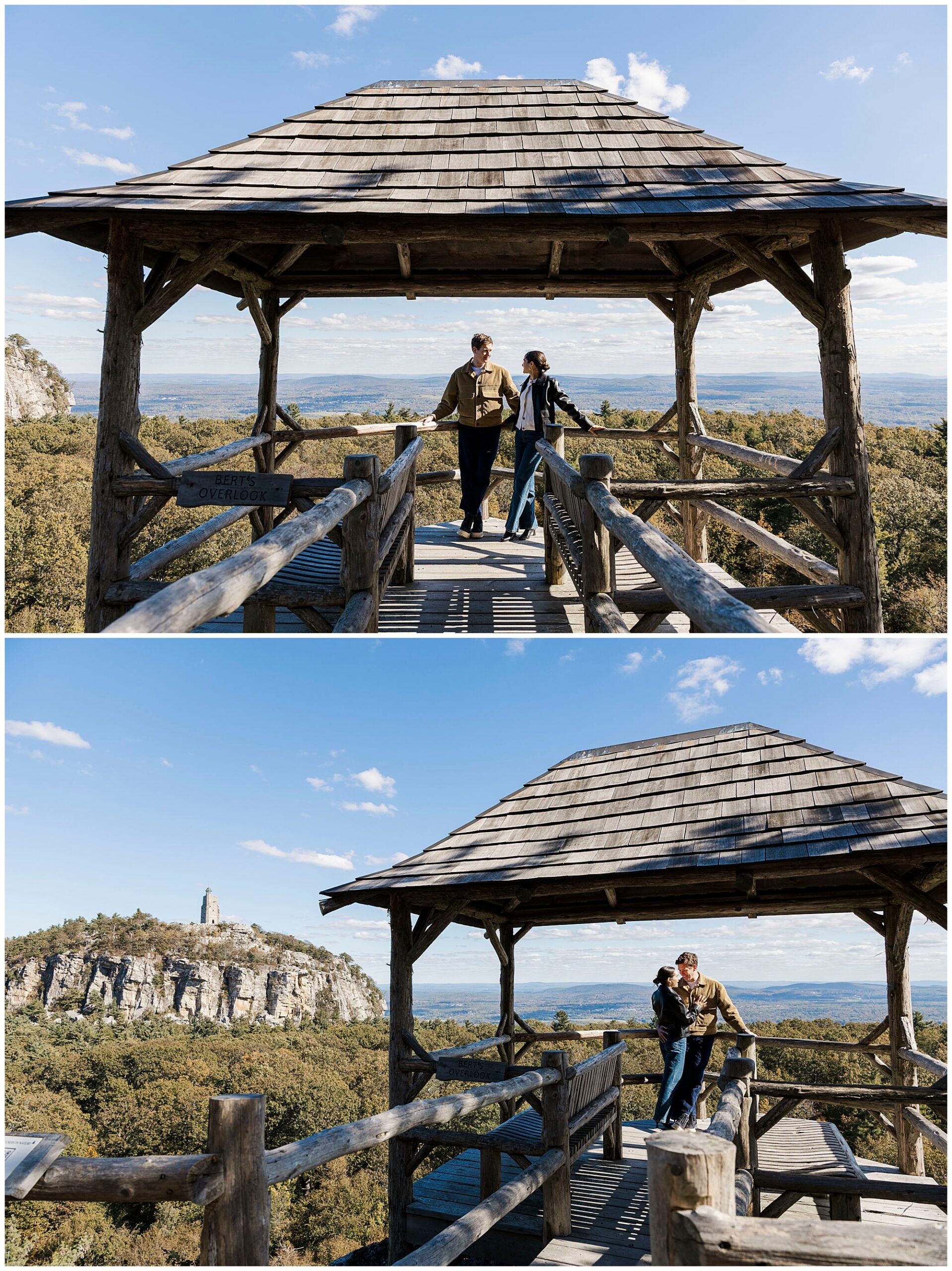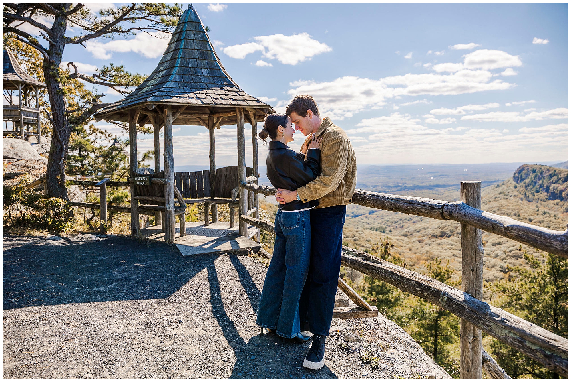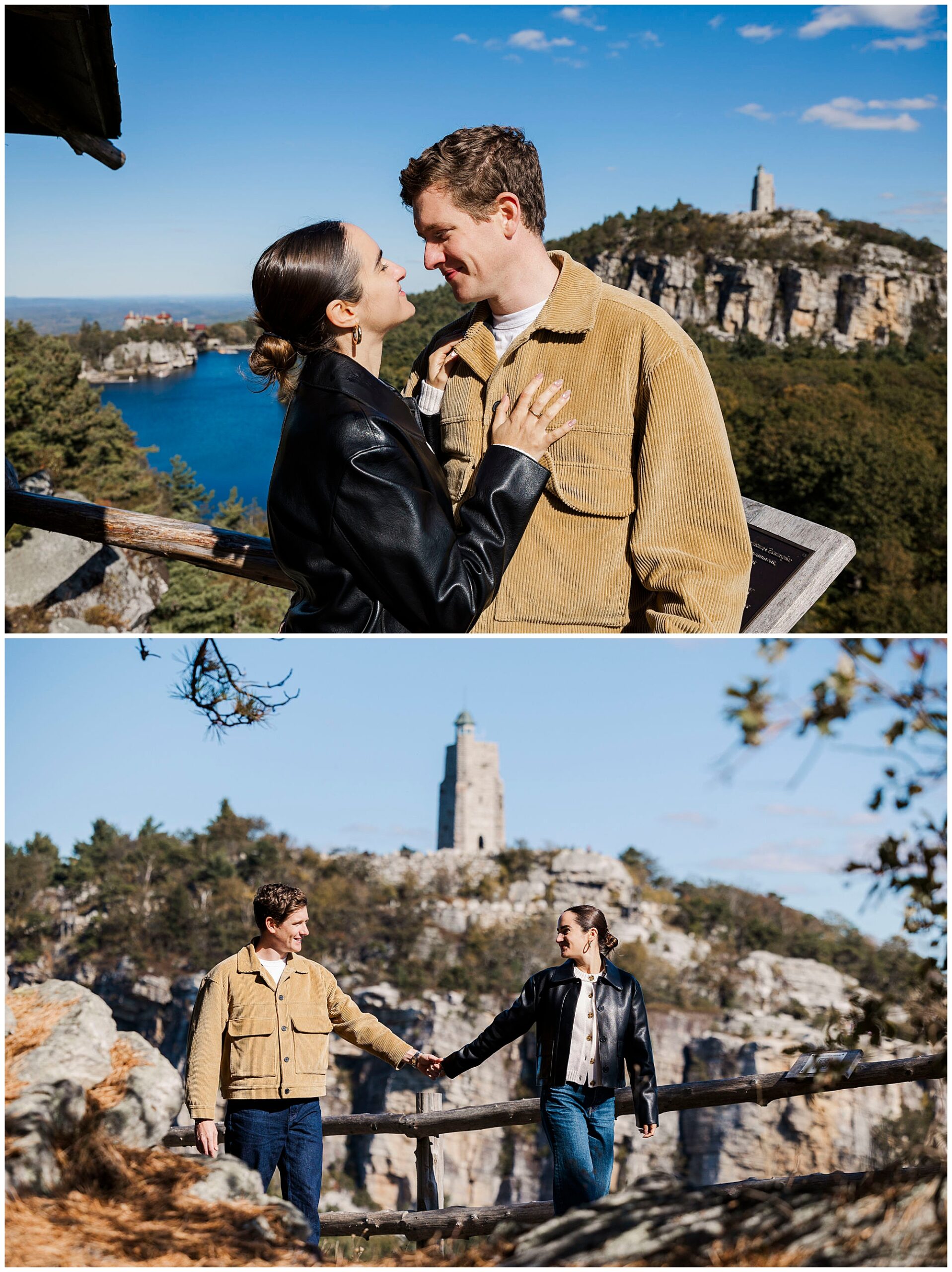 We also stop by Huntington Lookout, where you can see the Mohonk tower rising above the trees. The historic architecture brings a timeless quality to the images. Including these recognizable landmarks in proposal photos gives couples a strong sense of place and connection to the region.