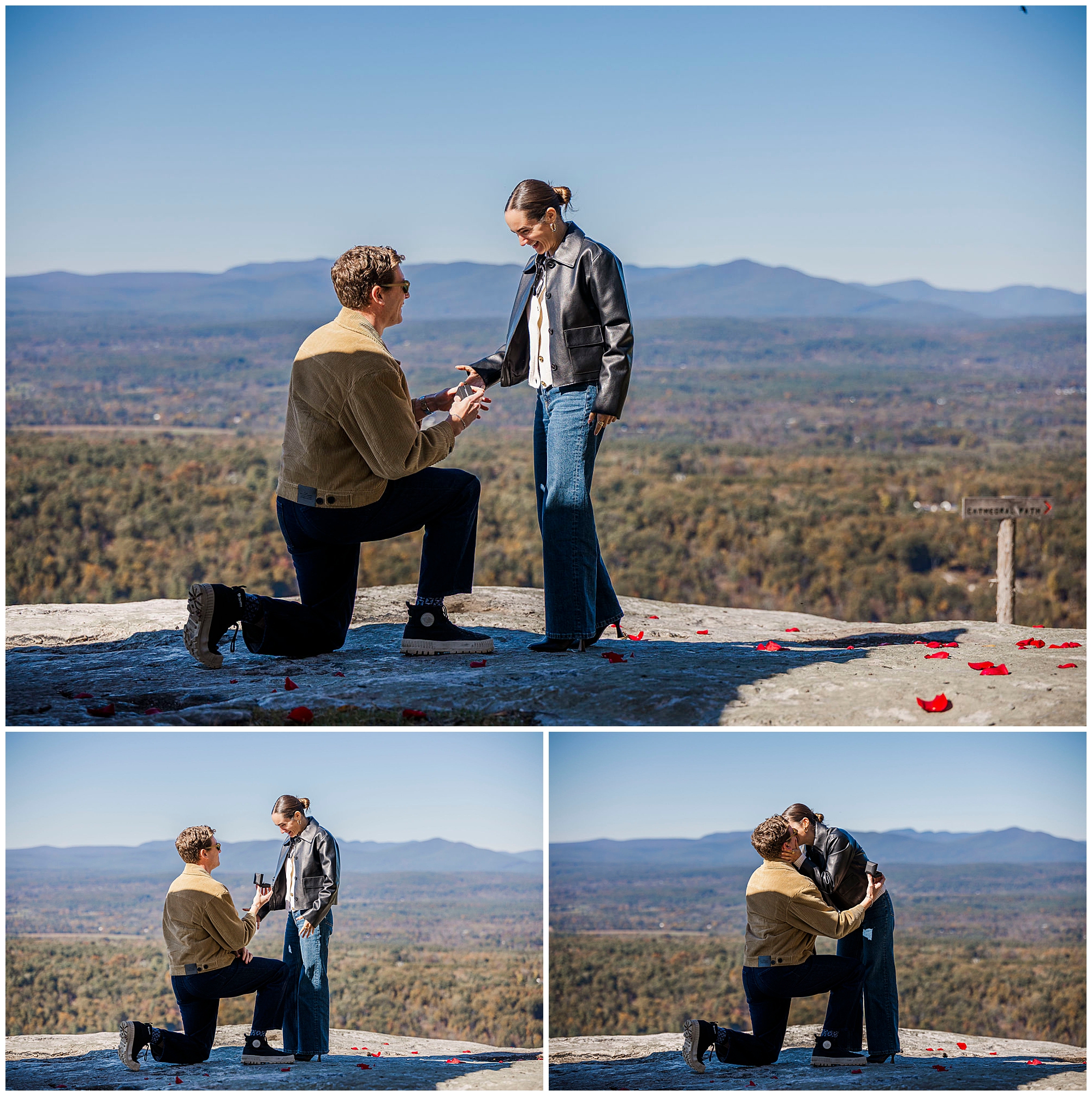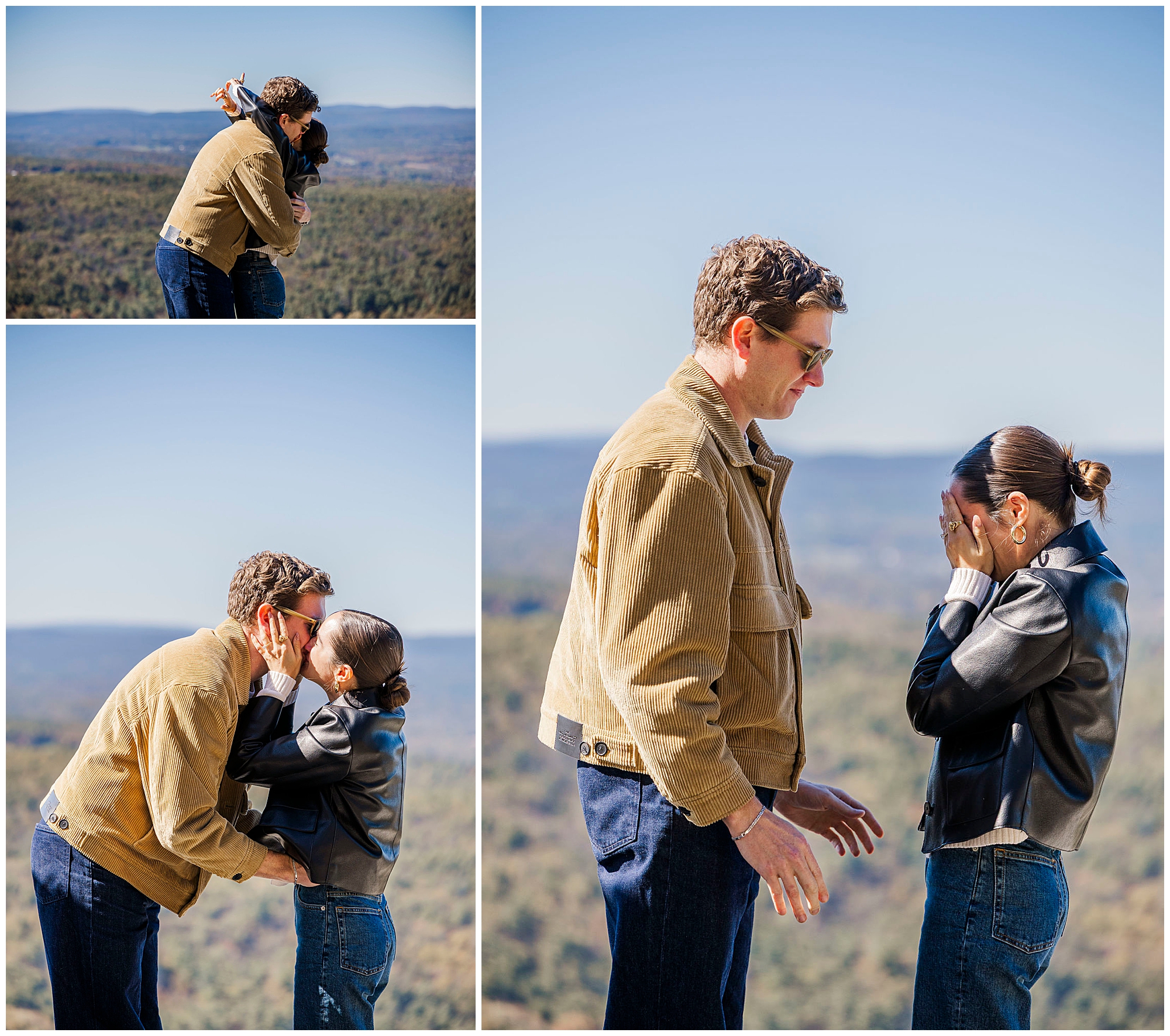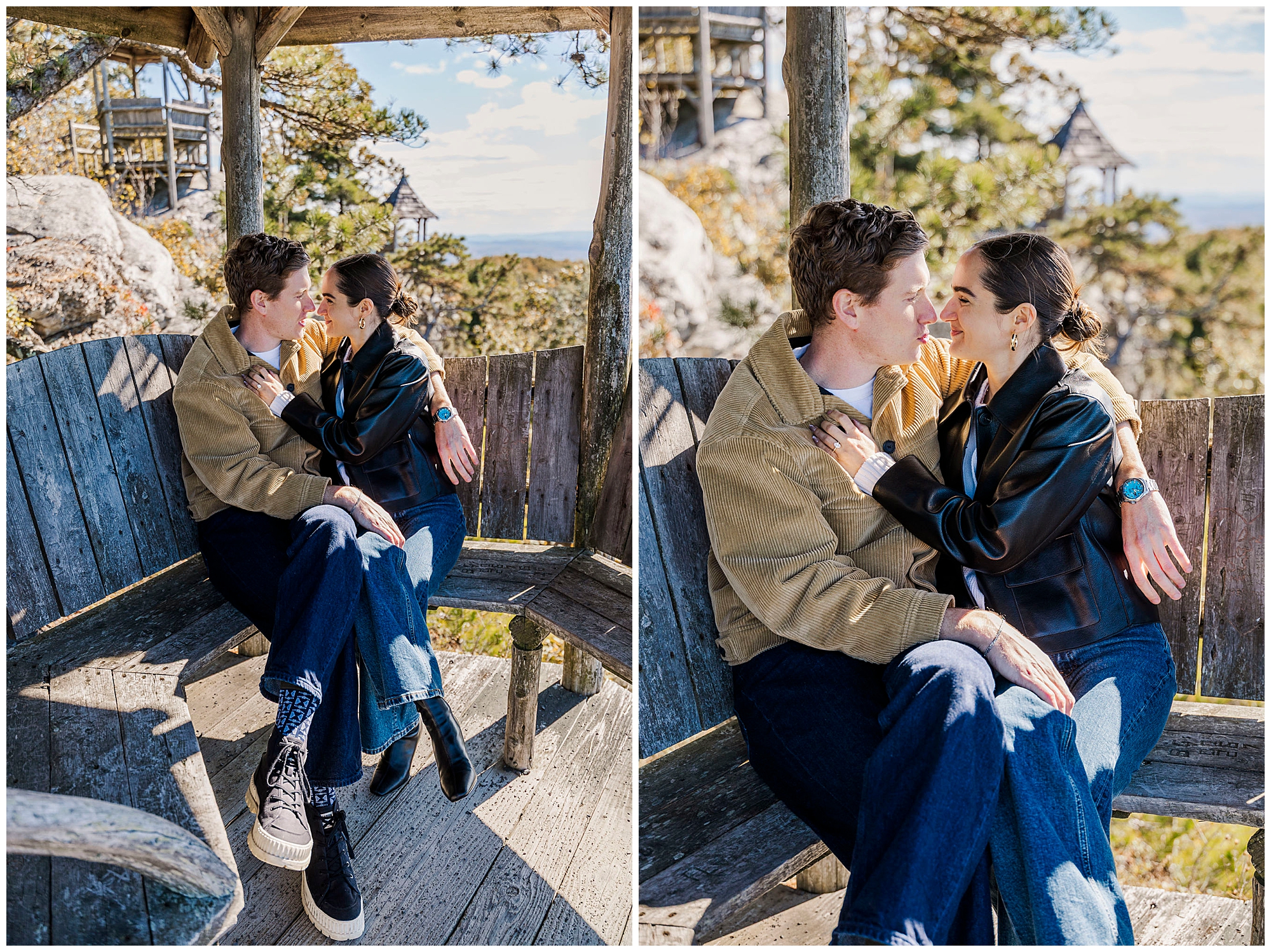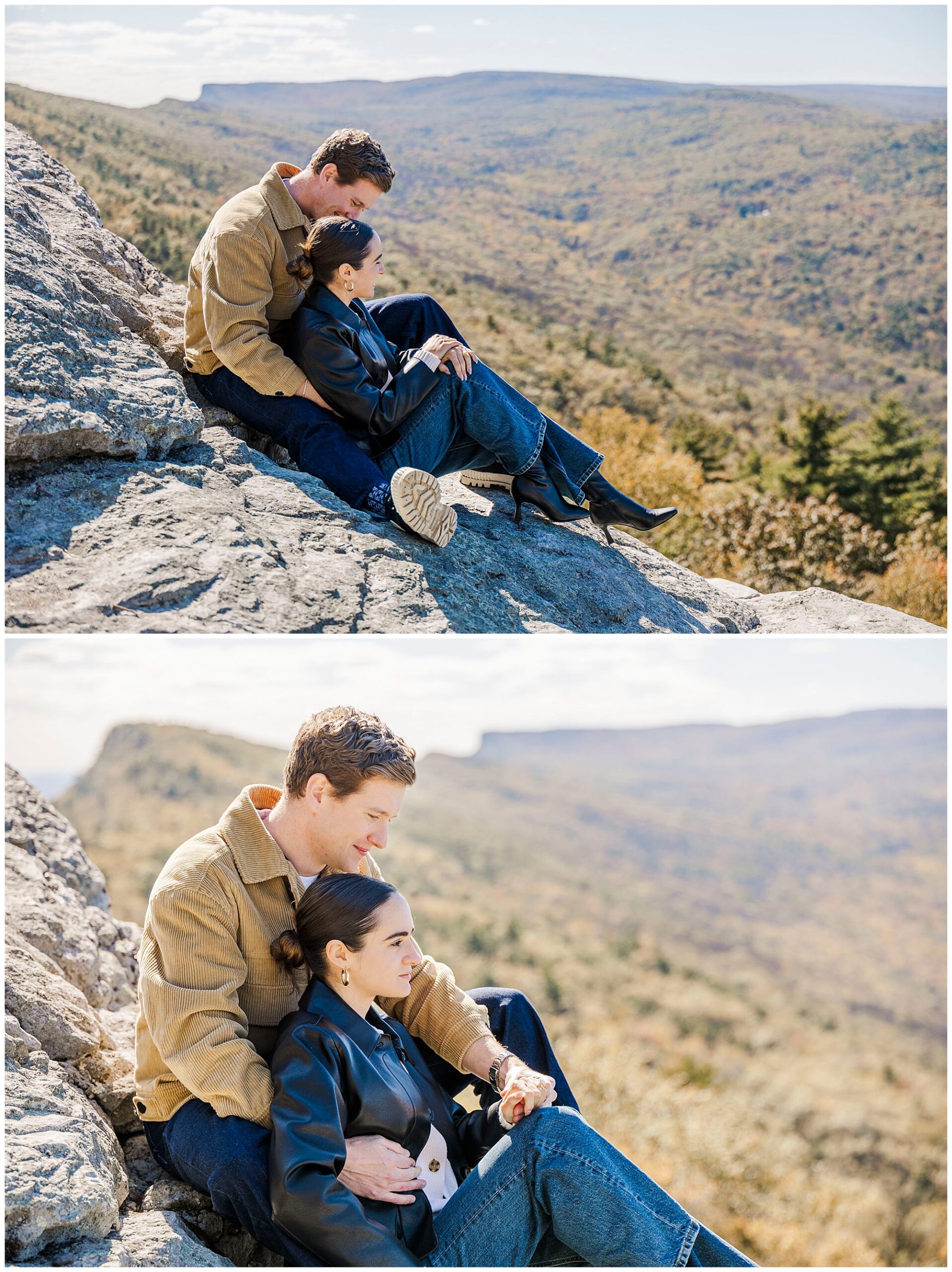 We also stop by Huntington Lookout, where you can see the Mohonk tower rising above the trees. The historic architecture brings a timeless quality to the images. Including these recognizable landmarks in proposal photos gives couples a strong sense of place and connection to the region.