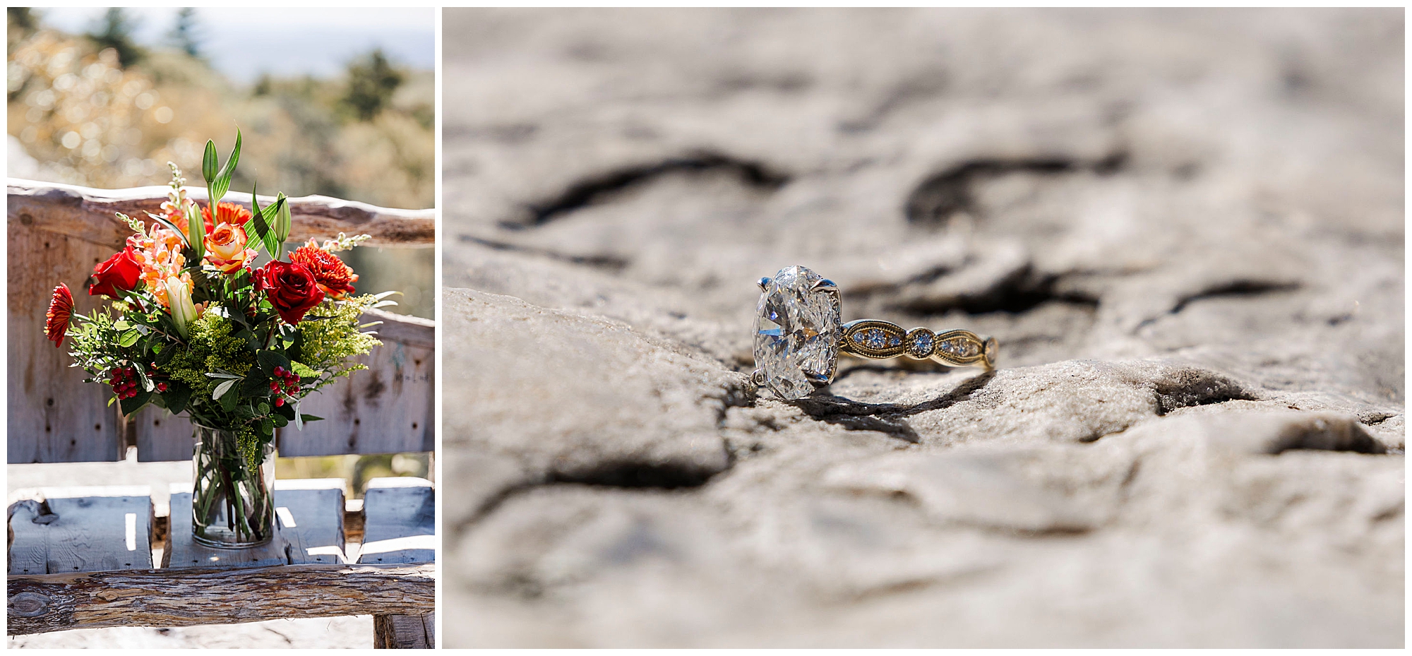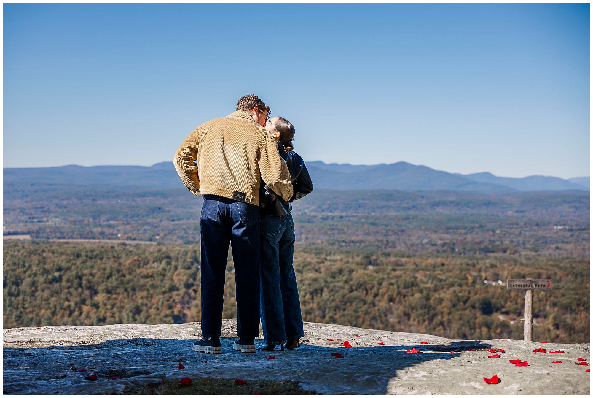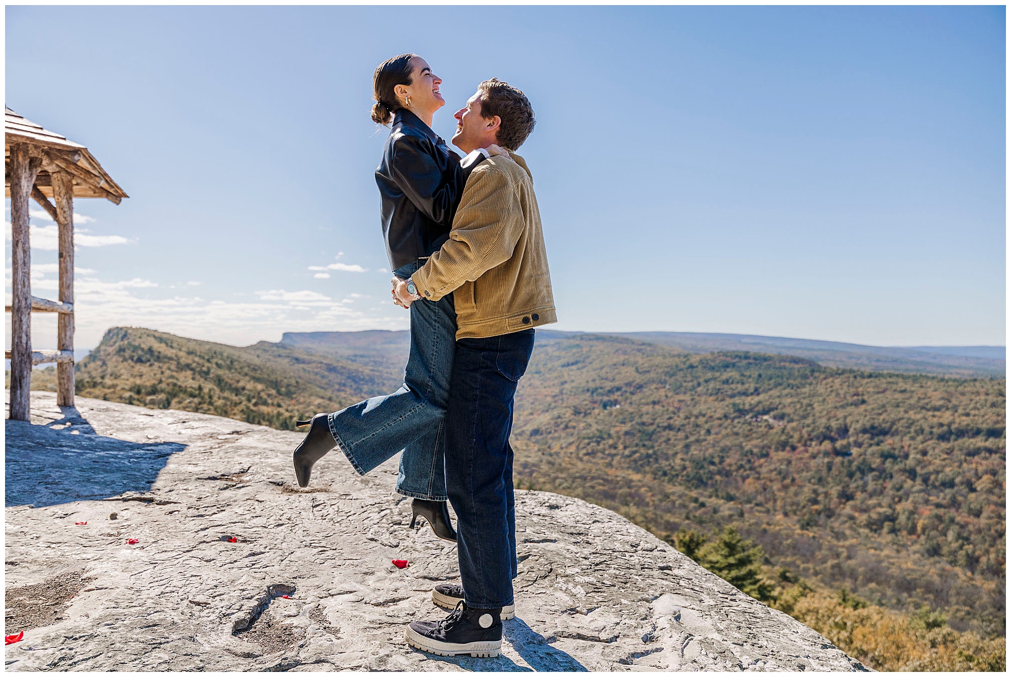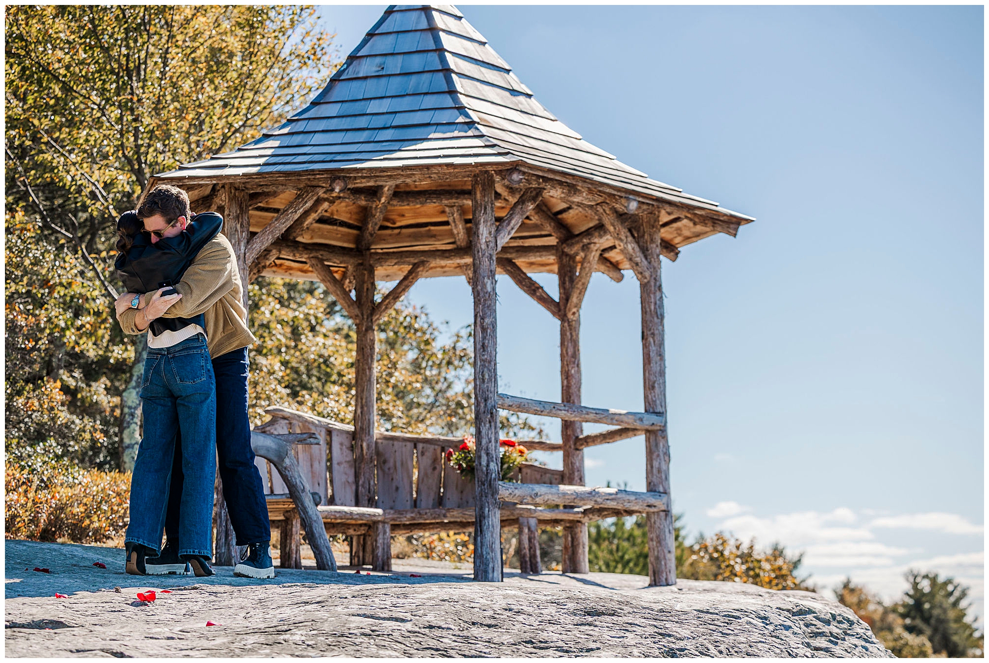 Cope’s Lookout features a small stone staircase that descends to a gazebo framed by trees. The moment you begin walking down, anticipation grows naturally. This setup adds so much emotion for a surprise Catskills proposal. The location feels private yet cinematic, with layers of texture from the rock, leaves, and sky that elevate every photo we take.