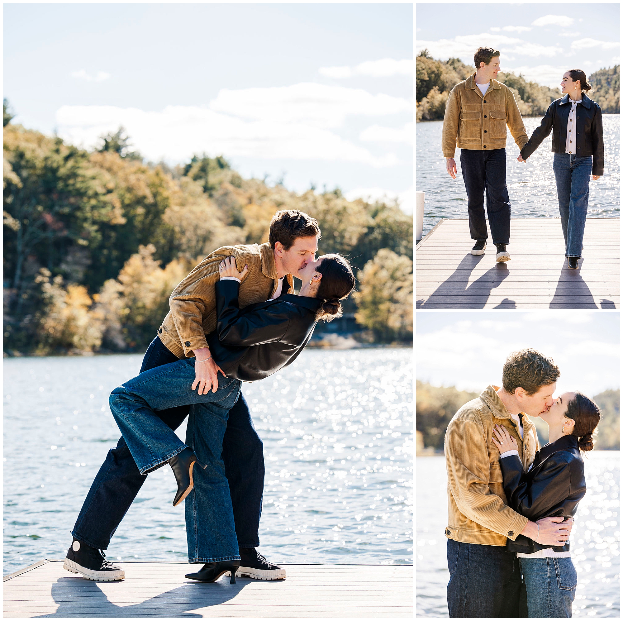 When Rob leads Bianca down the stairs, the golden sunlight glows through the trees. The reflection of the sky on the lake makes everything sparkle. As Hudson Valley proposal photographers, we stay quietly in the background, allowing the emotion to unfold naturally. These are the moments that define our approach — authentic, candid, and deeply heartfelt.