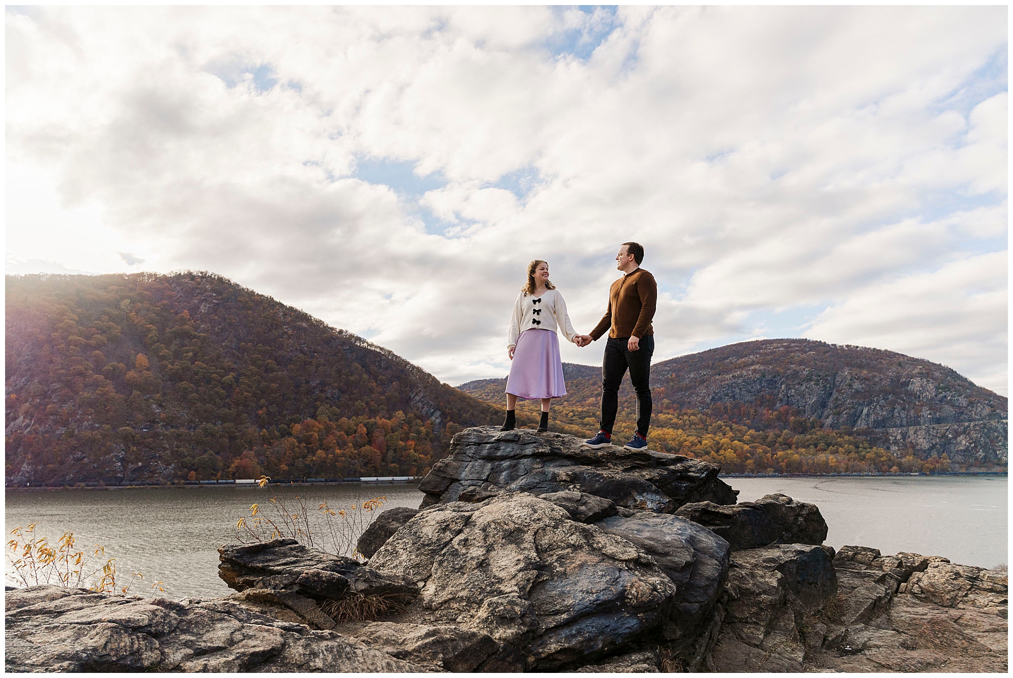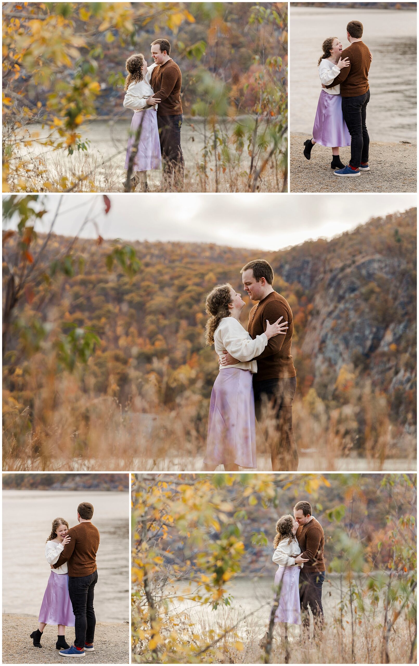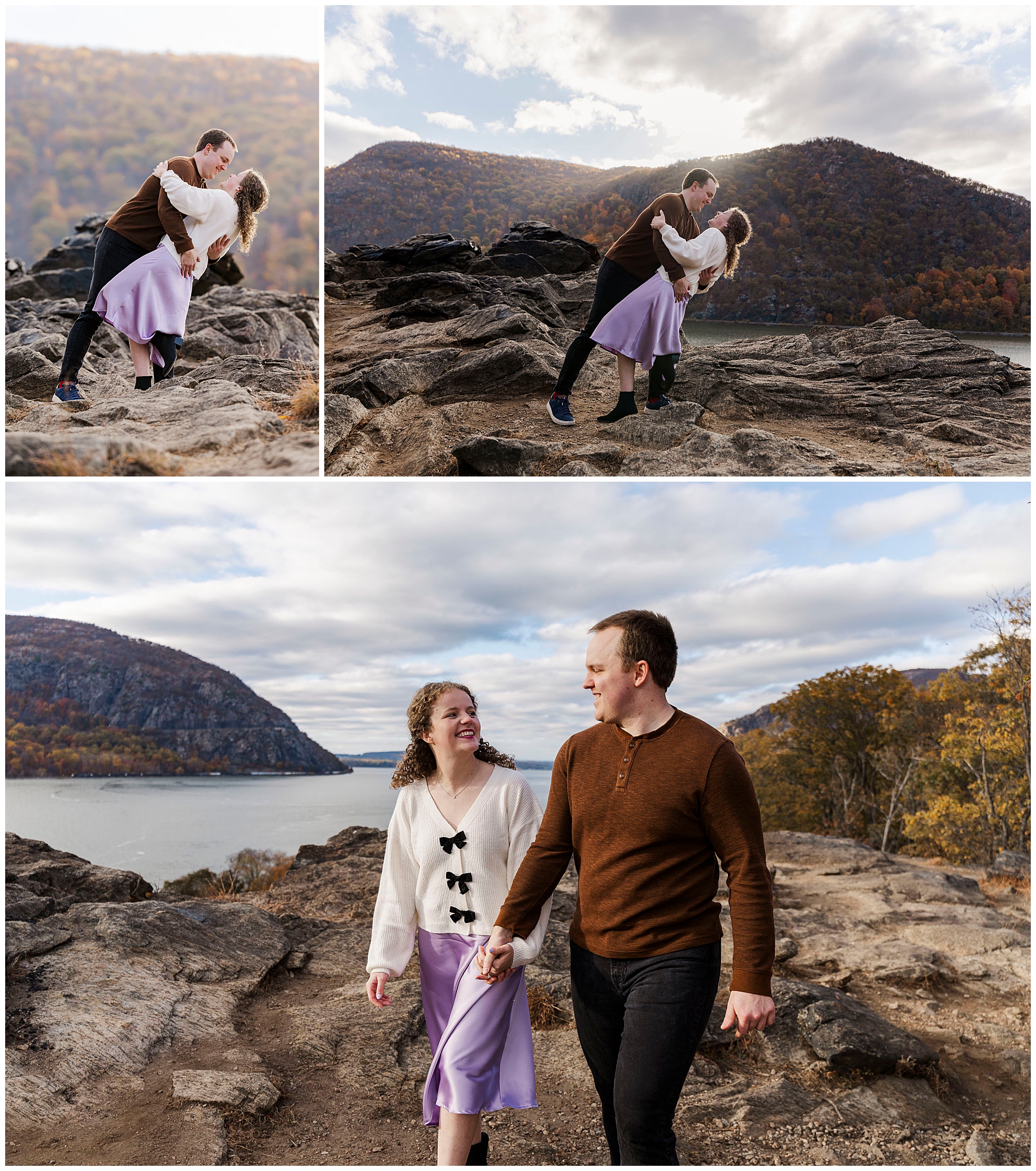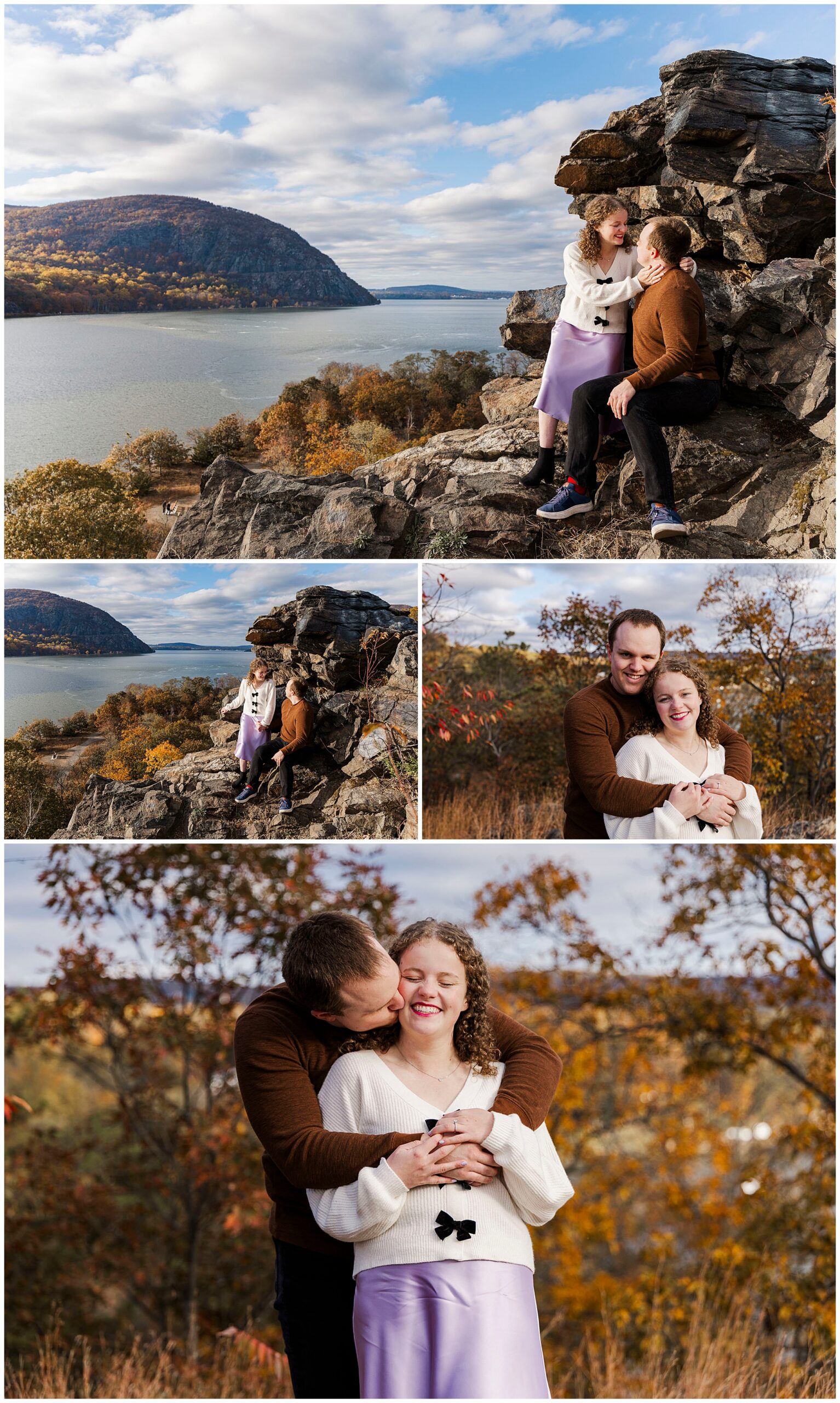 Neutrals and soft tones look beautiful against the fall colors in this area. Annie’s outfit choice, a cream sweater and lavender skirt, worked perfectly against the warm landscape. Comfortable shoes are a must for walking the trails and rocks near the overlook. Planning ahead helps your Little Stony Point engagement pictures feel effortless and fun.