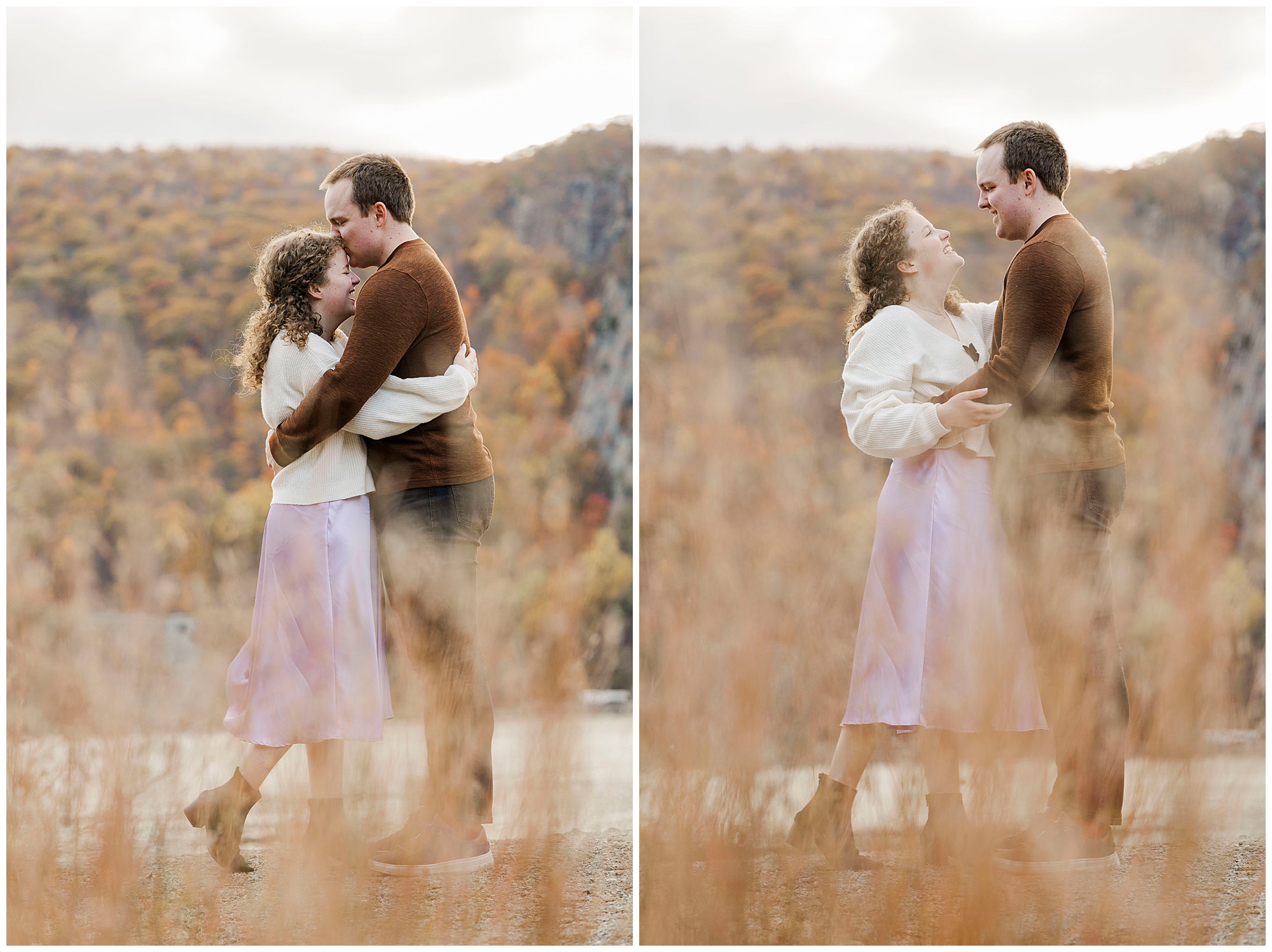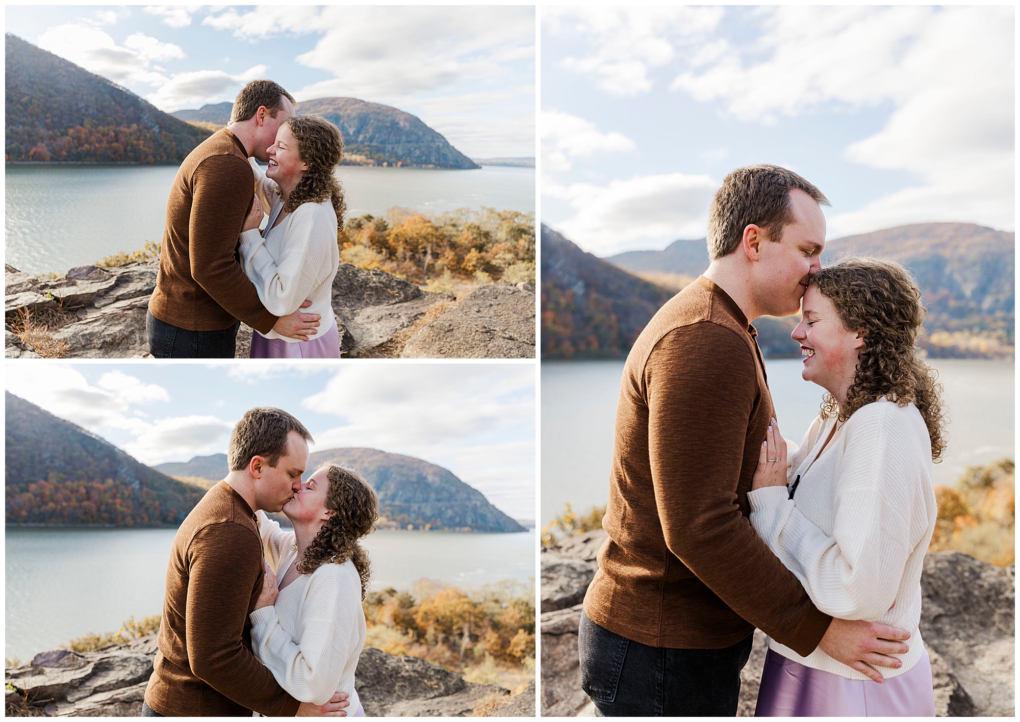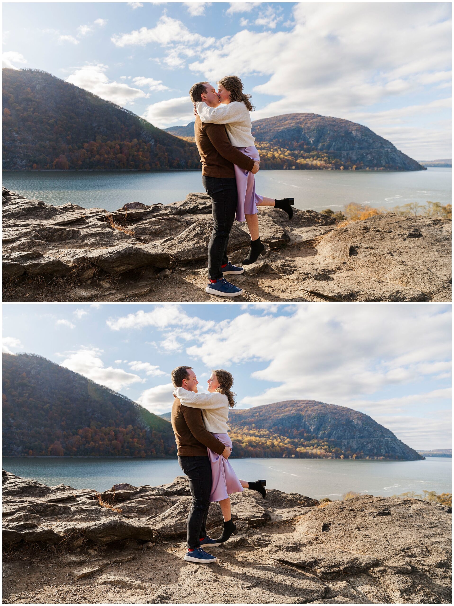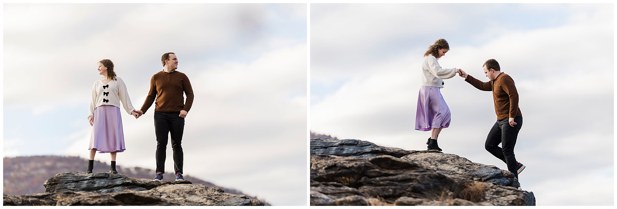 Neutrals and soft tones look beautiful against the fall colors in this area. Annie’s outfit choice, a cream sweater and lavender skirt, worked perfectly against the warm landscape. Comfortable shoes are a must for walking the trails and rocks near the overlook. Planning ahead helps your Little Stony Point engagement pictures feel effortless and fun.