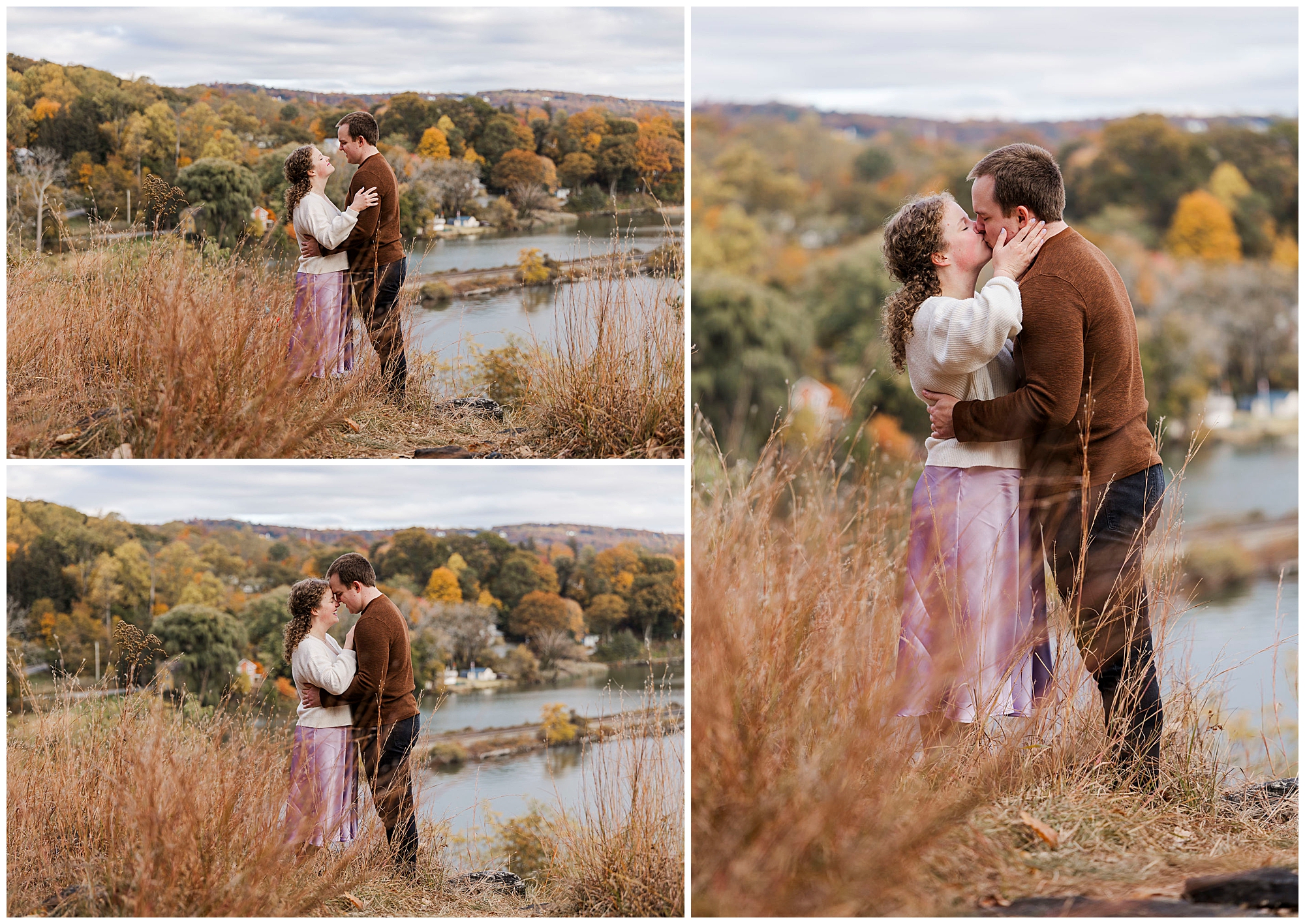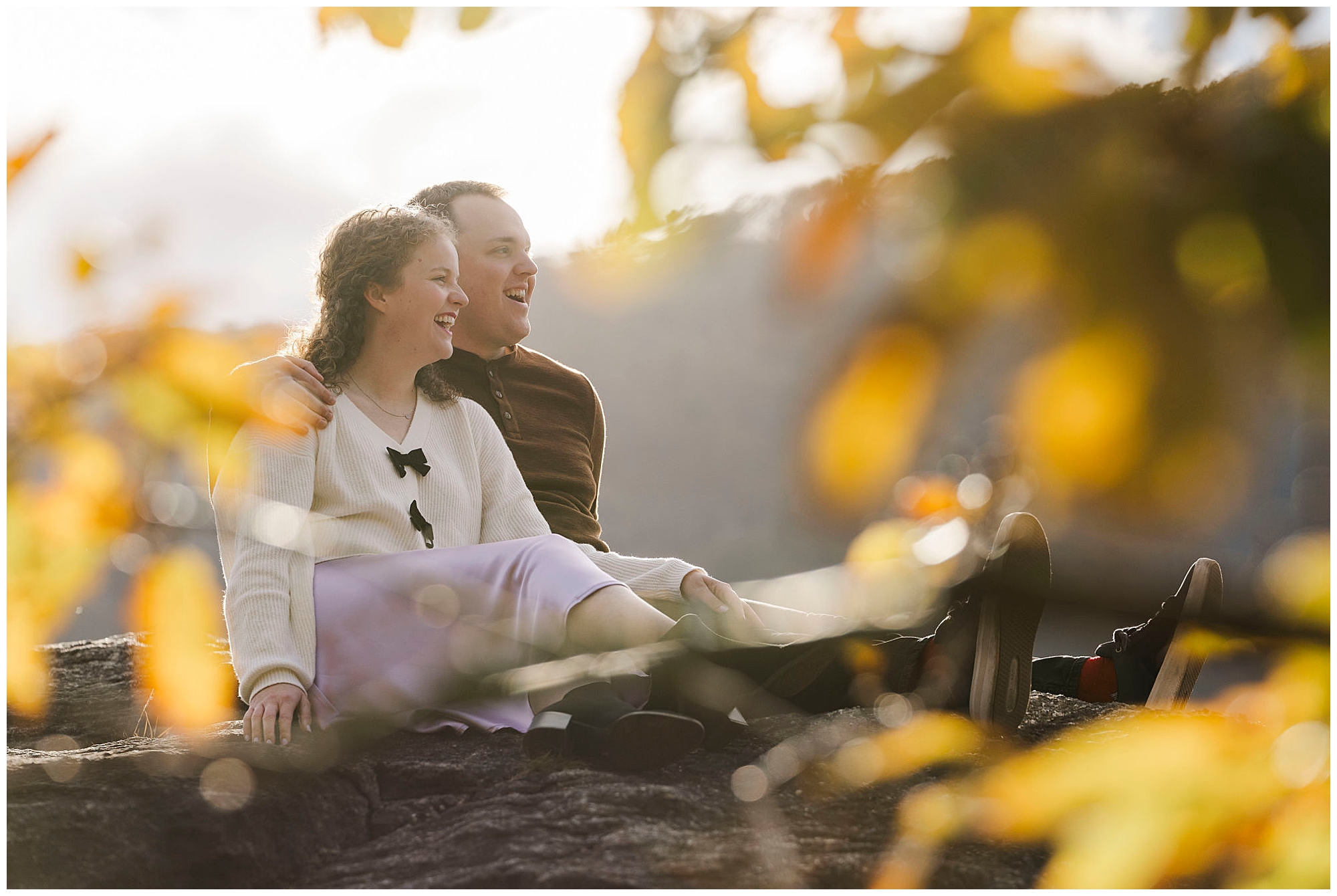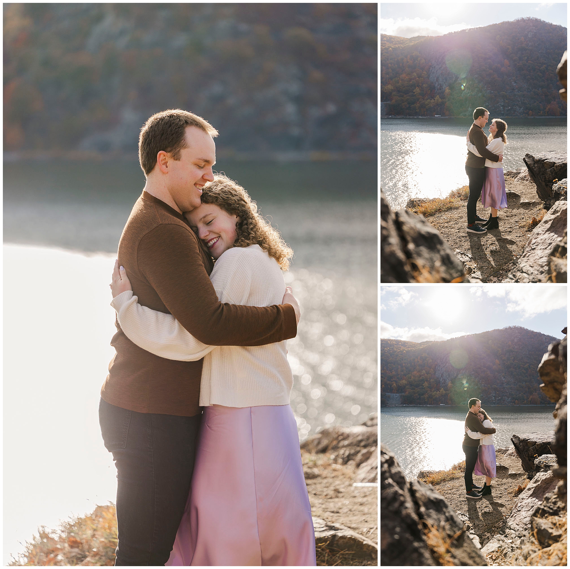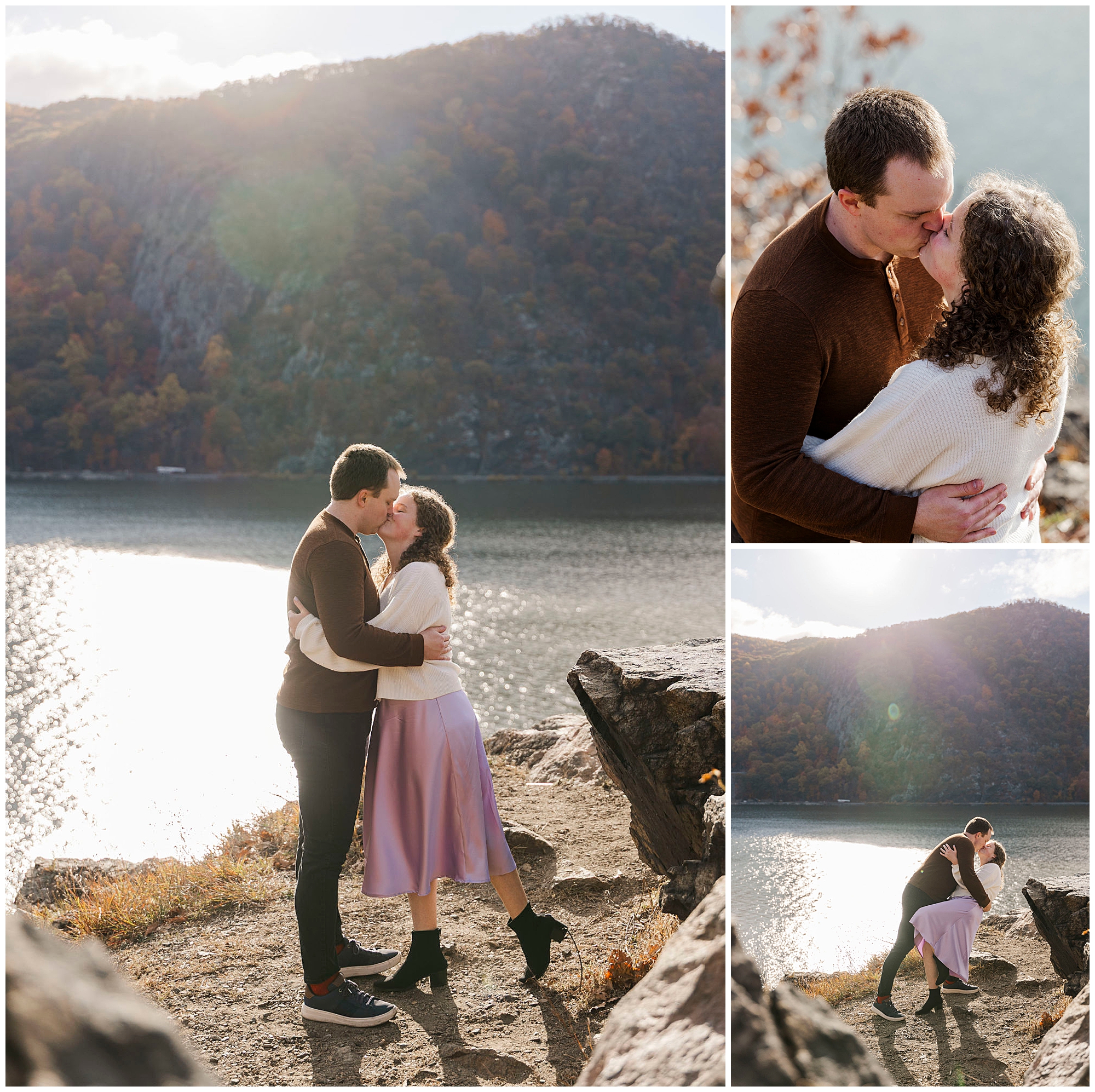 Neutrals and soft tones look beautiful against the fall colors in this area. Annie’s outfit choice, a cream sweater and lavender skirt, worked perfectly against the warm landscape. Comfortable shoes are a must for walking the trails and rocks near the overlook. Planning ahead helps your Little Stony Point engagement pictures feel effortless and fun.