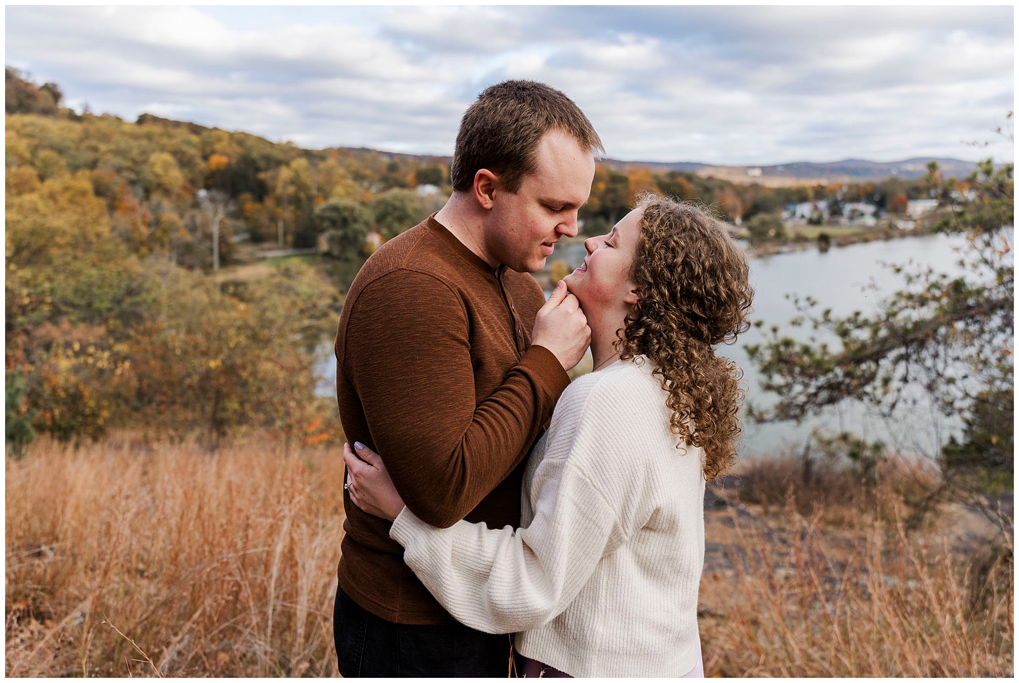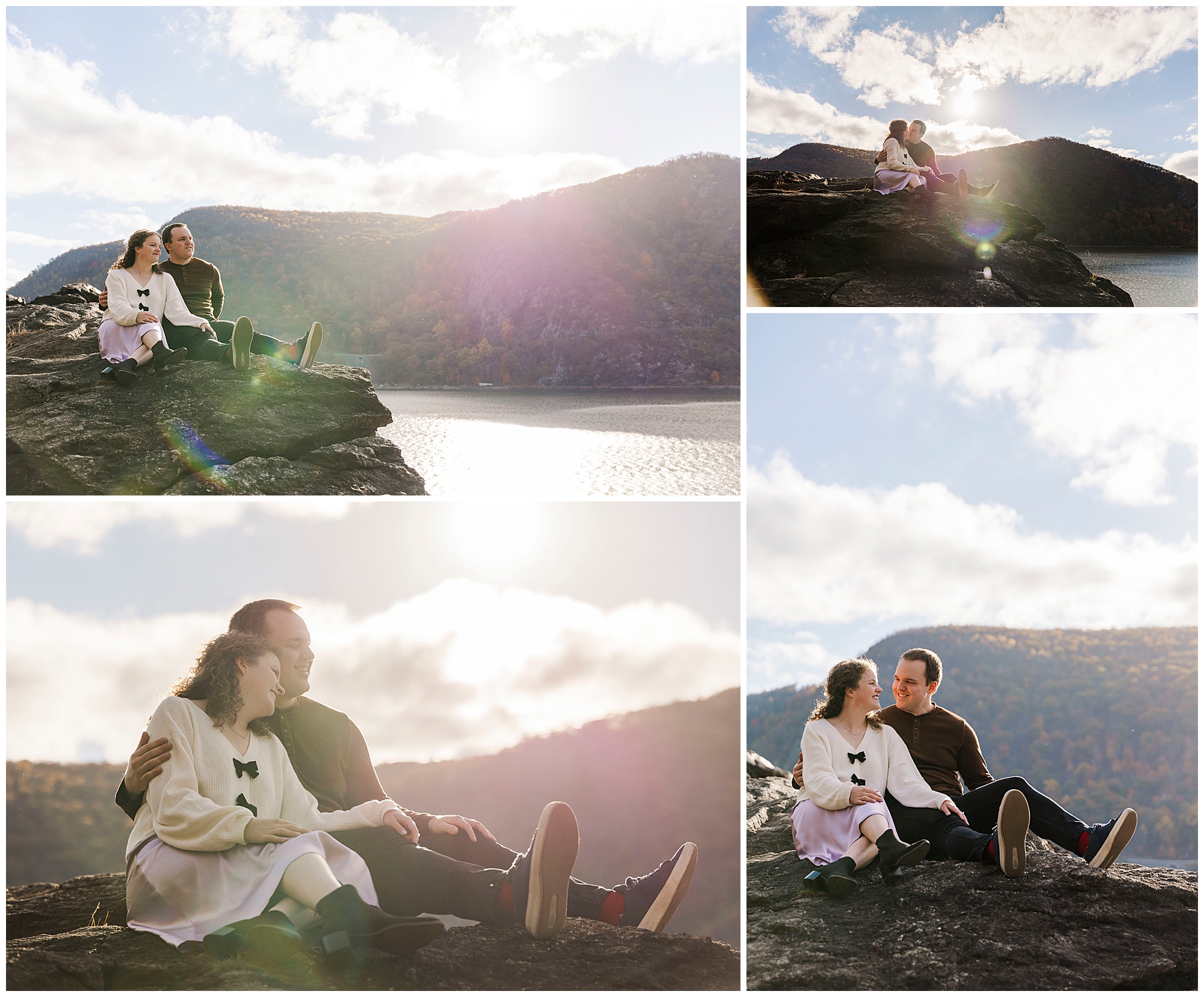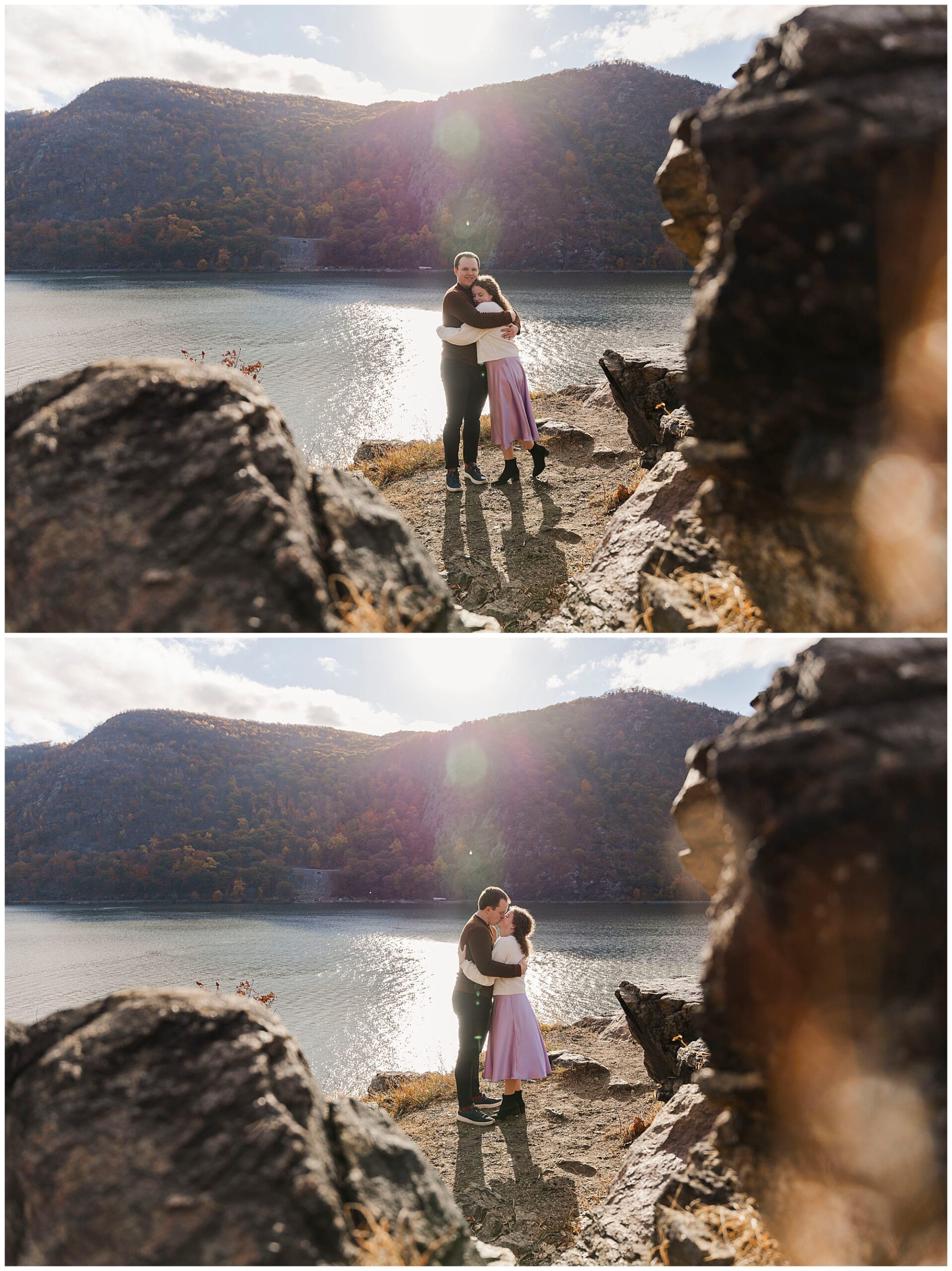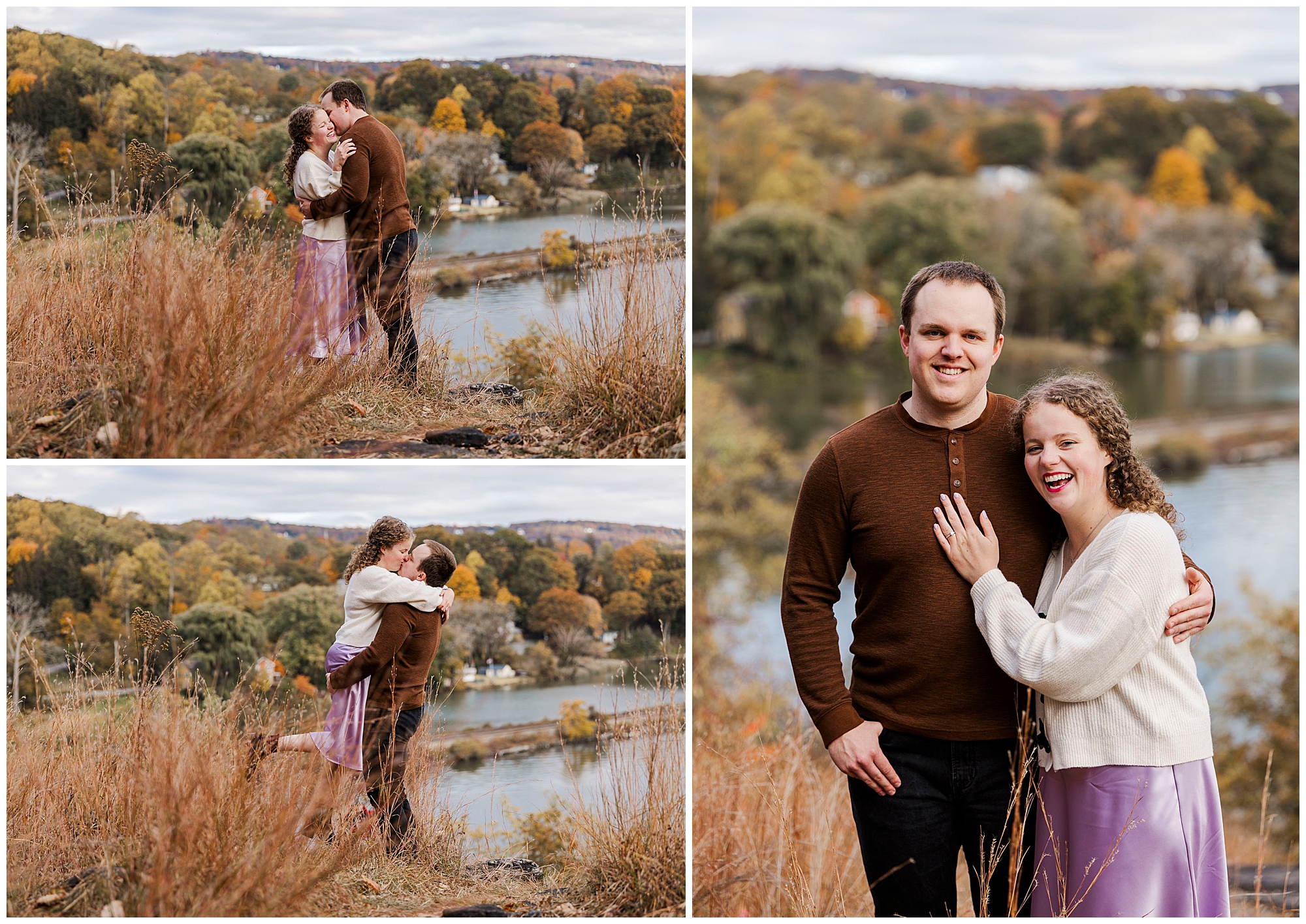 Neutrals and soft tones look beautiful against the fall colors in this area. Annie’s outfit choice, a cream sweater and lavender skirt, worked perfectly against the warm landscape. Comfortable shoes are a must for walking the trails and rocks near the overlook. Planning ahead helps your Little Stony Point engagement pictures feel effortless and fun.