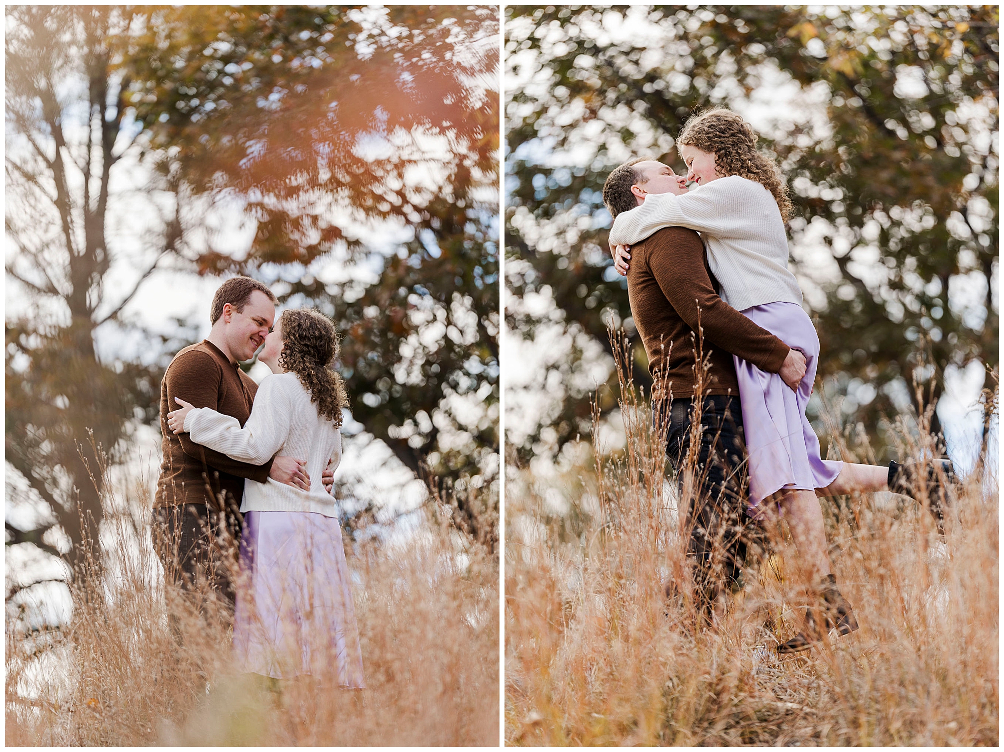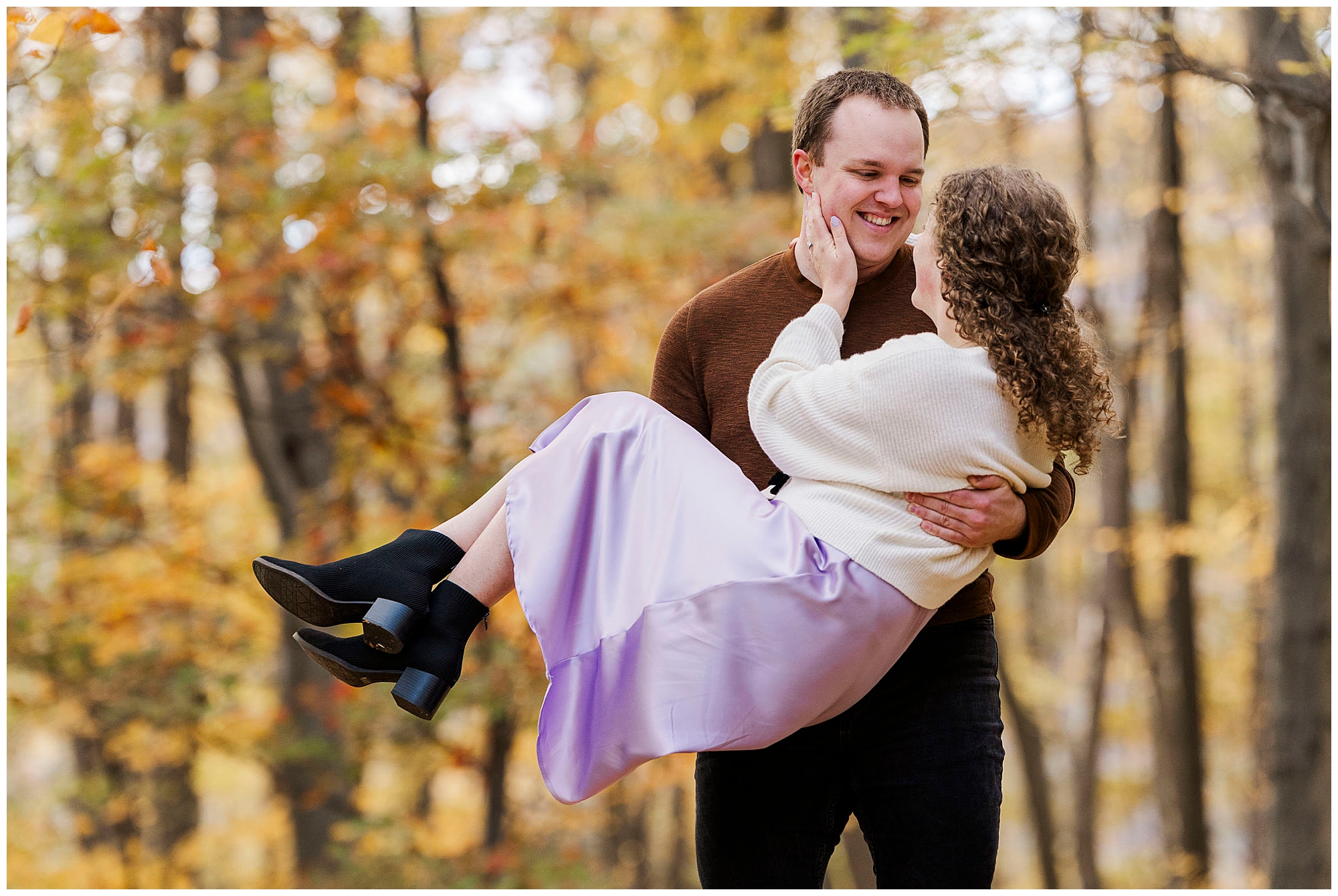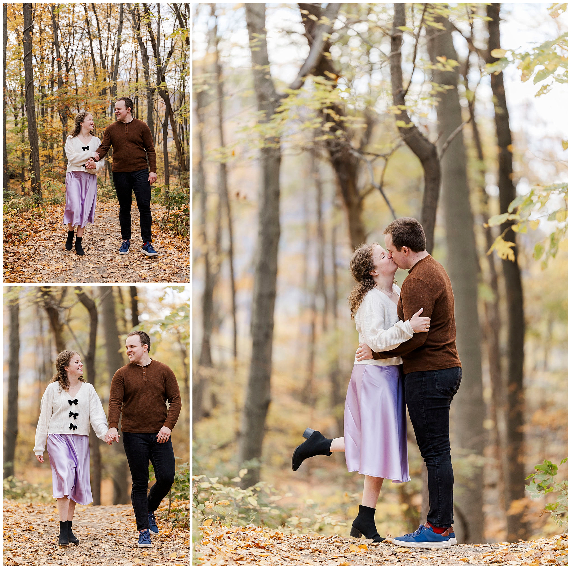 Annie and Billy stroll through the wooded trails hand in hand. The fallen leaves create a soft golden carpet beneath their feet. Annie’s lavender skirt and cream sweater complement Billy’s brown sweater perfectly against the autumn backdrop. The natural tones and colors blend beautifully with the seasonal landscape of their Little Stony Point engagement pictures.