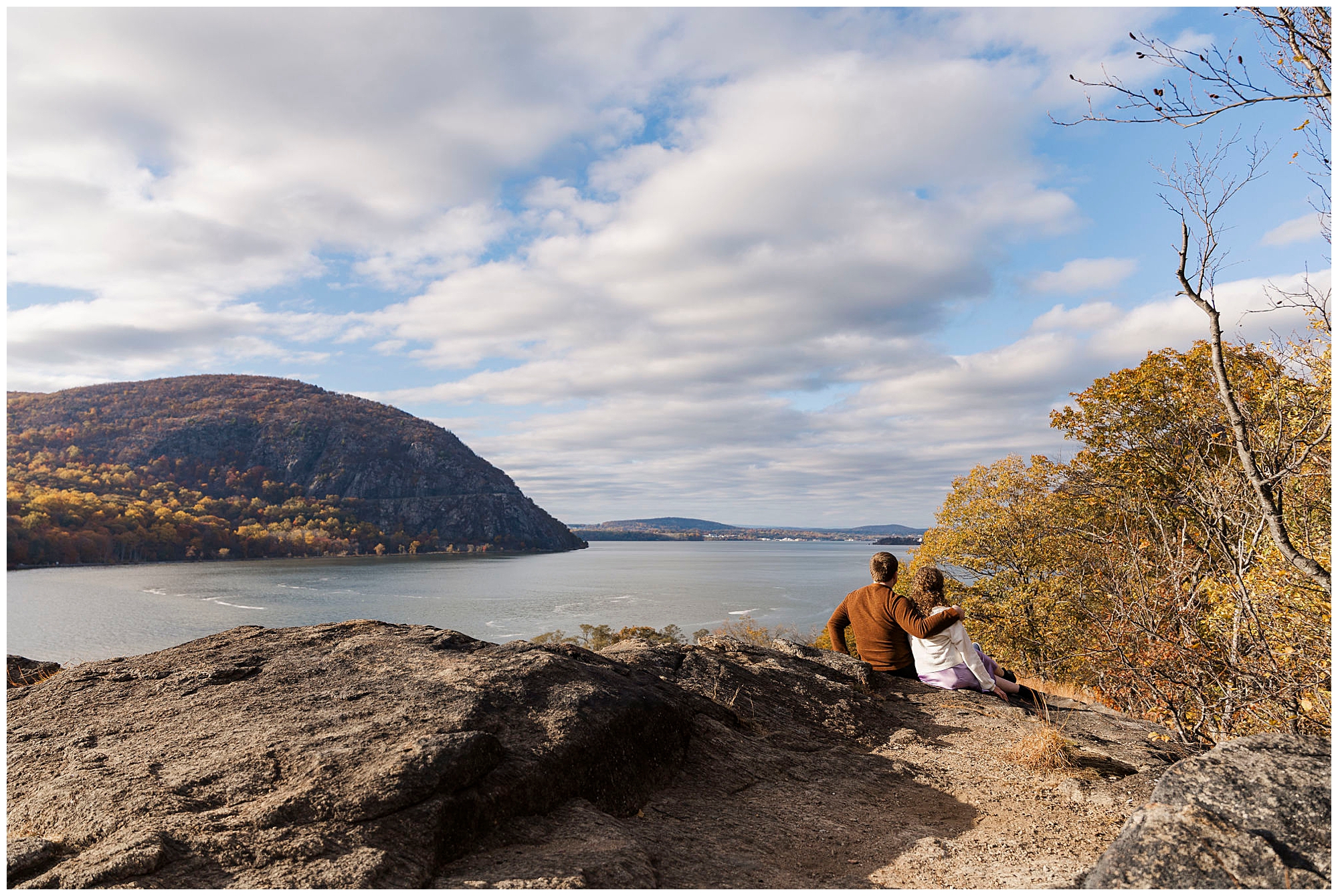 As we walk toward the overlook, the Hudson River begins to peek through the trees. The view opens up to reveal the rich colors of Storm King Mountain across the water. It’s the kind of view that reminds us why we love photographing couples in the Hudson Highlands. The soft, even lighting on overcast days makes every shot feel timeless.