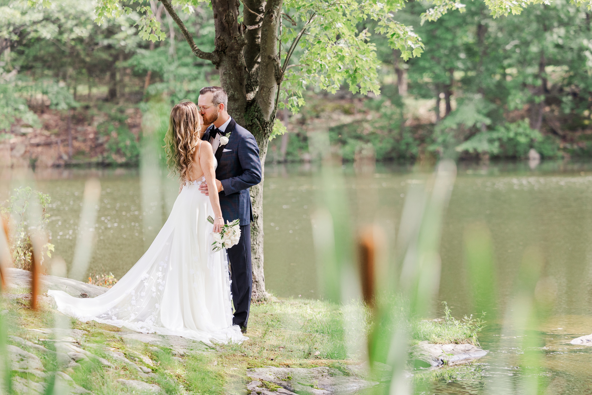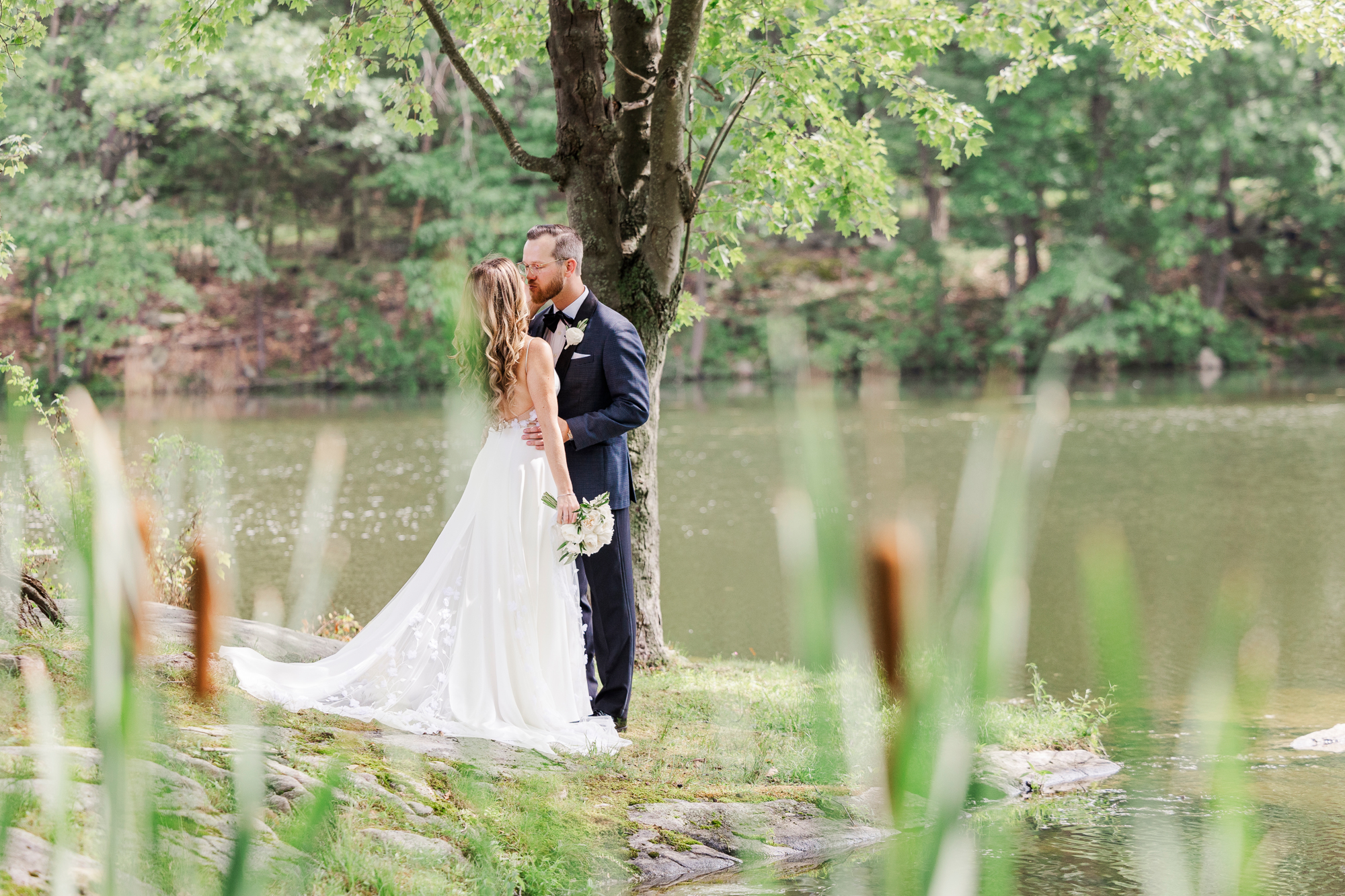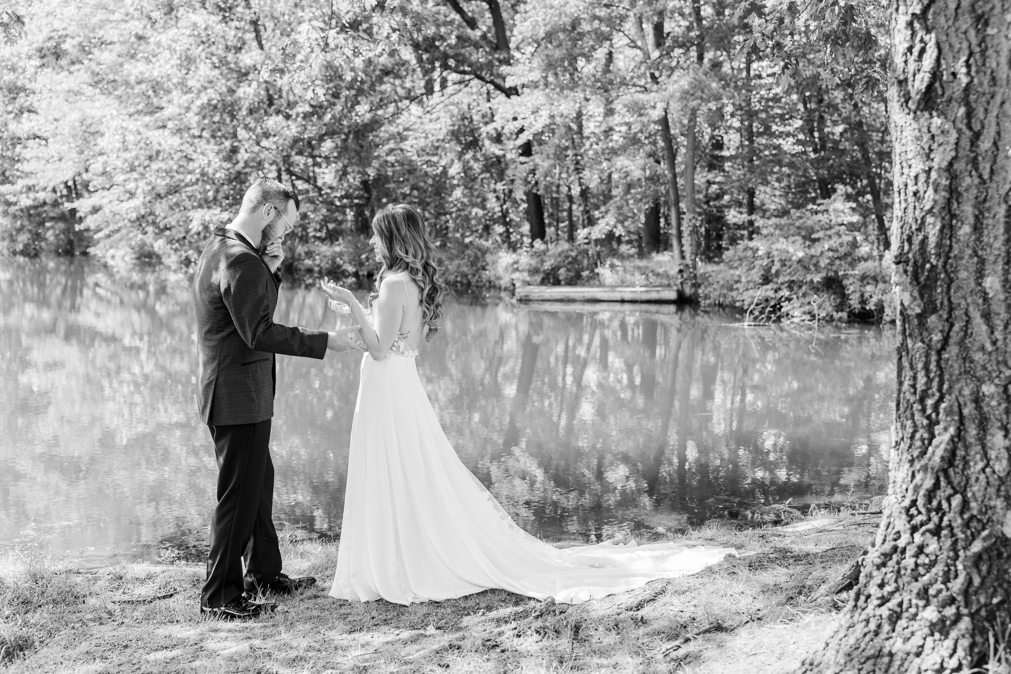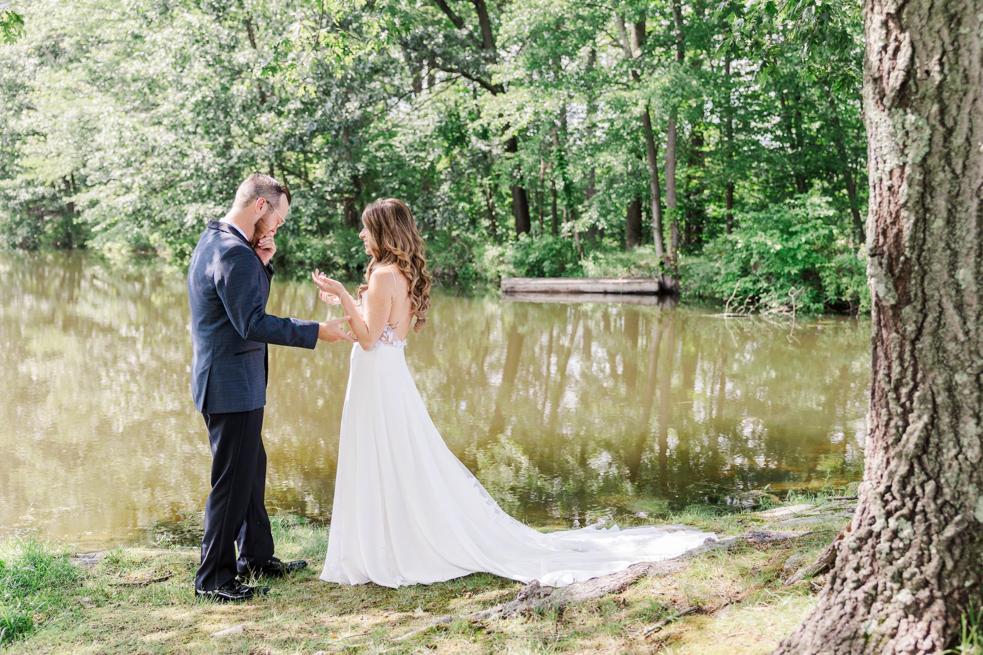 Once they were ready to go, it was time to go to the first look. The team for a Refinery at Perona Farms wedding are super thorough and communicative. It made it easy for us to travel over to the location separately. Alanna and Paul’s first look photos take place at Perona Point, a gorgeous lakeside location. It’s super close to the venue and you can easily access it by golf cart.