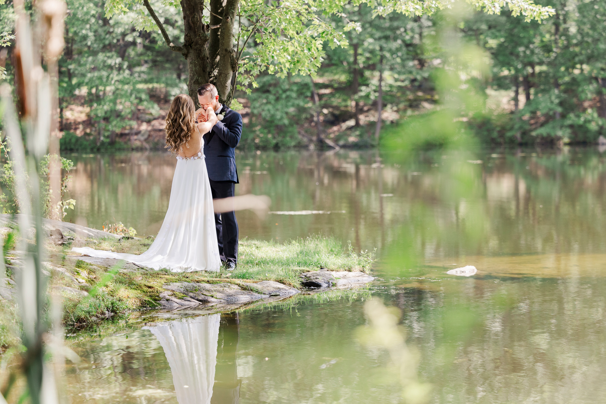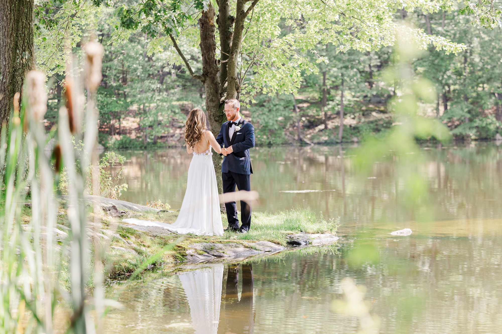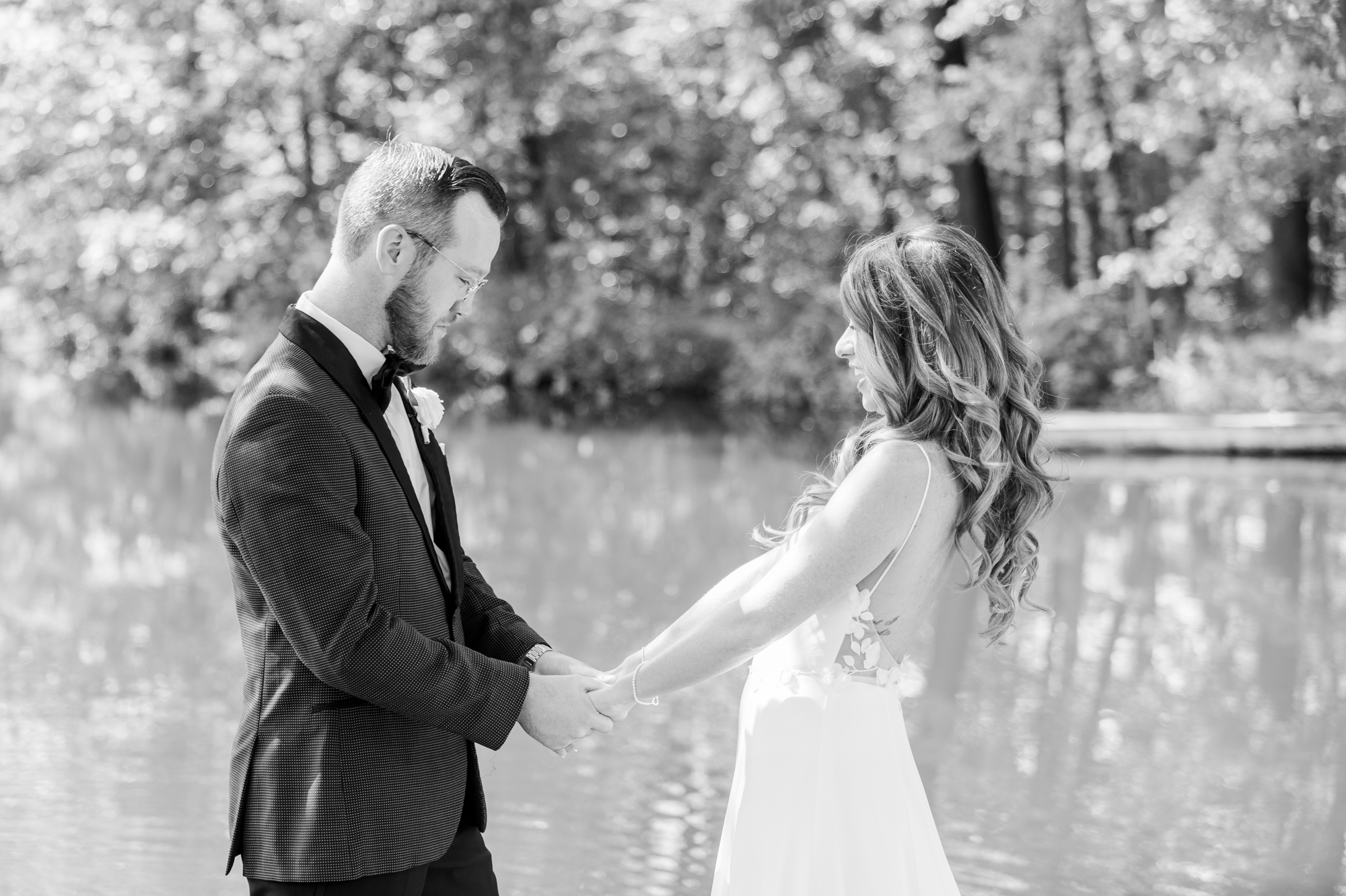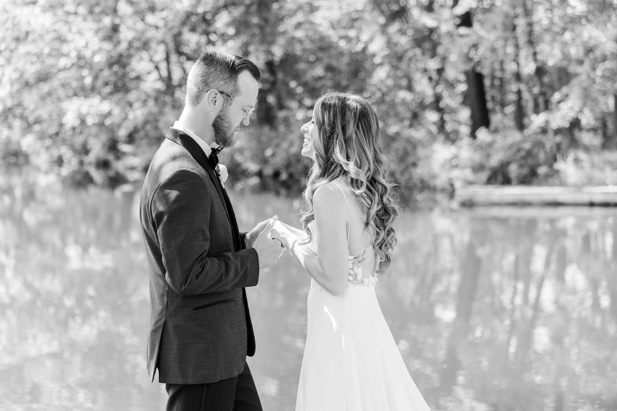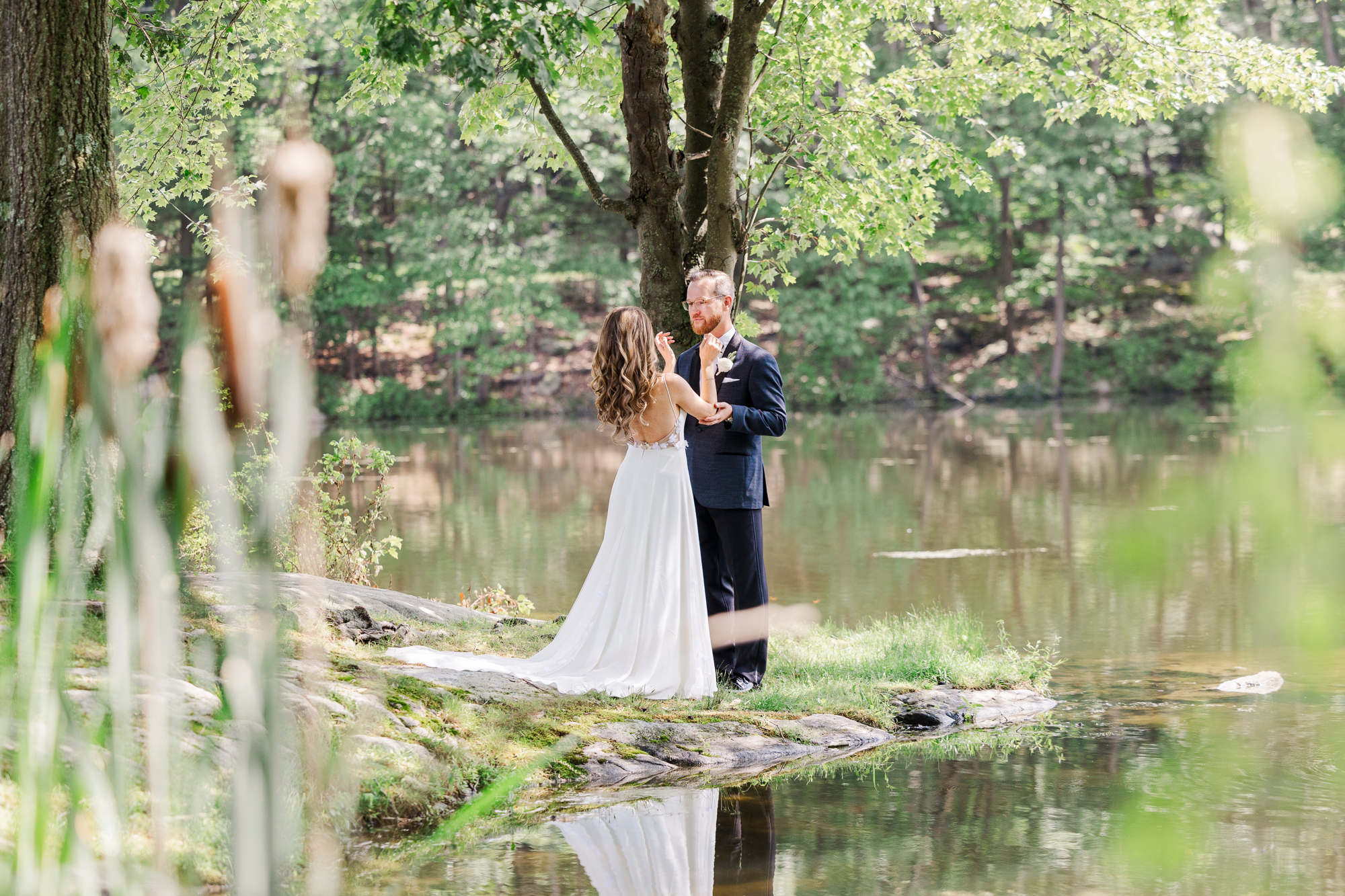 Once they were ready to go, it was time to go to the first look. The team for a Refinery at Perona Farms wedding are super thorough and communicative. It made it easy for us to travel over to the location separately. Alanna and Paul’s first look photos take place at Perona Point, a gorgeous lakeside location. It’s super close to the venue and you can easily access it by golf cart.
