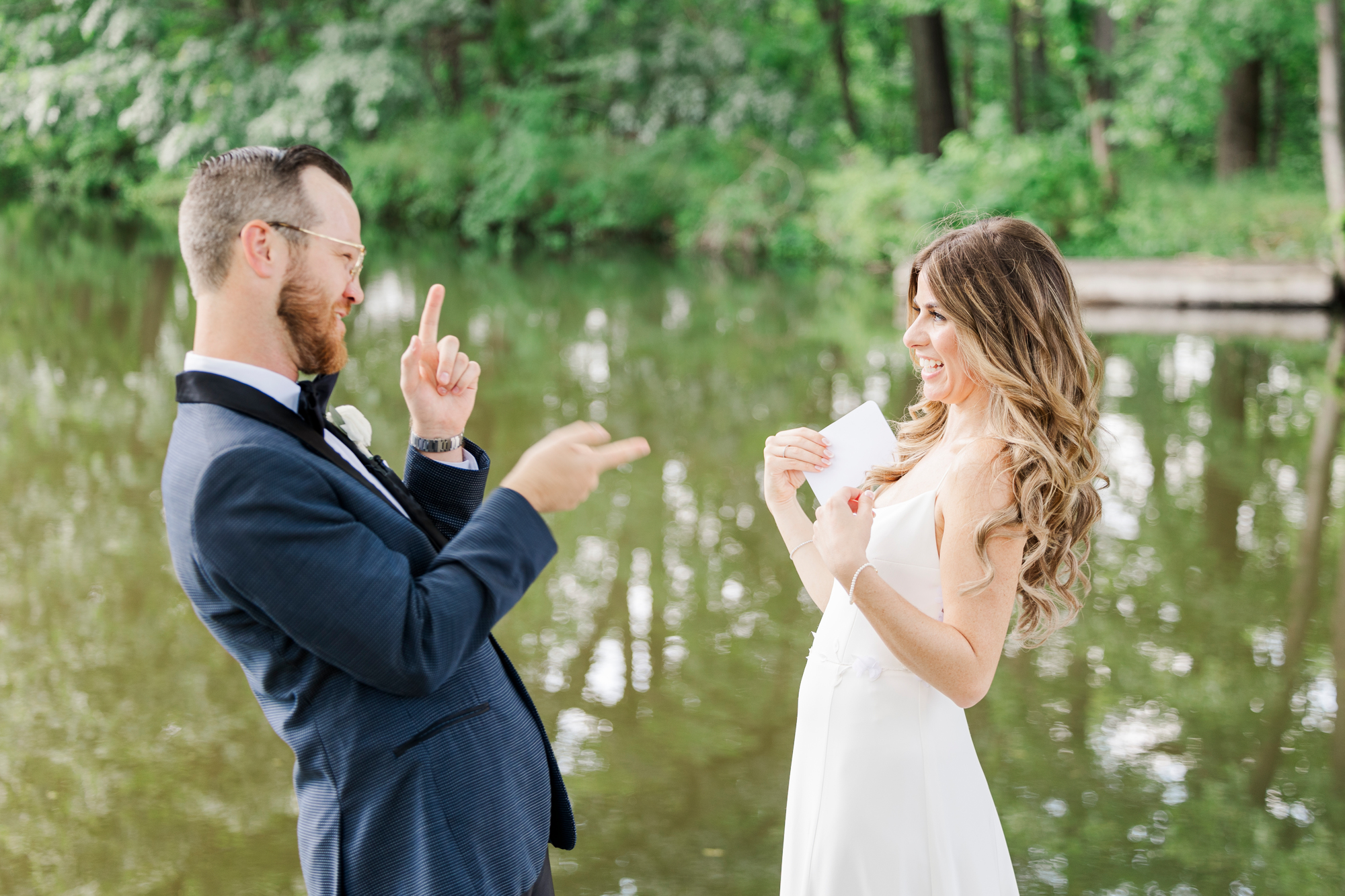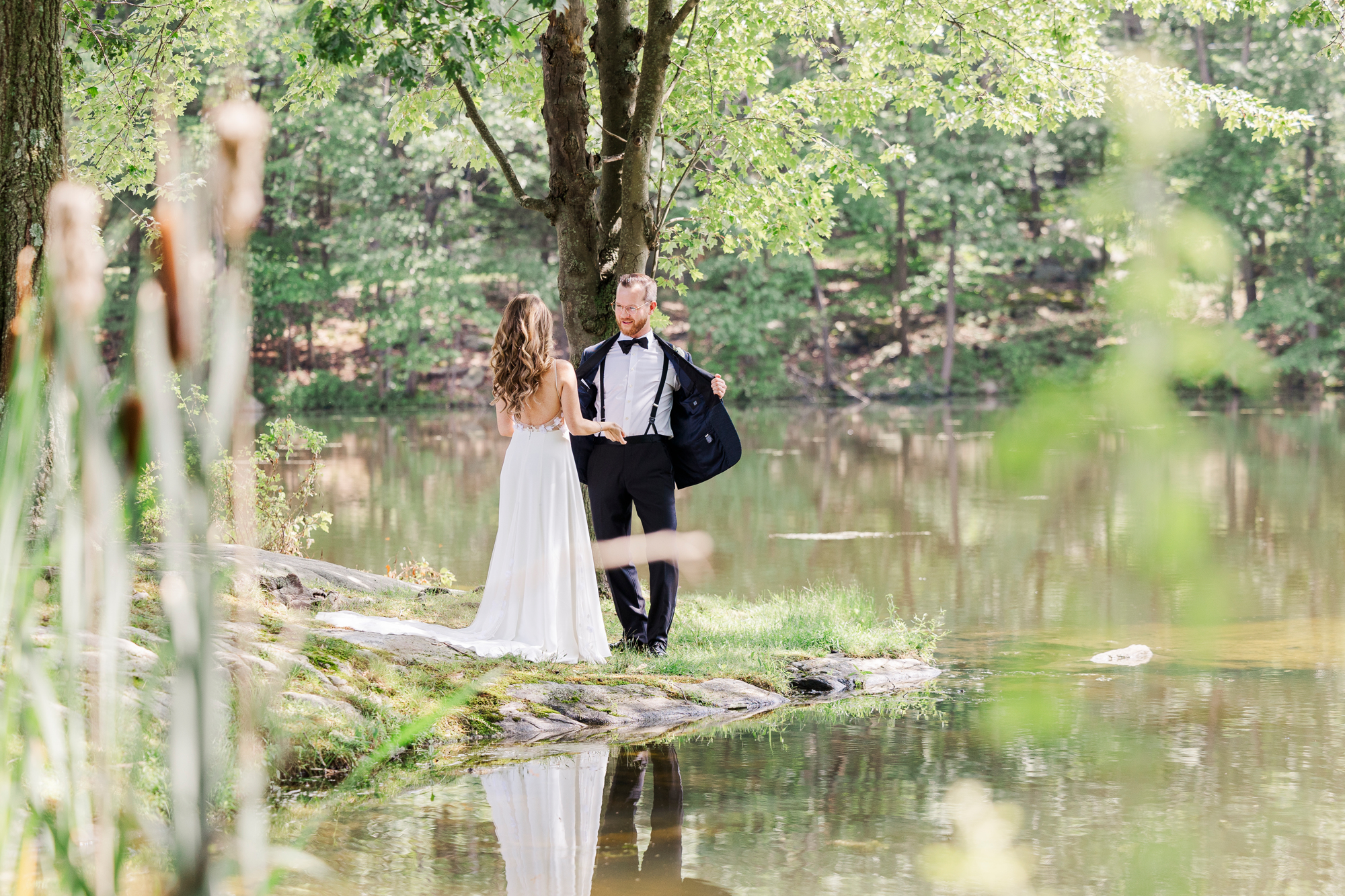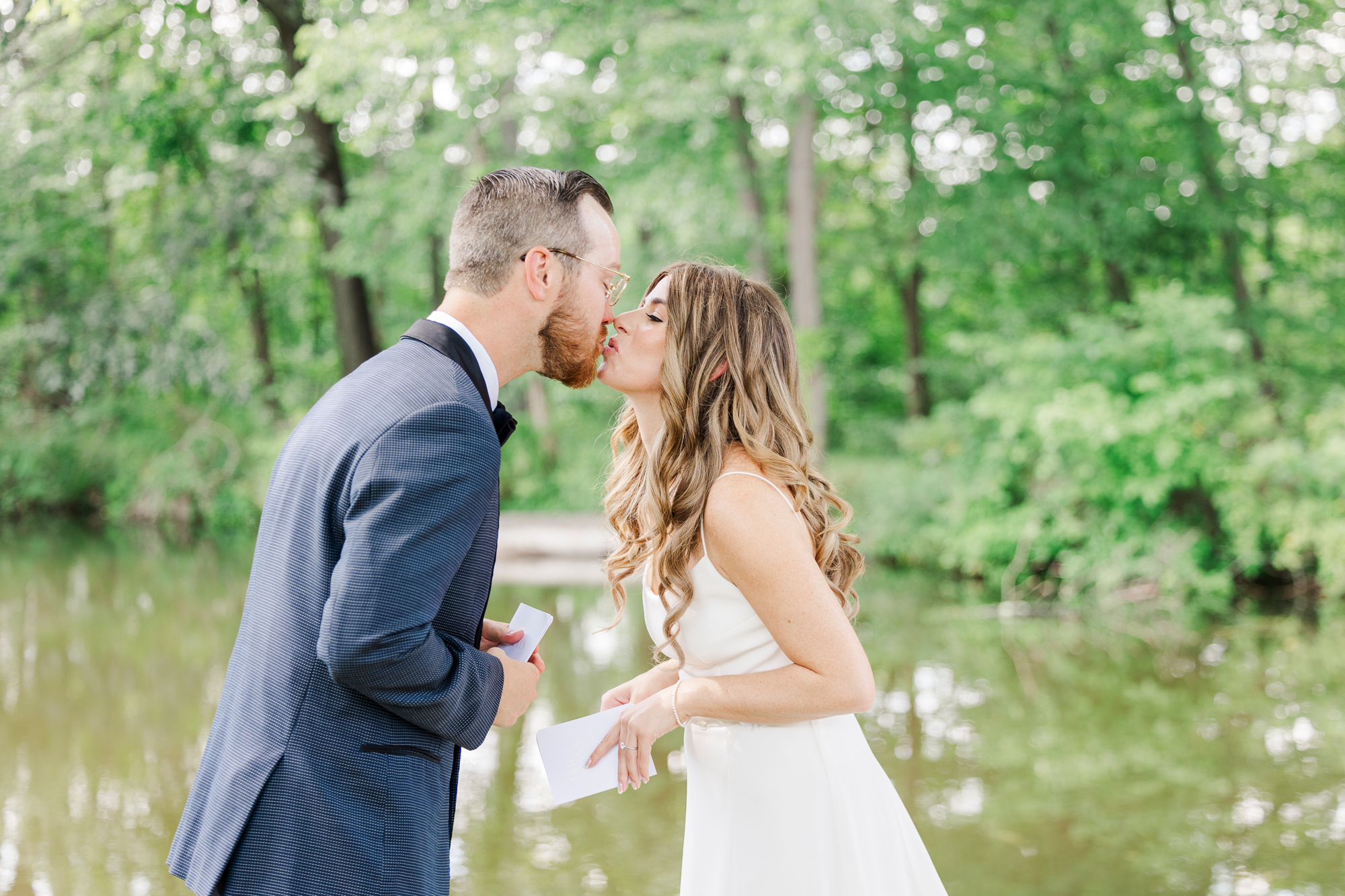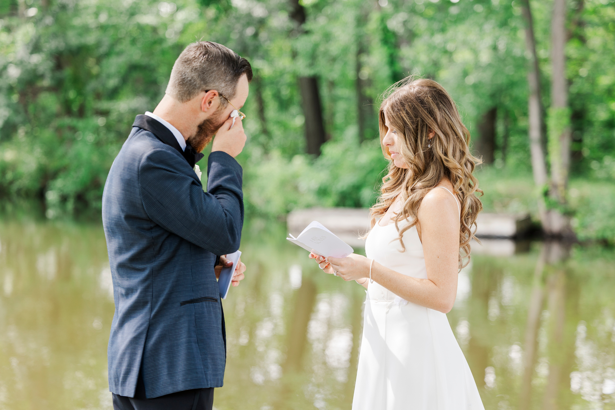 Once they were ready to go, it was time to go to the first look. The team for a Refinery at Perona Farms wedding are super thorough and communicative. It made it easy for us to travel over to the location separately. Alanna and Paul’s first look photos take place at Perona Point, a gorgeous lakeside location. It’s super close to the venue and you can easily access it by golf cart.