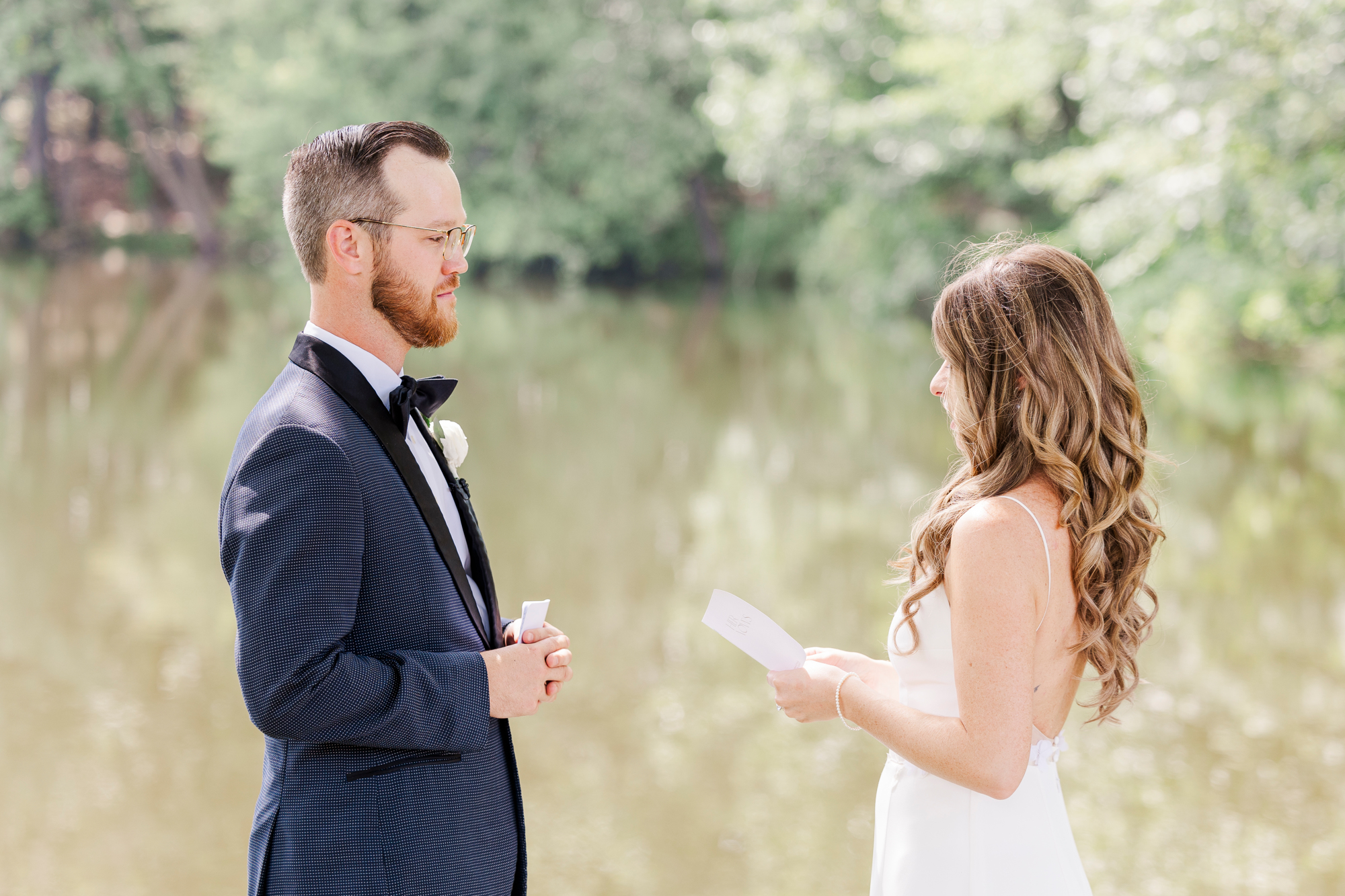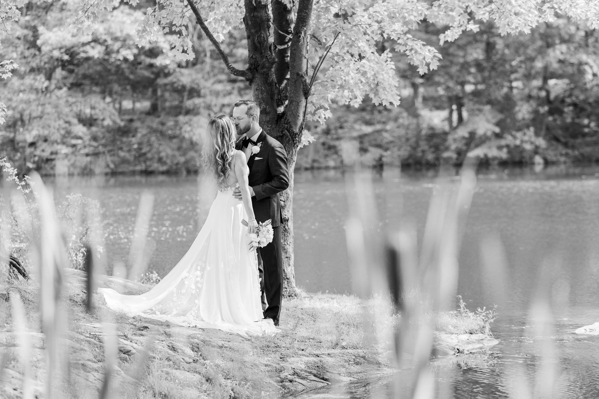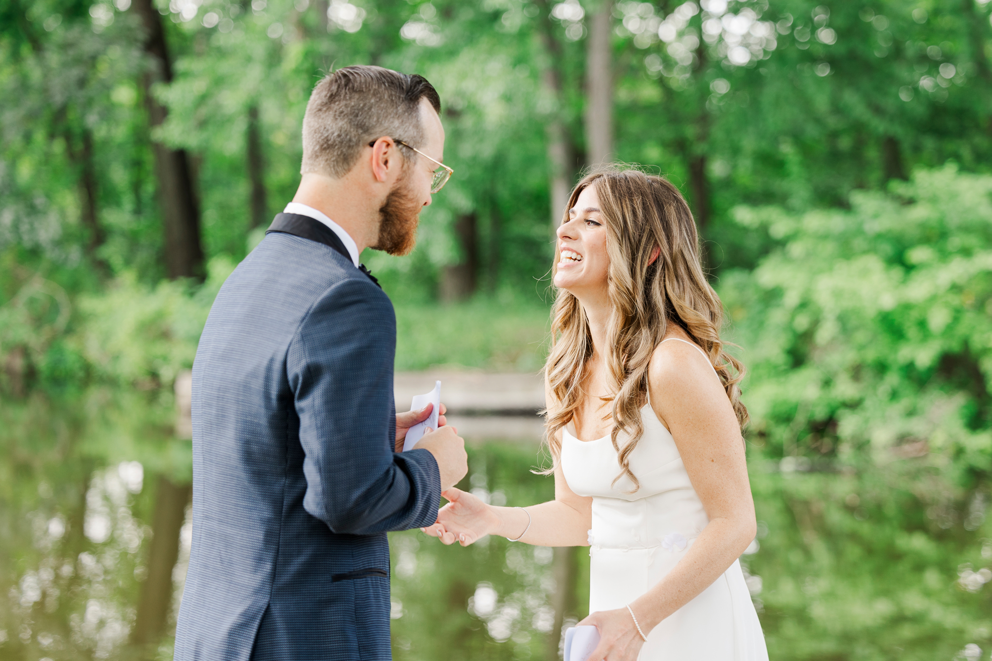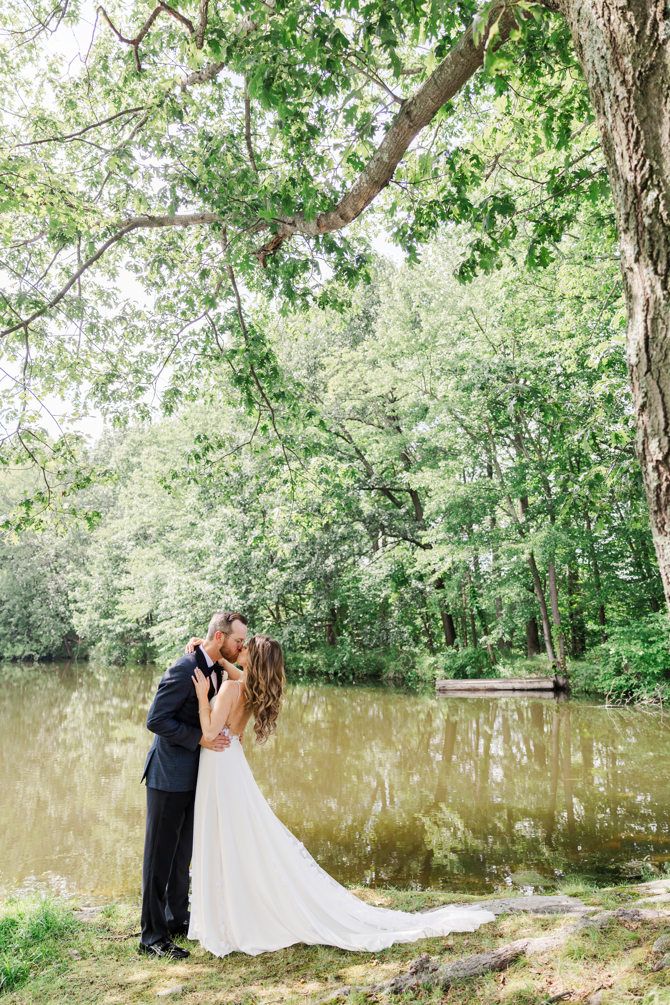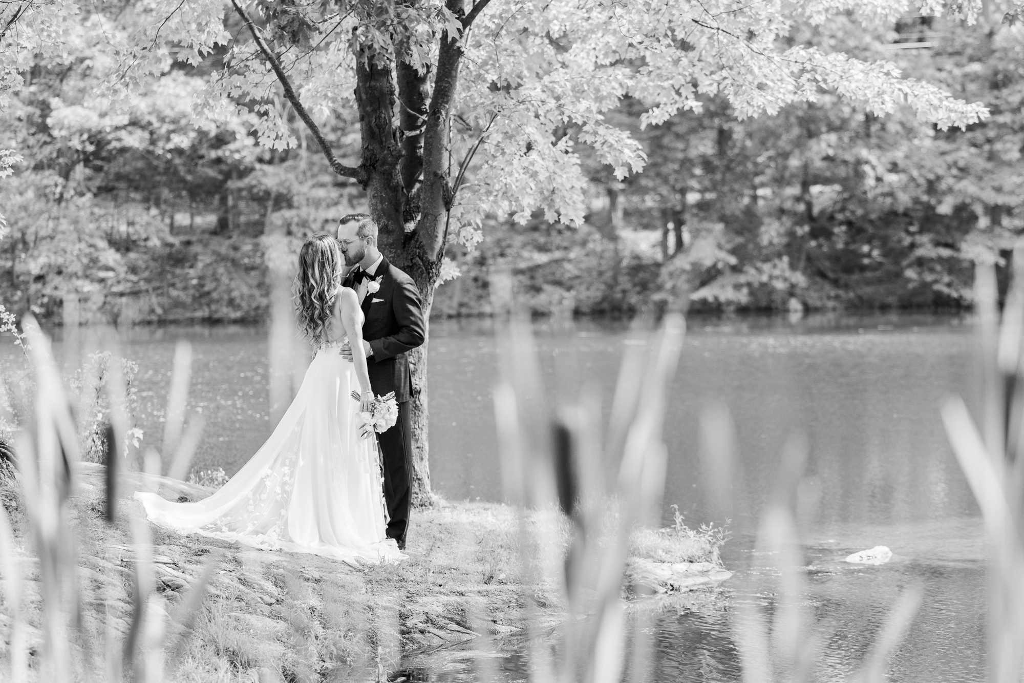 Once they were ready to go, it was time to go to the first look. The team for a Refinery at Perona Farms wedding are super thorough and communicative. It made it easy for us to travel over to the location separately. Alanna and Paul’s first look photos take place at Perona Point, a gorgeous lakeside location. It’s super close to the venue and you can easily access it by golf cart.
