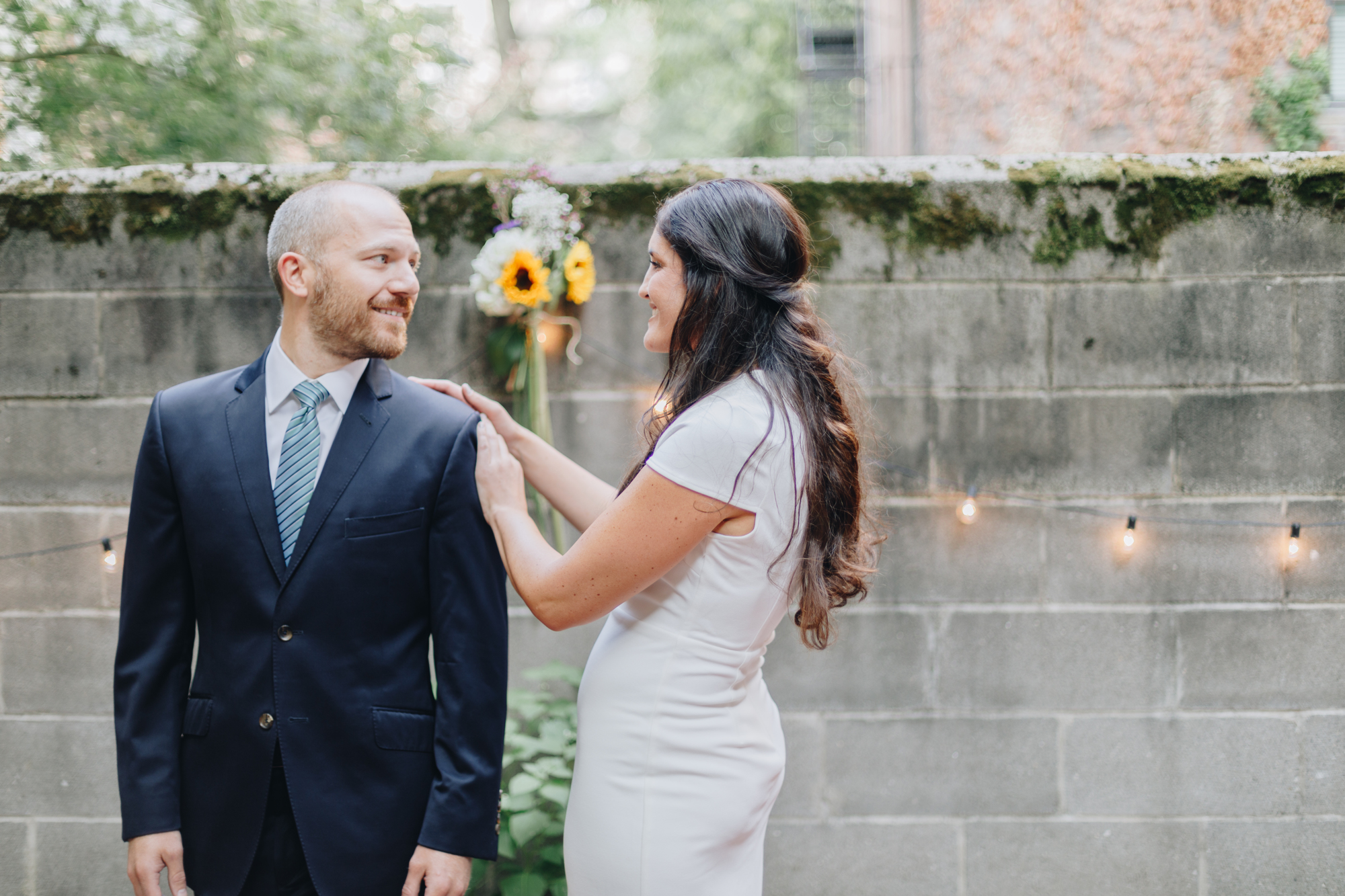The couple transformed their shared outdoor space into a charming wedding setting filled with sunflowers, greenery, and warm string lights. The pops of yellow and white gave the celebration an uplifting, cheerful feel. We love seeing how couples personalize intimate spaces to reflect their story, much like the thoughtful touches we captured in our colorful Hudson Valley micro-wedding with tented backyard.