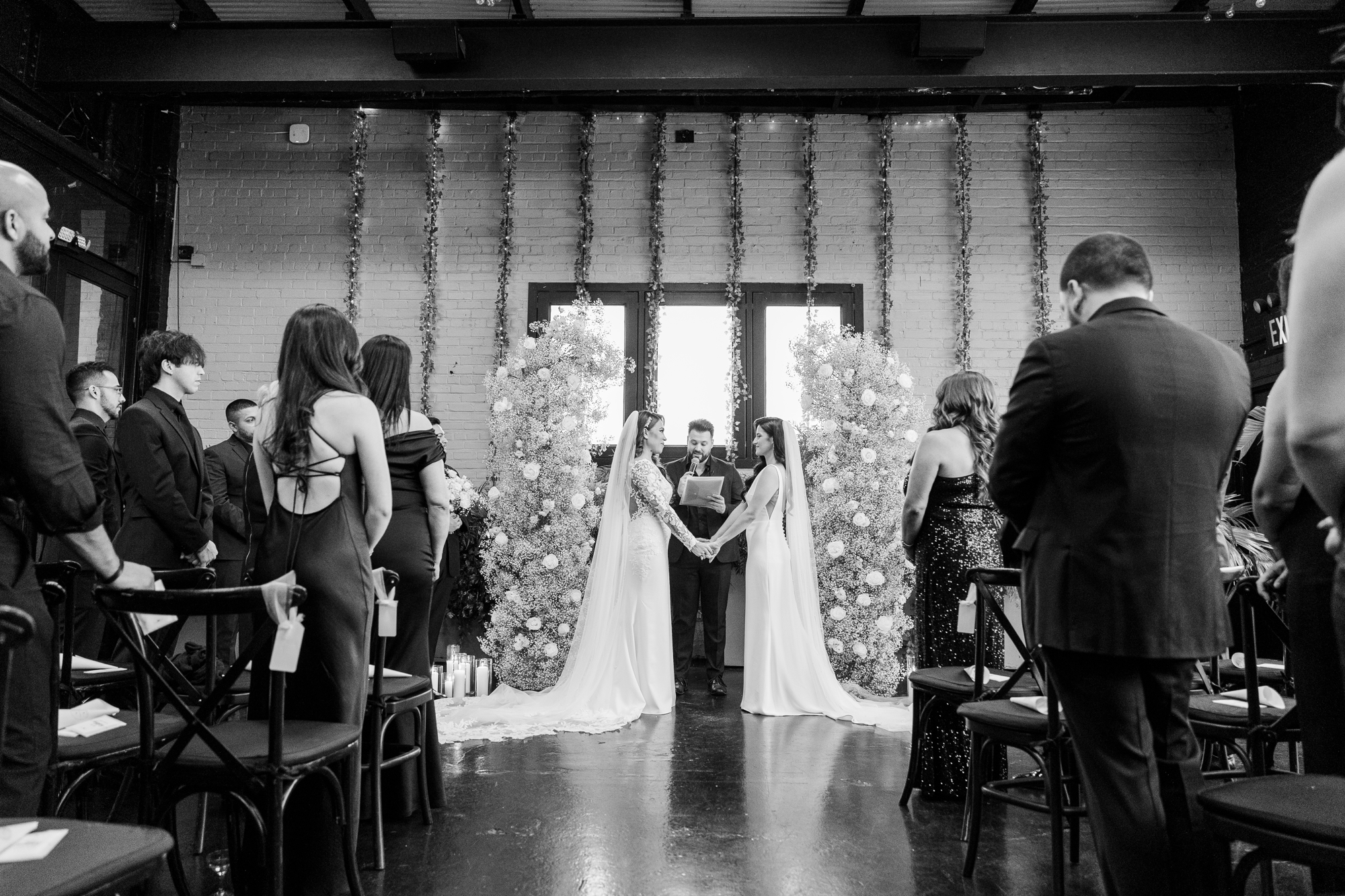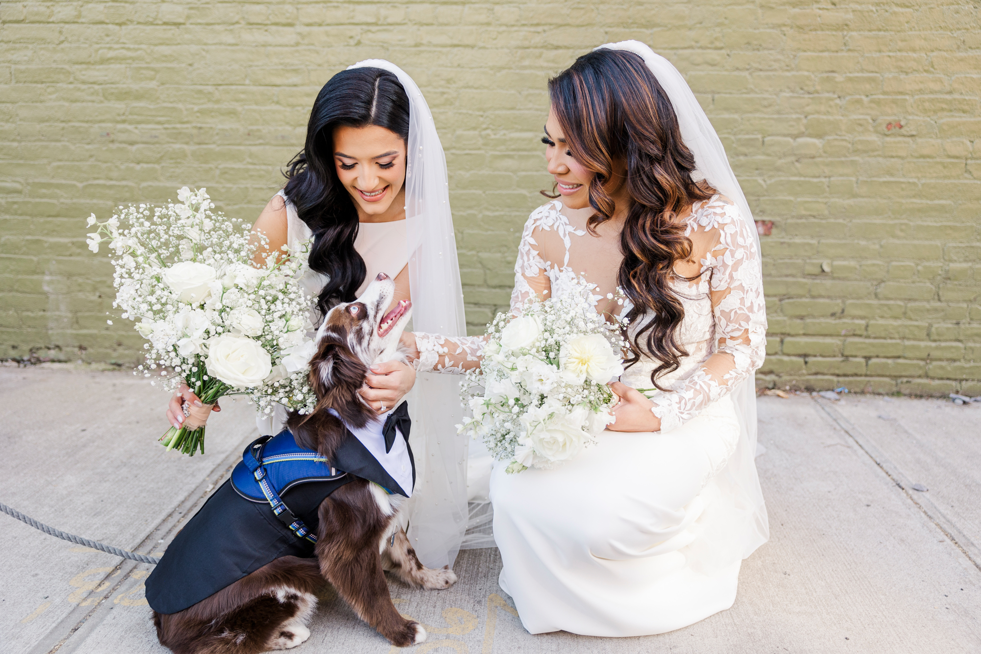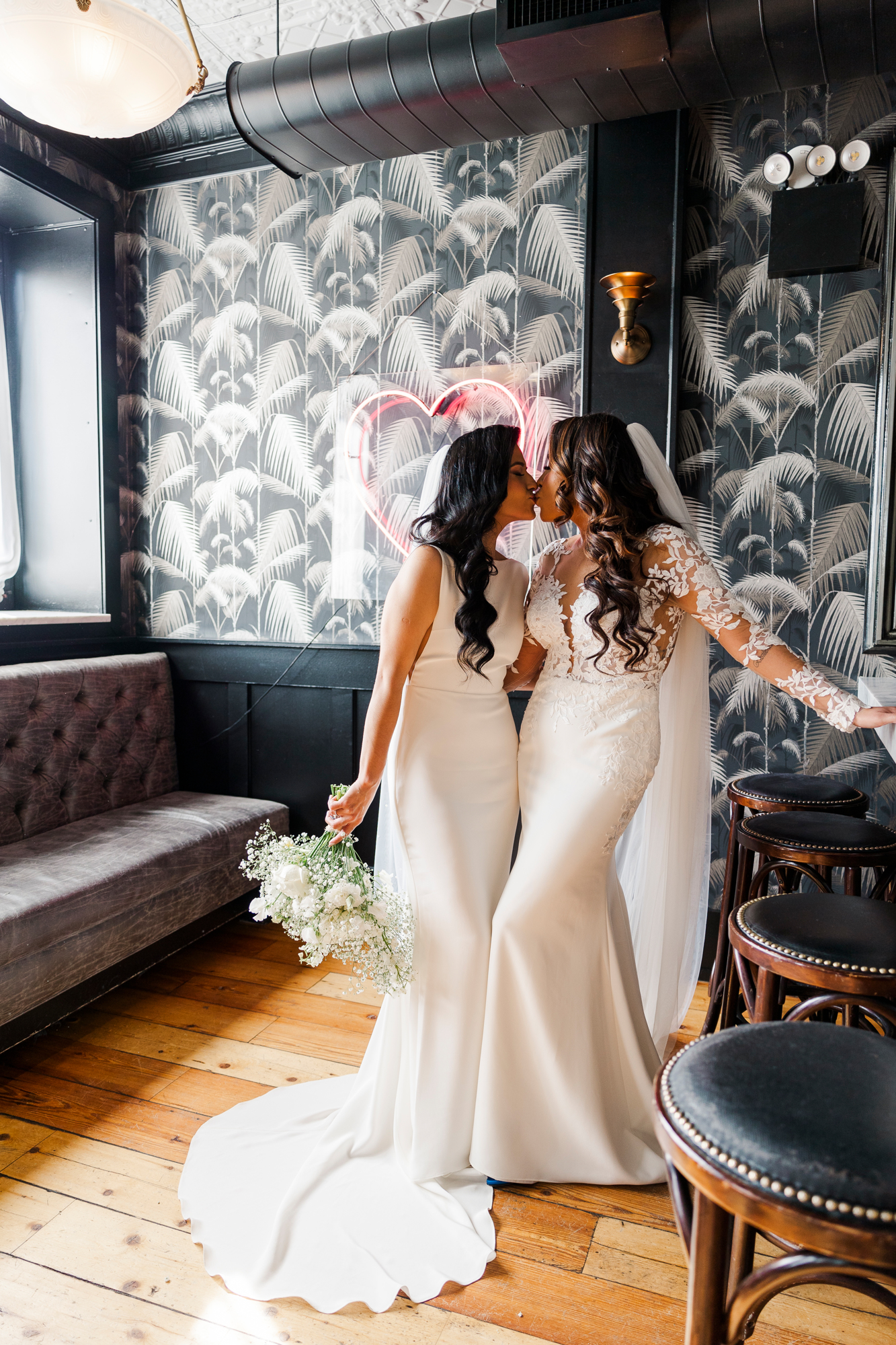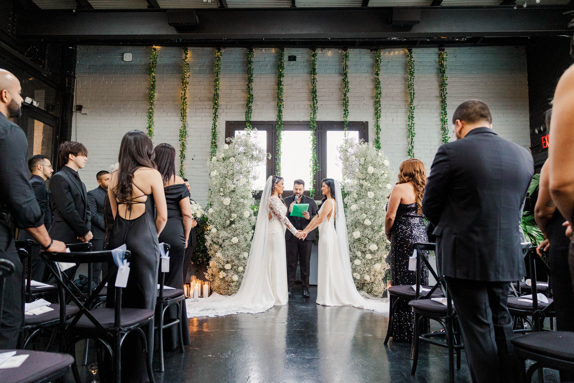 This LGBTQ wedding in Brooklyn featured two gorgeous brides who were so clearly in love. With their dog, Brew, in tow, they had an adorable and intimate wedding day. The two brides were married with an intimate group of family and friends in attendance. This ceremony space is great to accommodate weddings in any season, and you can get great photos indoors for the whole day.