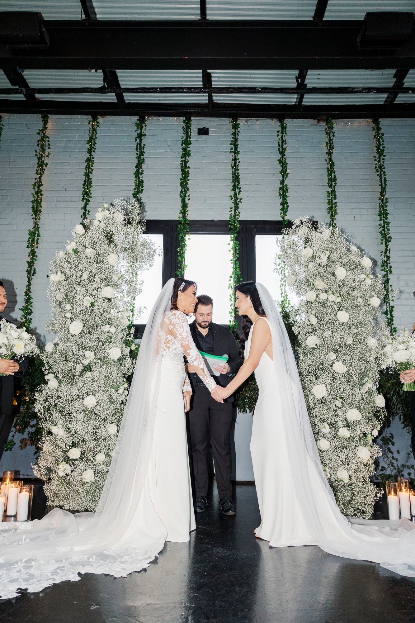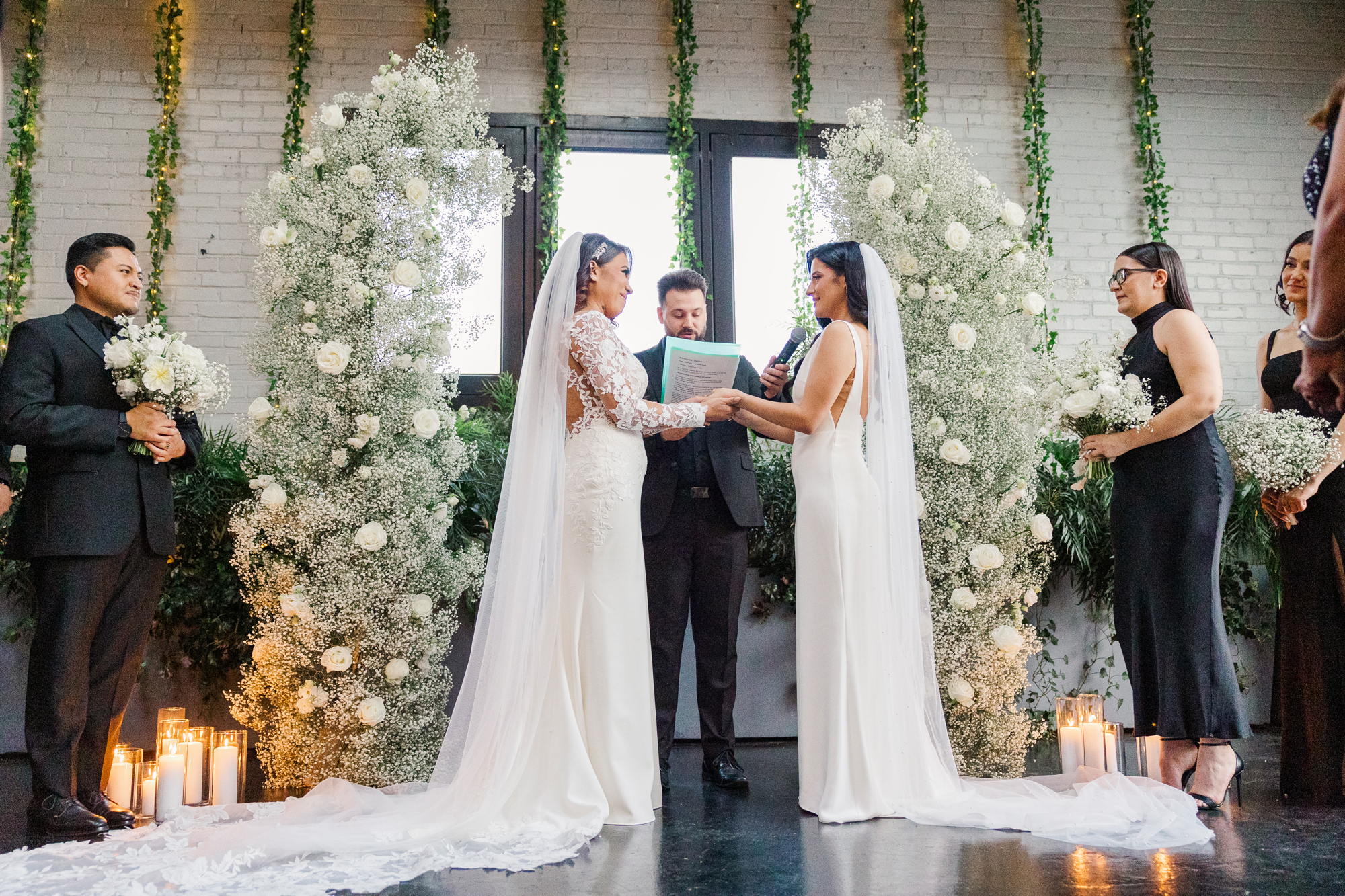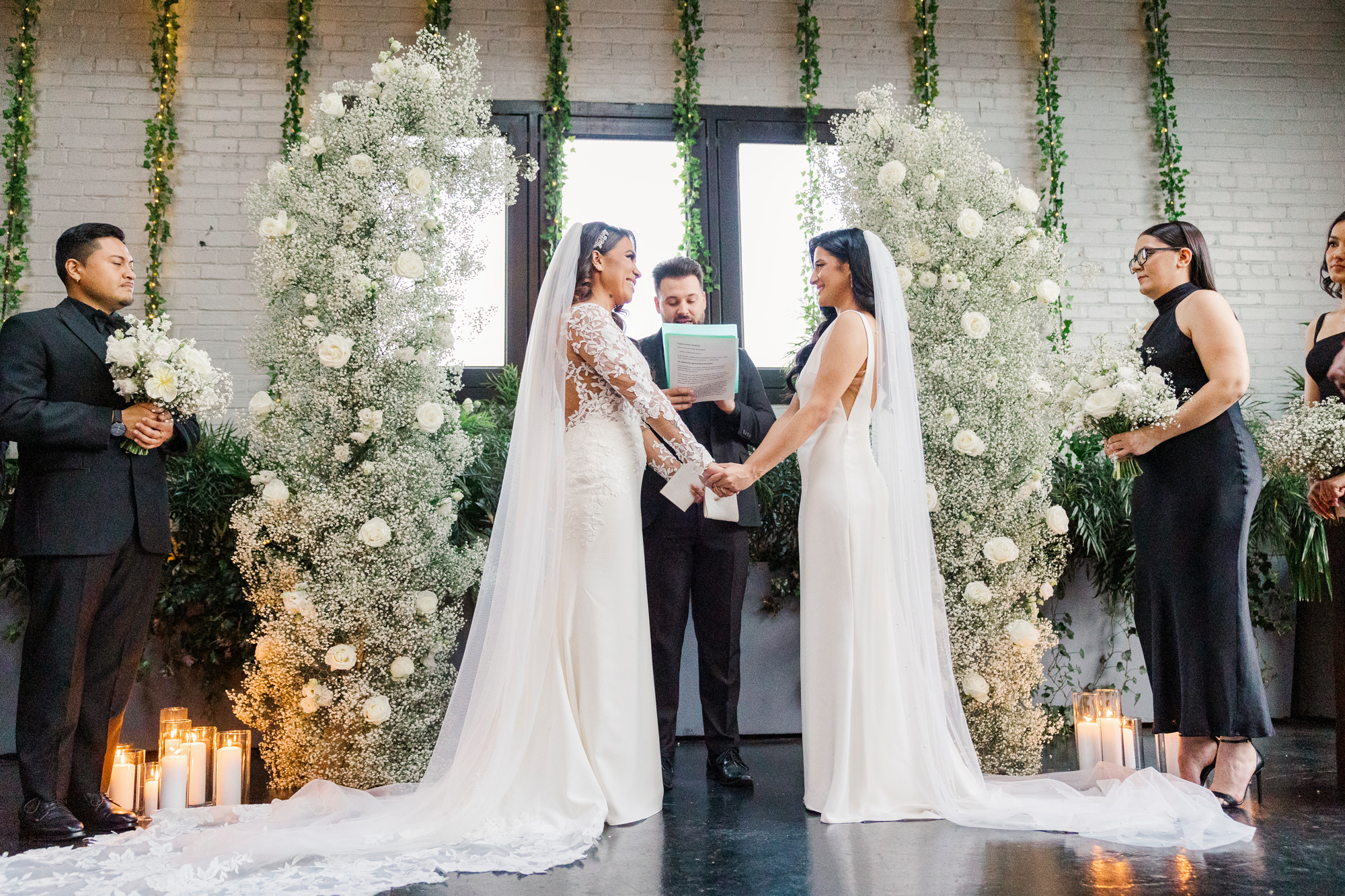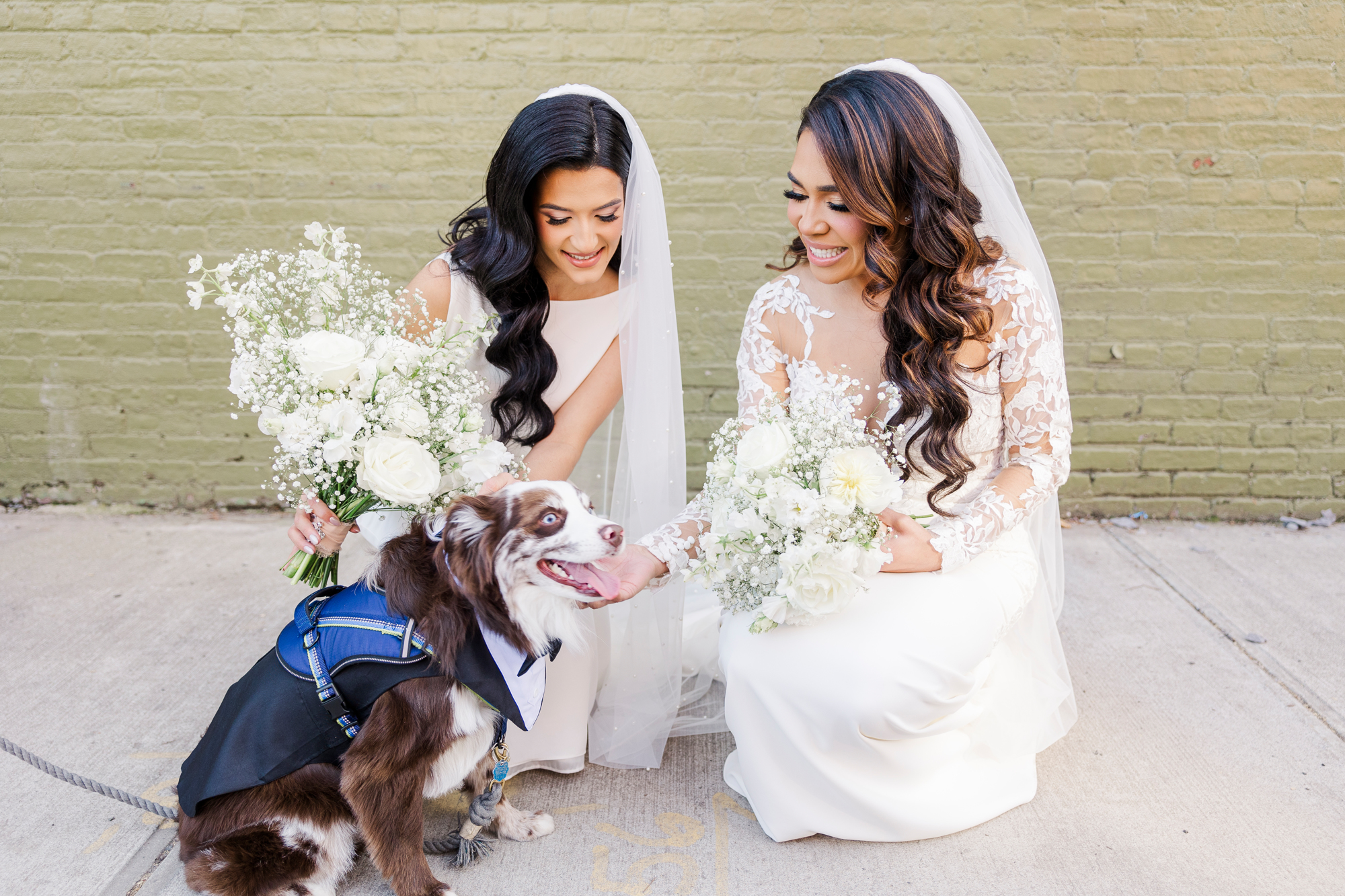 This LGBTQ wedding in Brooklyn featured two gorgeous brides who were so clearly in love. With their dog, Brew, in tow, they had an adorable and intimate wedding day. The two brides were married with an intimate group of family and friends in attendance. This ceremony space is great to accommodate weddings in any season, and you can get great photos indoors for the whole day.